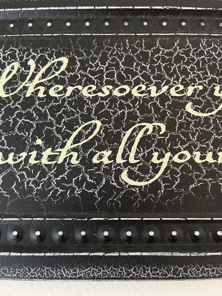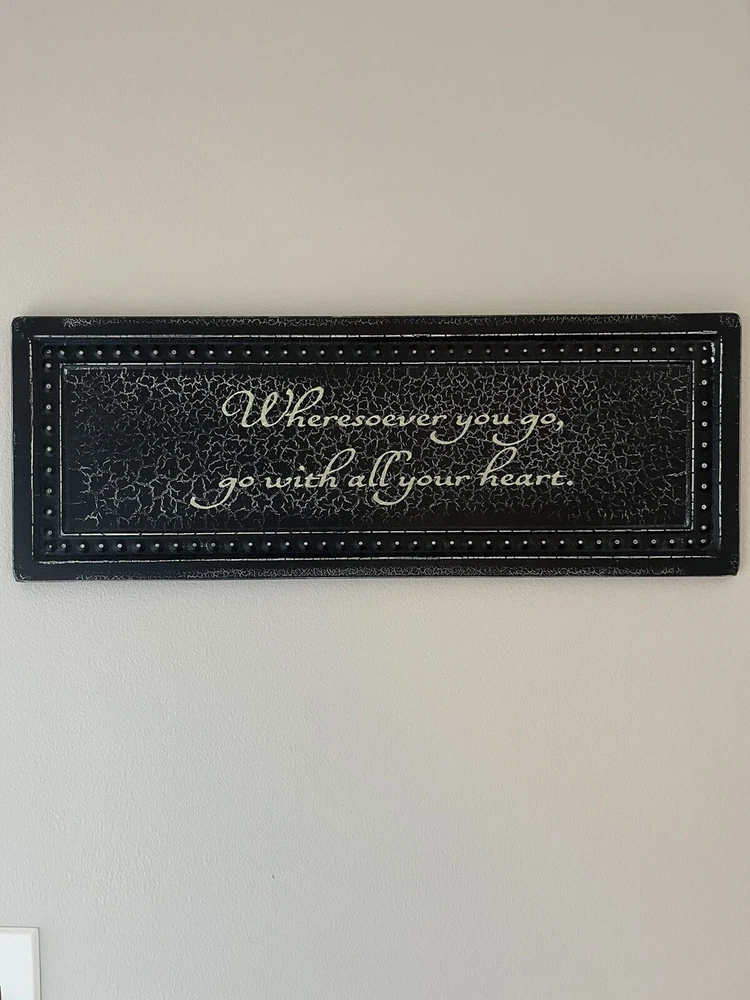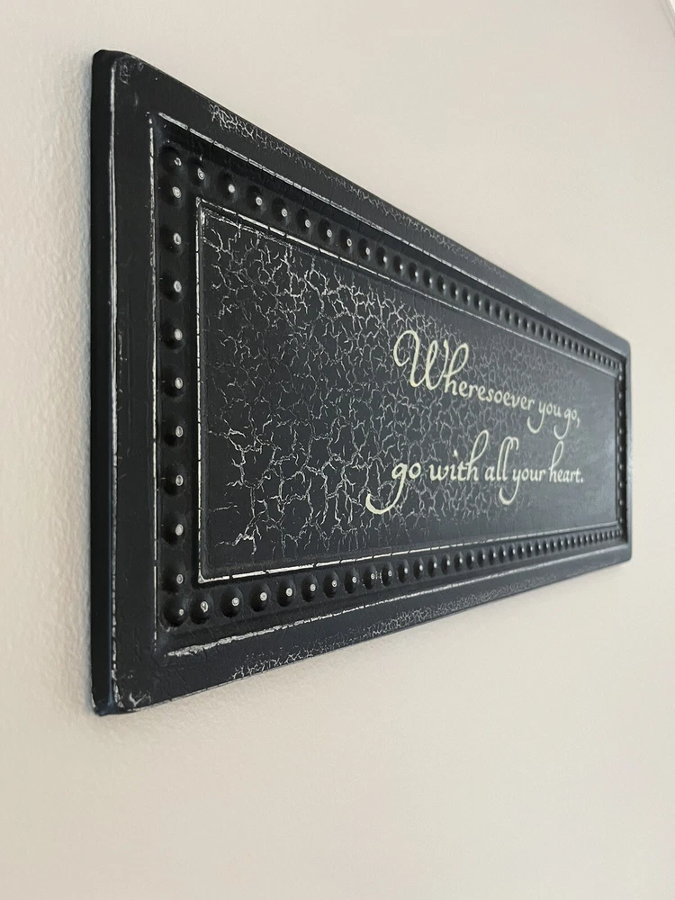 Add a rustic touch to your home decor with this black and gold metal sign from DCWV Home. The rectangular plaque features the quote "Wherever you go, go with all your heart" in a beautiful farmhouse style font. The distressed and metallic finish gives it a unique look that will complement any room in your house. 8 x 22 Black and gold