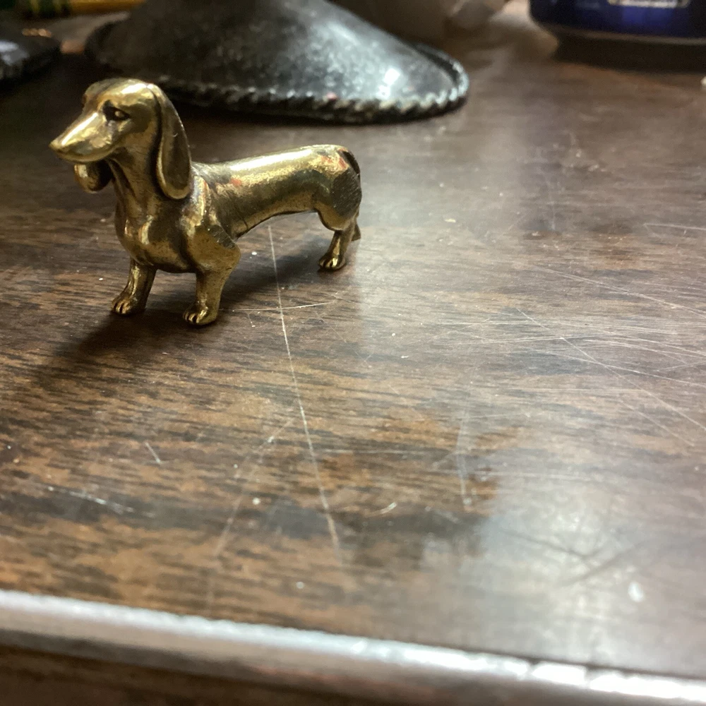 This is a small figurine of a Dachshund, also known as a wiener dog. It is made of brass or metal, but the exact material is unsure. The figurine is handmade and could be a collectible item for those who love Dachshunds.