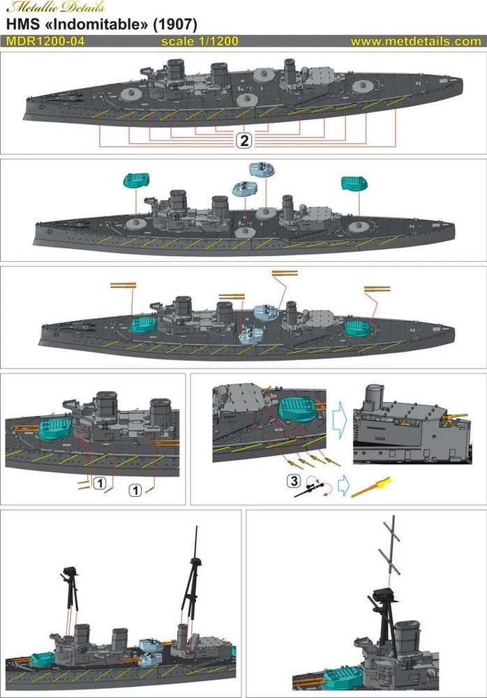 Set contains photoetched and 3D-printed parts for detailing of ship model "HMS Indomitable" in scale 1/1200. Take your ship modeling project to the next level with the Metallic Details MDR1200-04 detailing kit. This comprehensive set includes photoetched and 3D-printed parts meticulously designed for the 1:1200 scale HMS Indomitable ship model. Product Features: Scale: 1:1200 Manufacturer: Metallic Details Country of Origin: Ukraine Condition: New in Box Features: Kit Products: Photoetch, 3D-printed Advantages: High-quality photoetched and 3D-printed parts Detailed and realistic design Easy to assemble Perfect for adding detail to your HMS Indomitable model ship The parts are made from high-quality photoetched and 3D-printed material and are designed to be easy to assemble. With this set, you can add the level of detail and realism to your HMS Indomitable model ship that you've always wanted. Order your 1:1200 scale photoetched and 3D-printed parts set for HMS Indomitable Model Ship today!