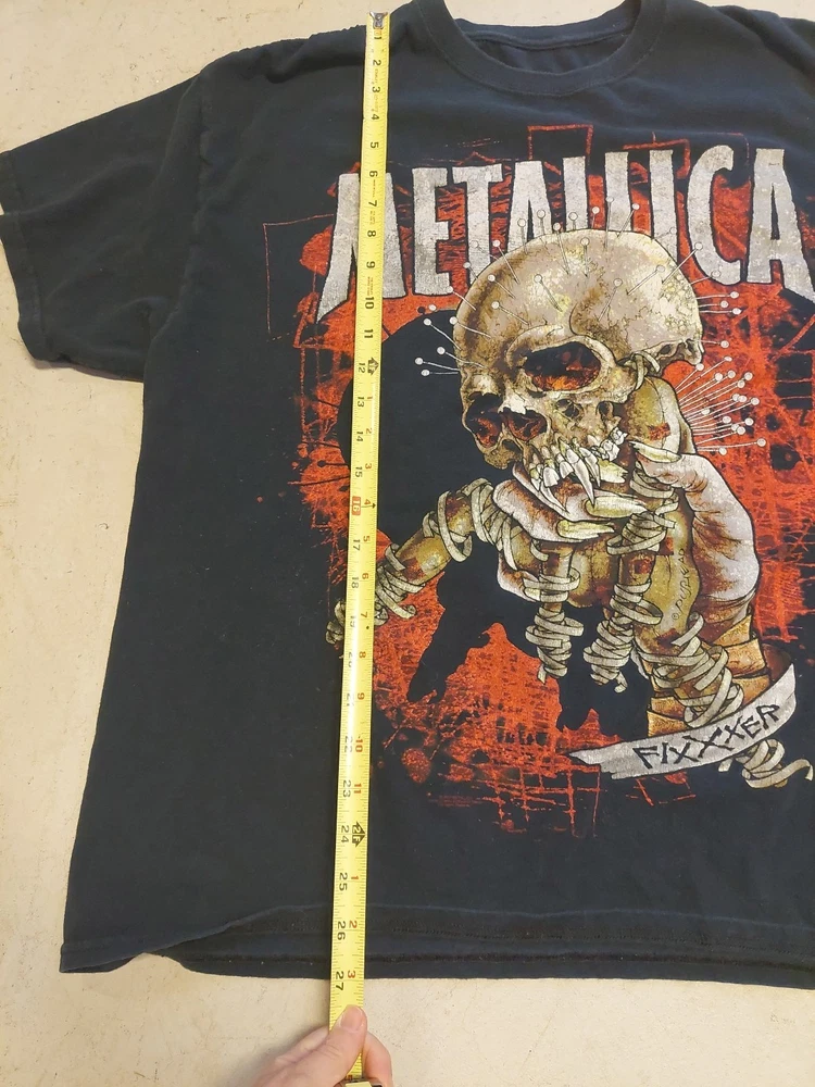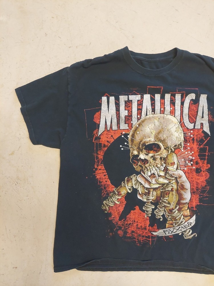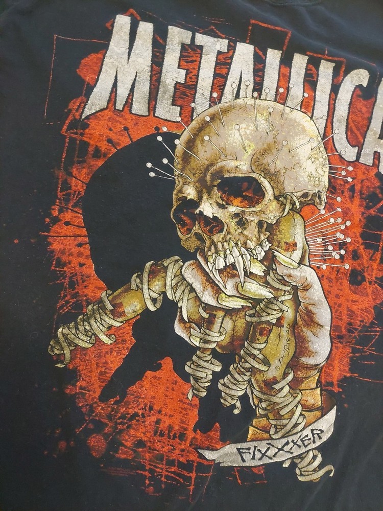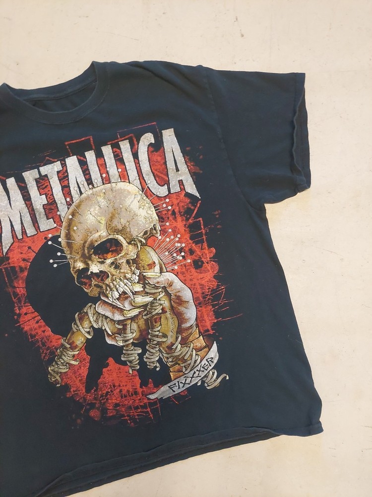 The Metallica Fixxxer T-Shirt is a black cotton band tee featuring the logo of the iconic rock band Metallica. This officially licensed product comes in size XL with a crew neckline and short sleeves, making it a perfect addition for any rock music fan. The lightweight and breathable fabric ensures comfort for all seasons, while the graphic print adds a touch of heavy metal style. With free tracked shipping and no-quibble returns, this shirt is a must-have for any fan looking to rock out in style. I think it's a large or xlarge, but tag ripped off so check measurments Smoke free home