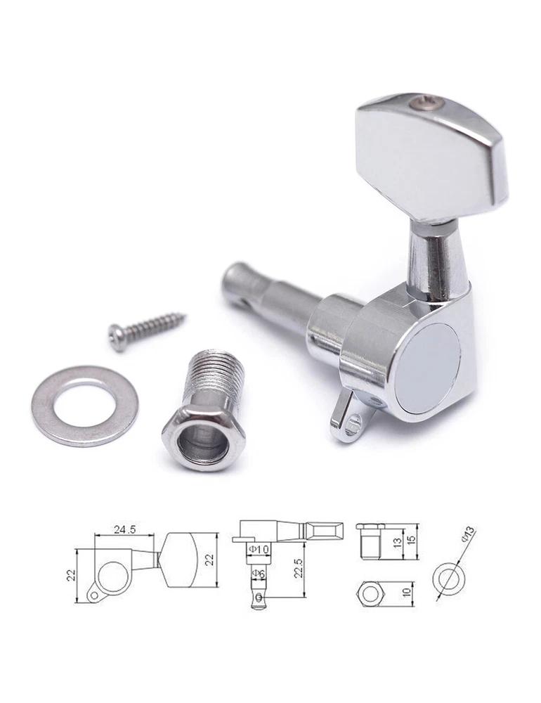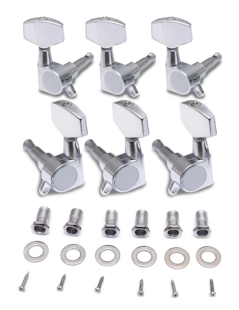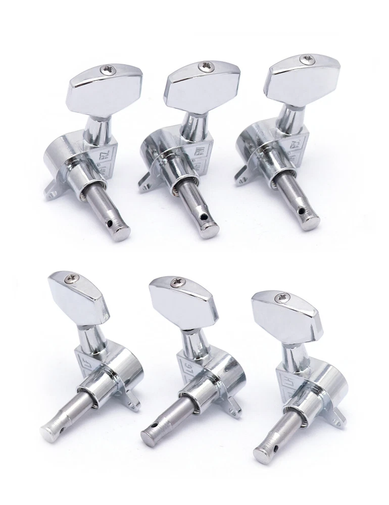 Product description Color: Chrome Material: Zinc alloy Gear Ratio:1:14 Tunning peg hole Diameter: Φ6mm Ferrule hole diameter: Φ10mm Electric Guitar Die-cast Tuning Machines with 45° screw hole Please check the dimension carefully before place order. Package Include 1 x Set Tuning Pegs(3R3L) 6 x Ferrules 6 x Screws 6 x Washers Metallor Parts is a branch of Sunsmile Group, which has had over 20 years of experience in the musical instrument field. We are the leading company in China that can supply a full range of guitar parts, such as hardware, pickups and pickguards etc. Our precise production equipment and experienced staff assure you of the finest quality parts. Cooperating with guitar manufactures, our parts are widely used on famous guitars. Musicians, repairers, luthiers and factories deserve Metallor's quality parts and professional service.