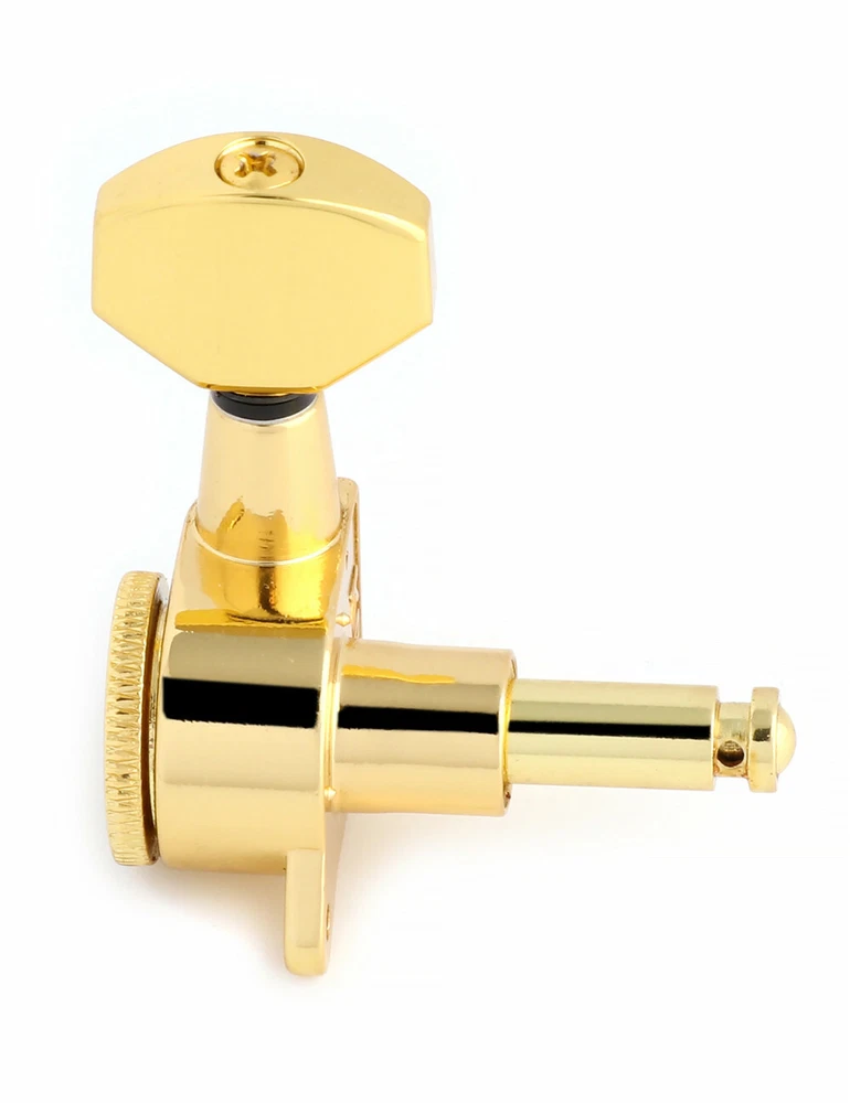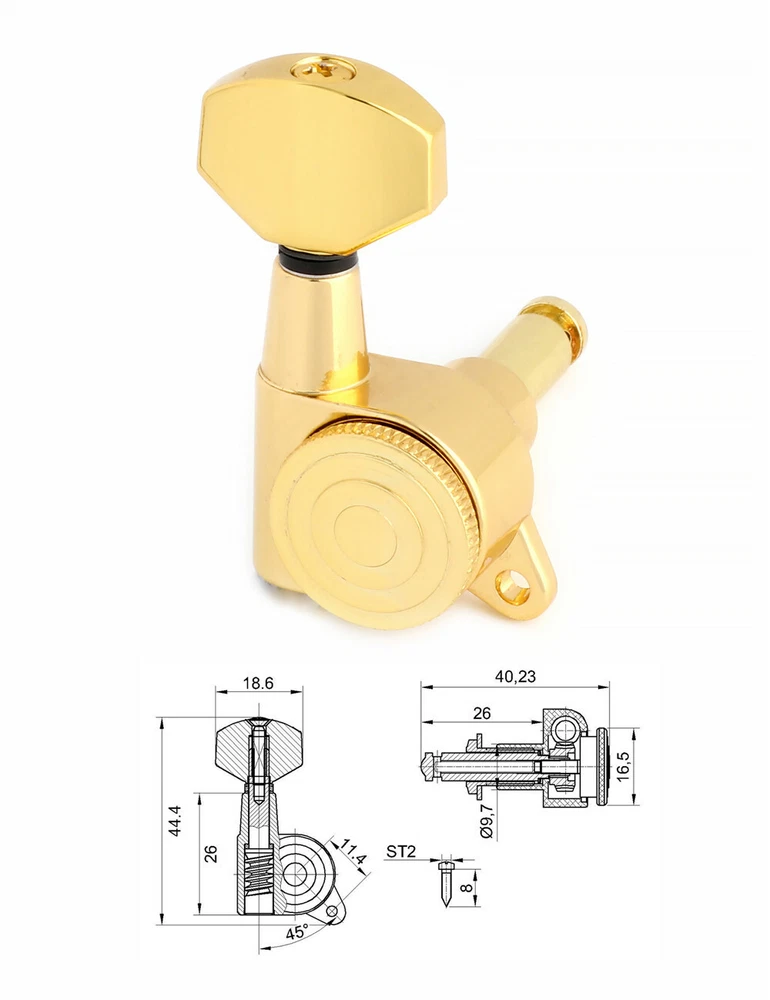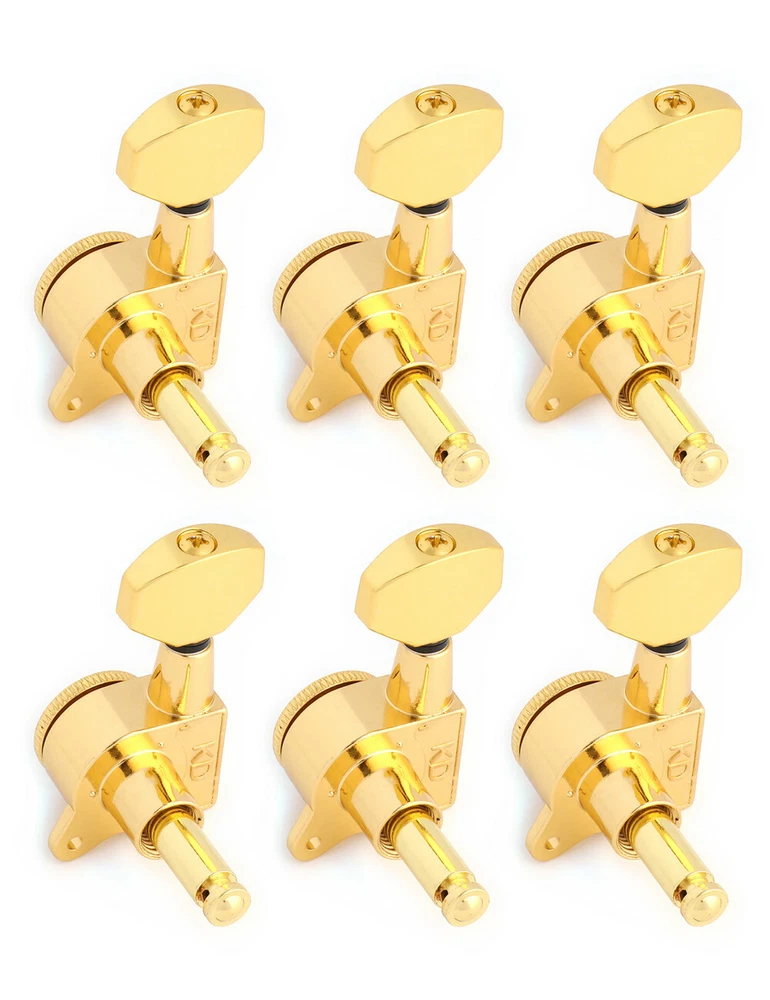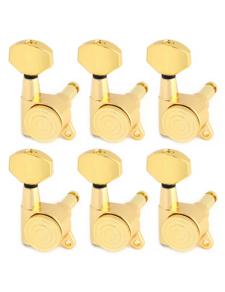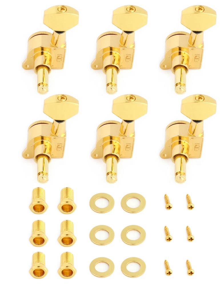 Product description Color: Gold Material: Zinc alloy Gear material: Copper Gear ratio: 1:14 Fit for Strat Tele Guitar, Please check the dimension carefully before place order. Package include 6 x Locking Machine Heads in line(Right Hand) 6 x Ferrules 6 x Screws 6 x Threaded bushings Metallor Parts is a branch of Sunsmile Group, which has had over 20 years of experience in the musical instrument field. We are the leading company in China that can supply a full range of guitar parts, such as hardware, pickups and pickguards etc. Our precise production equipment and experienced staff assure you of the finest quality parts. Cooperating with guitar manufactures, our parts are widely used on famous guitars. Musicians, repairers, luthiers and factories deserve Metallor's quality parts and professional service.