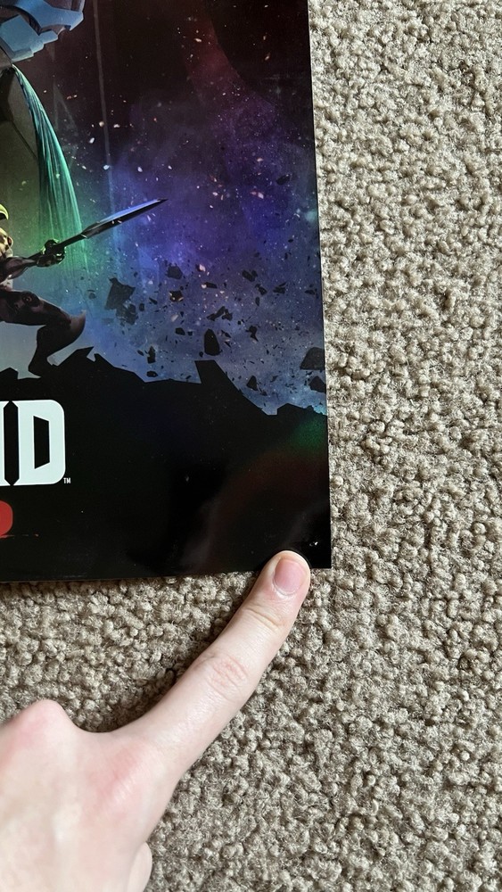This is a set of two holographic posters of Metroid Dread that were sold for a limited time on the MyNintendo website, redeemable with platinum points. They are in fantastic condition, with the only signs of use being small pin holes in the corners of the posters, see the second picture for an example.