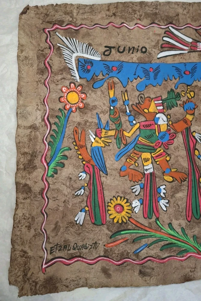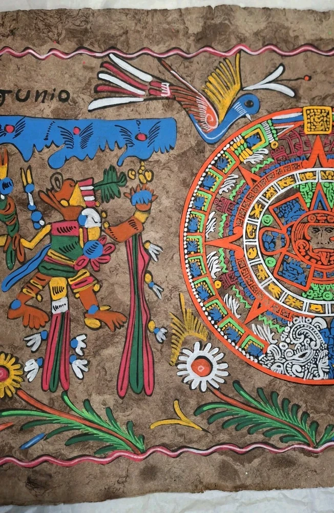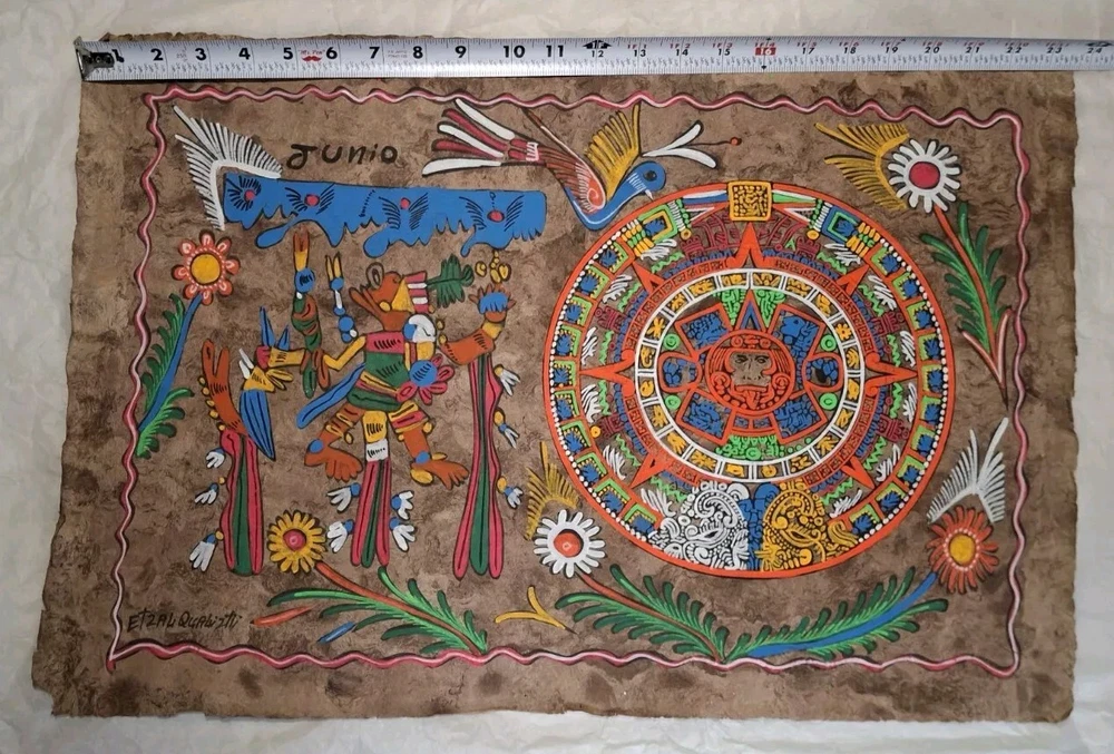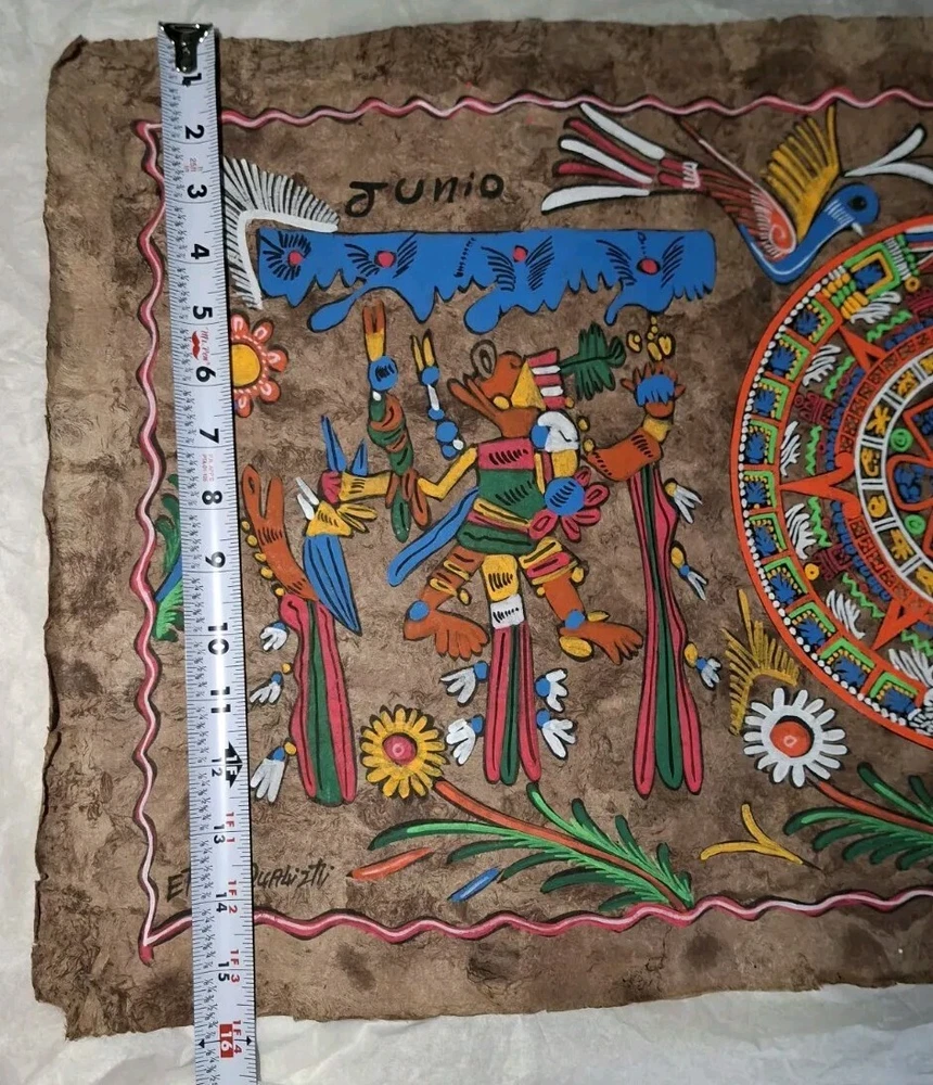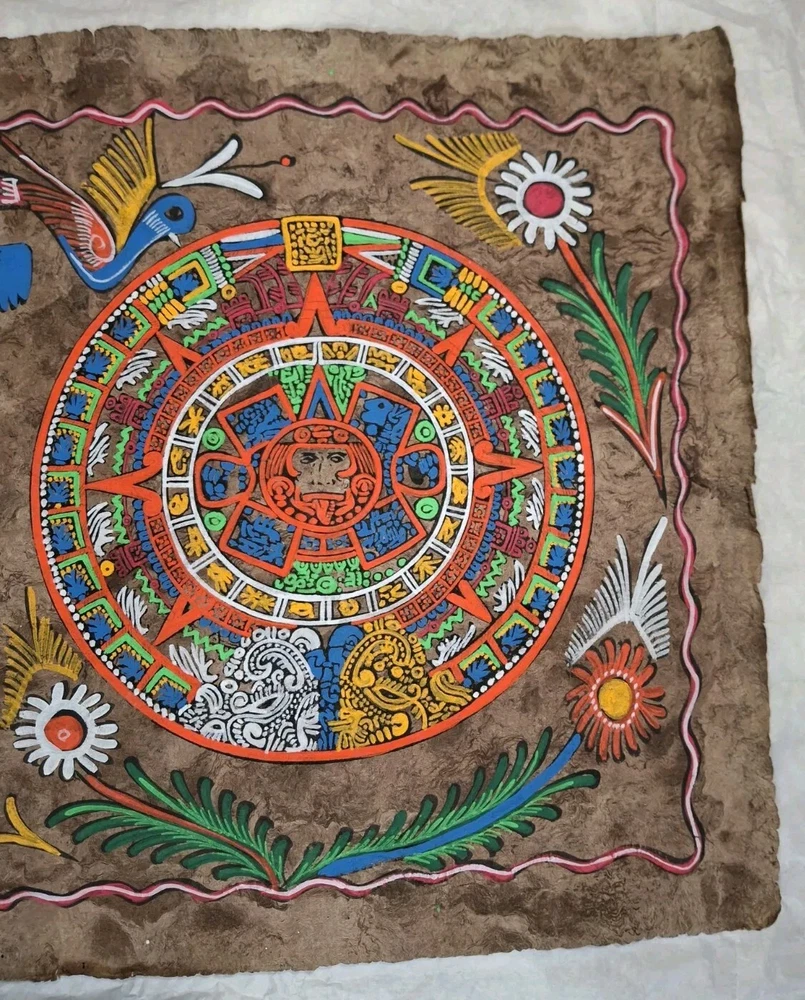 Aztec Zodiac Calendar Junio Folk Art Picture Mexican Bark Paper Painting Mayan See photos for measurements I consider this to be in good preowned condition Please view all photos zooming in on them as they are part of the description for you to judge condition. Will ship gently rolled in a tube