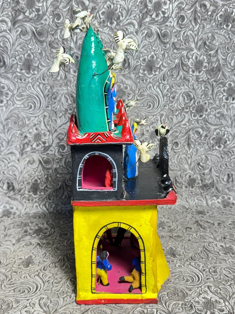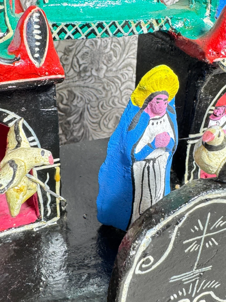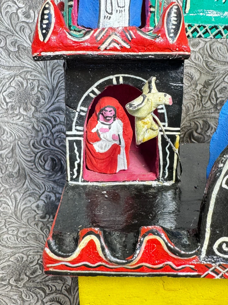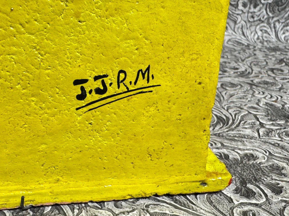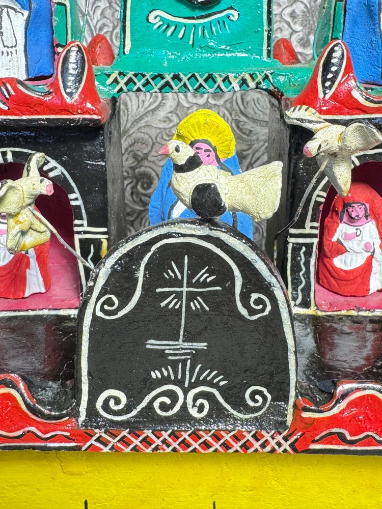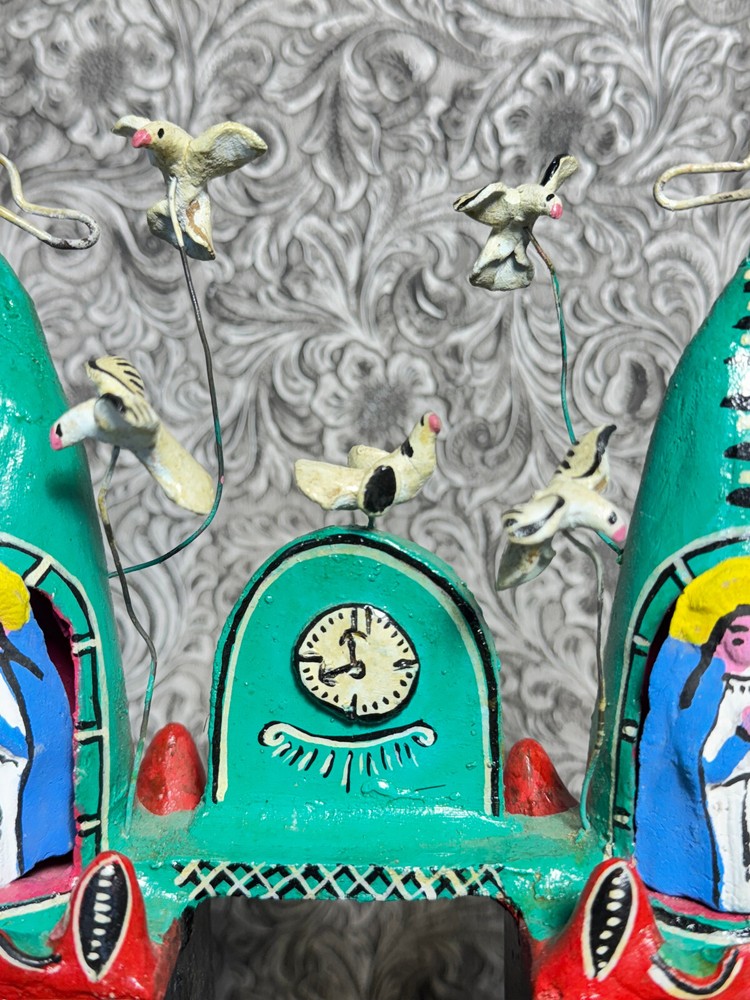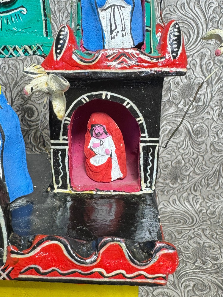 This beautiful Mexican folk art sculpture by Juan Medrano is a stunning piece full of charm and character. The detailed clay figures of Mary and the Sacred Heart of Jesus showcase authentic craftsmanship from Tonalá, Jalisco. Though it has some wear, the artistry shines through, making it a unique treasure for collectors. The size is perfect for display, and the signed back adds to its authenticity. A wonderful addition to any folk art collection!