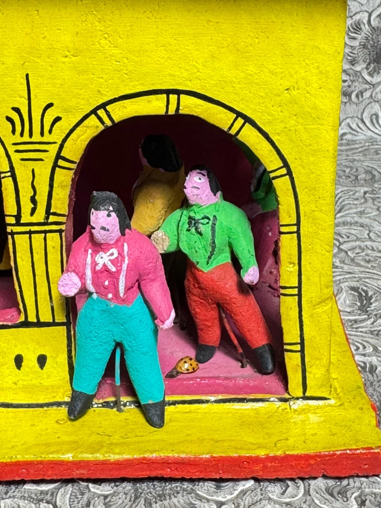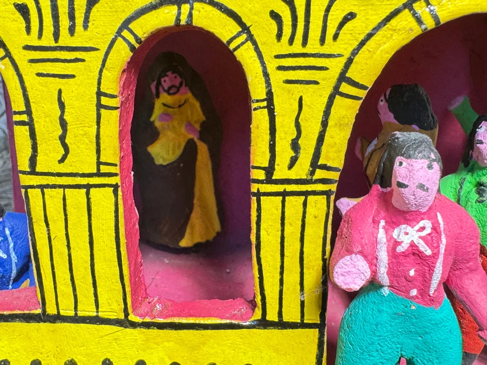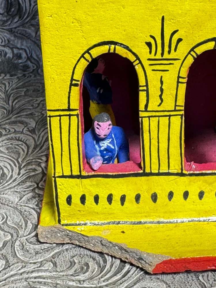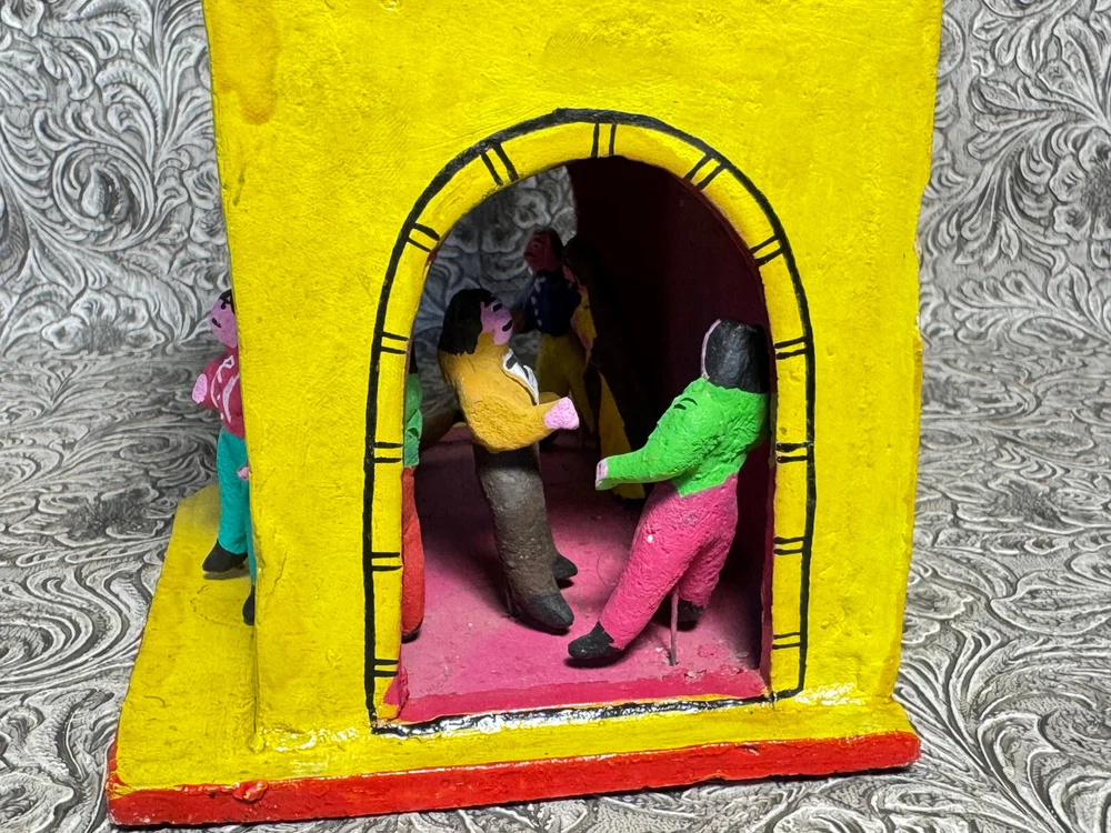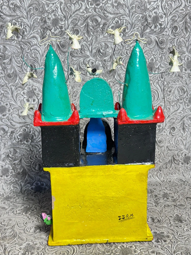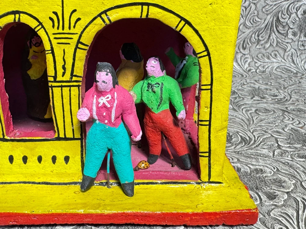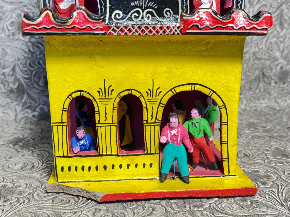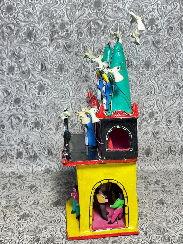 This beautiful Mexican folk art sculpture by Juan Medrano is a stunning piece full of charm and character. The detailed clay figures of Mary and the Sacred Heart of Jesus showcase authentic craftsmanship from Tonalá, Jalisco. Though it has some wear, the artistry shines through, making it a unique treasure for collectors. The size is perfect for display, and the signed back adds to its authenticity. A wonderful addition to any folk art collection!