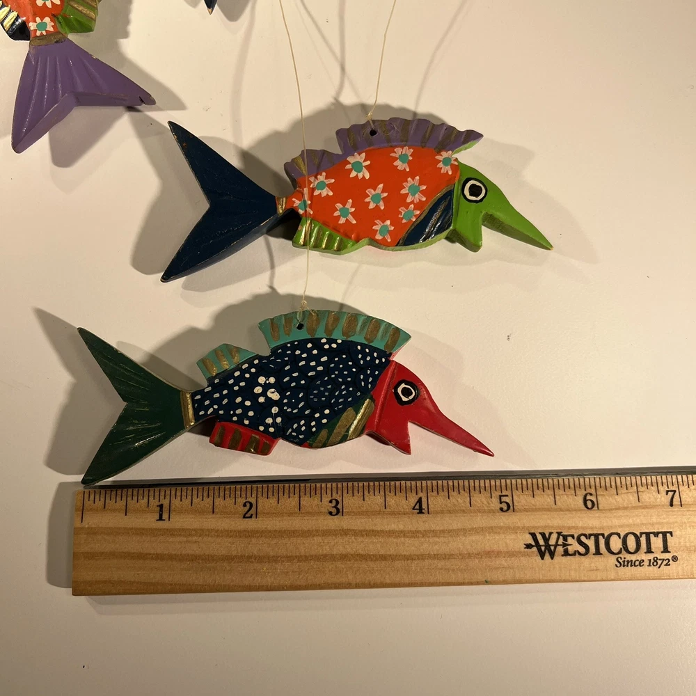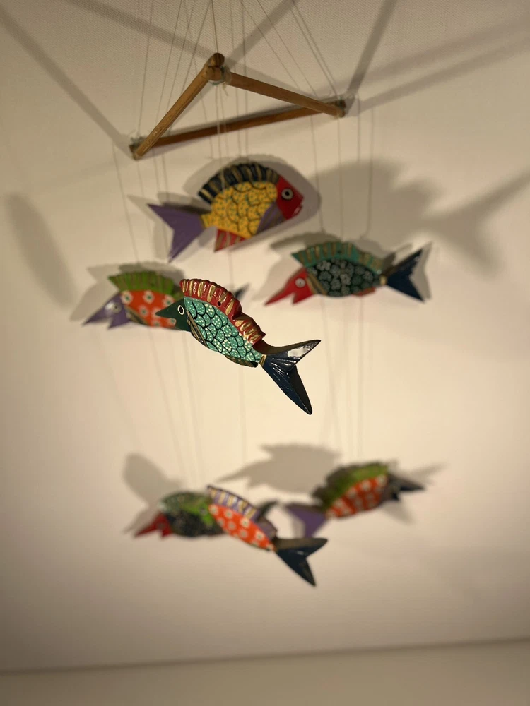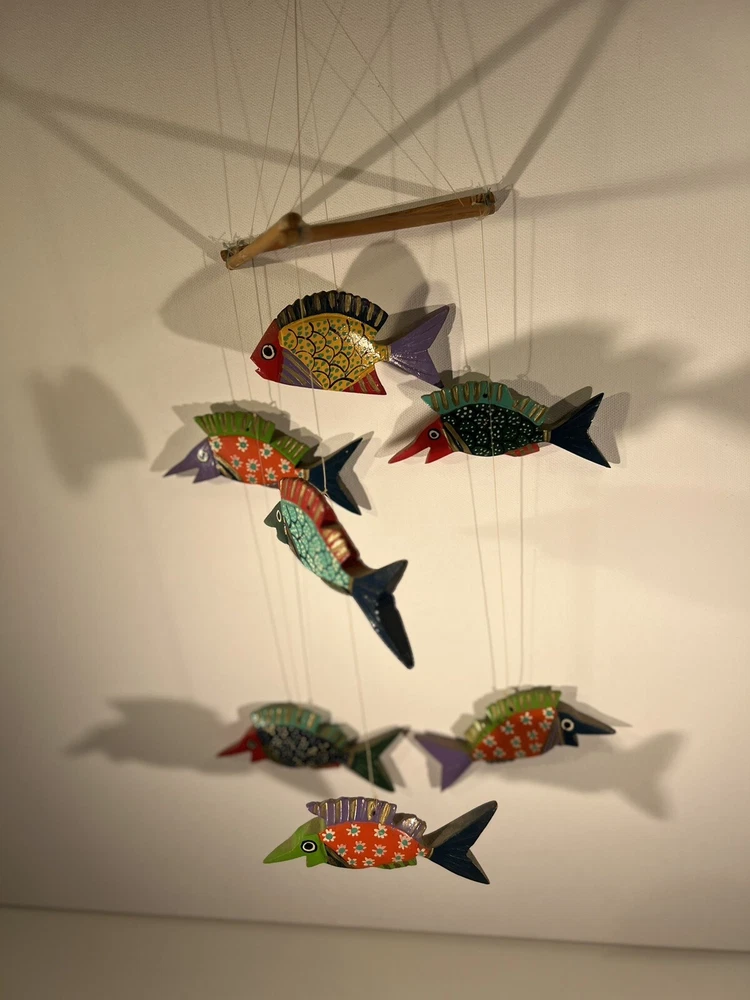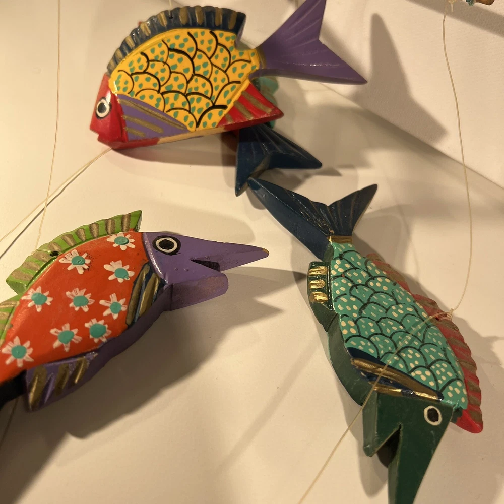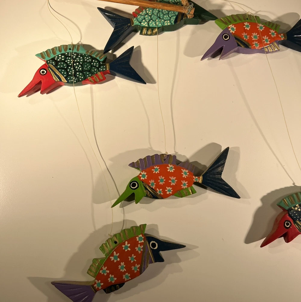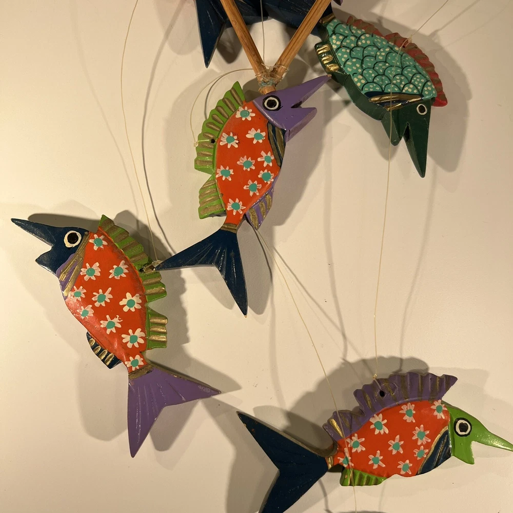Bright, fun, colorful Mexican Folk Art Fish Mobile made of hand-painted carved wood fish. A decorative item that can be hung for a Caribbean beach house vibe, children’s room or any other place to add a touch of sea life, ocean culture to the ambiance. The mobile features several fish figures that are painted in vibrant colors, making it an eye-catching piece of collectible folk art. Beautiful condition, no flaws to note. Please see photos for measurements. Classic. Timeless. Modern.