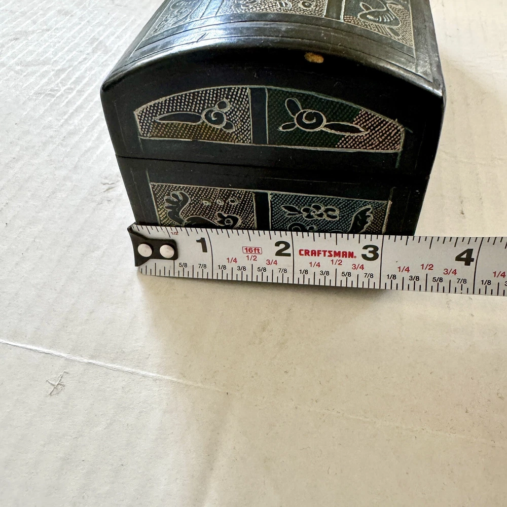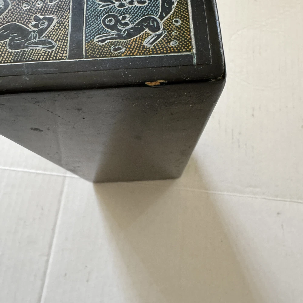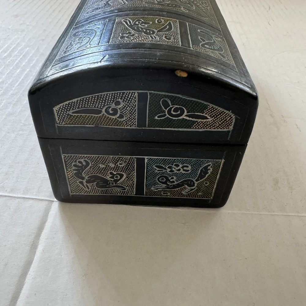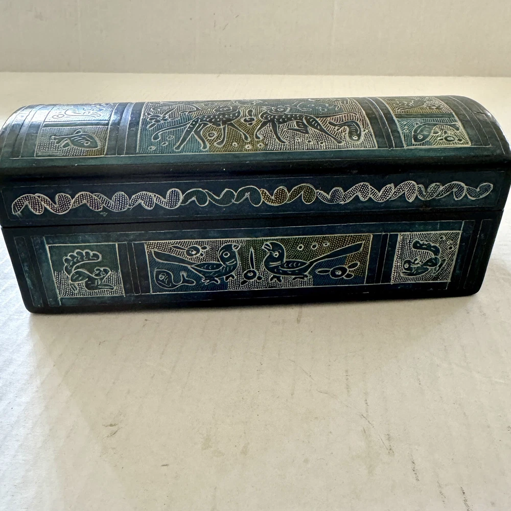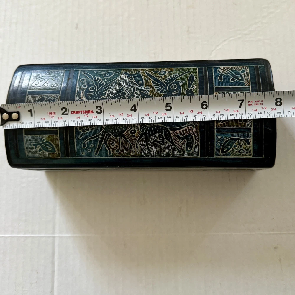 This Mexican Olinala box is a stunning piece of folk art, handcrafted from Linaloe Wood and hand-painted in vibrant colors. The box features intricate designs of green birds and the legendary Chupacabras, making it a unique and wonderful addition to any collection. Chupacabras! It took me awhile to figure that out, but I just sold a wood carved chupacabra from Oxaca, Mexico. There's also parrots and other birds, along with squirrel and fish. The squirrels may be chipmunks!! It's a great box and a great size for storage. It's about 7.5 x 3.25 x 3.25 inches. Important: There are three small spots of missing lacquer as shown in the photos. It would be easy to cosmetically repair these three little spots if you want to. Thank you!