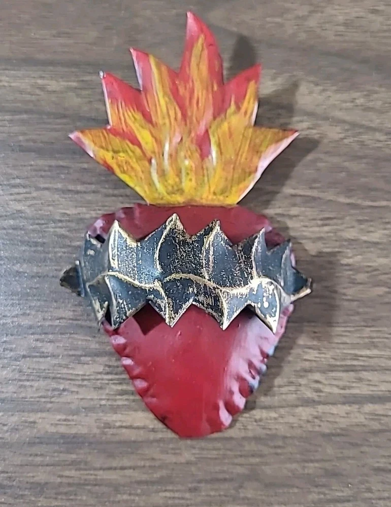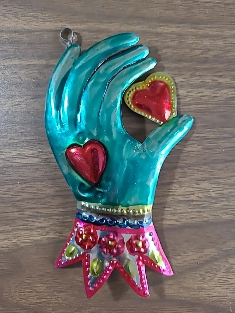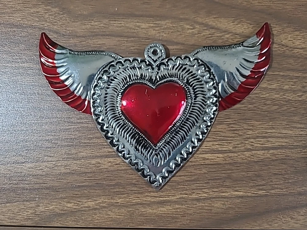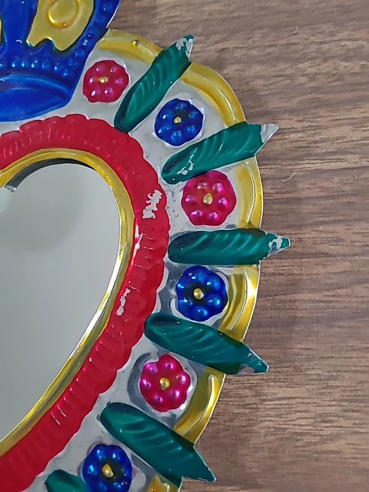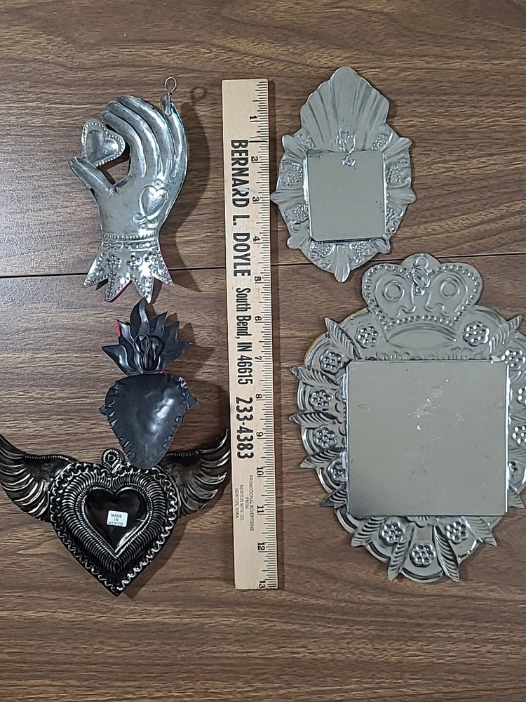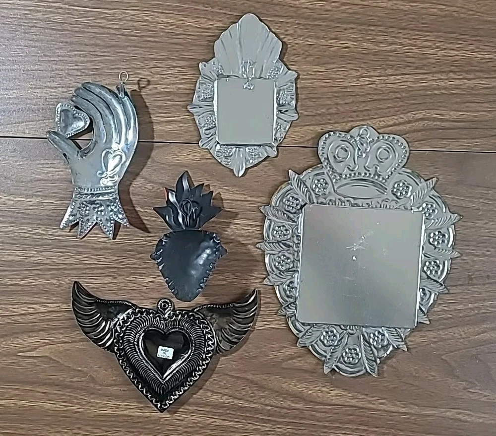 Set includes 2 mirrors - large measuring 8.5" long x 6.5" wide w/some paint loss. The smaller unpainted mirror is 5" tall x 3" wide. And 3 wall decor/ornaments. The heart w/wings measures 4" x 6" wide. Hand is 5" x 2.75" wide. Both have a couple faint scratches. Heart with fire is 4" x 2.25" wide. In very good condition. Please view all photos. Shipping by USPS Ground Advantage