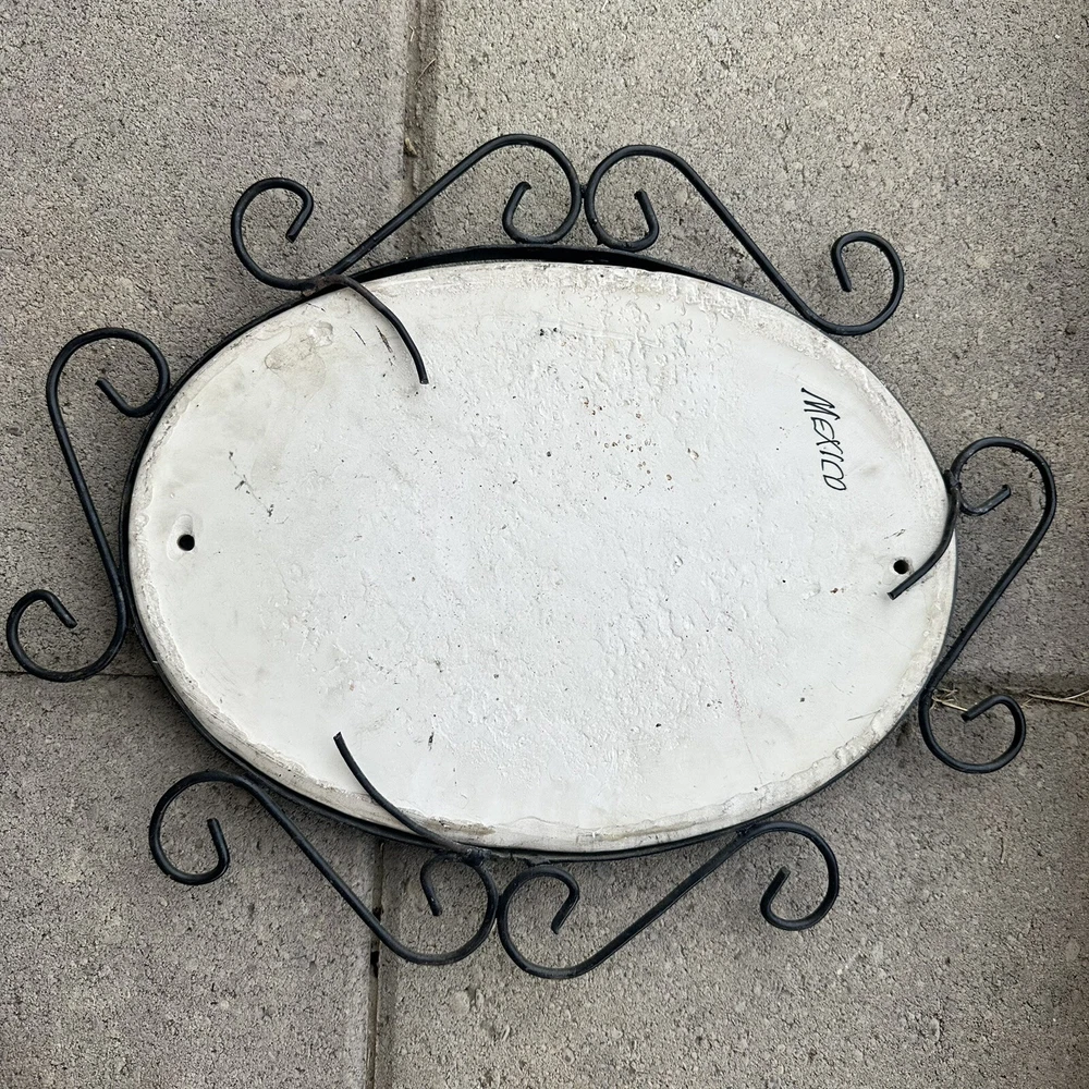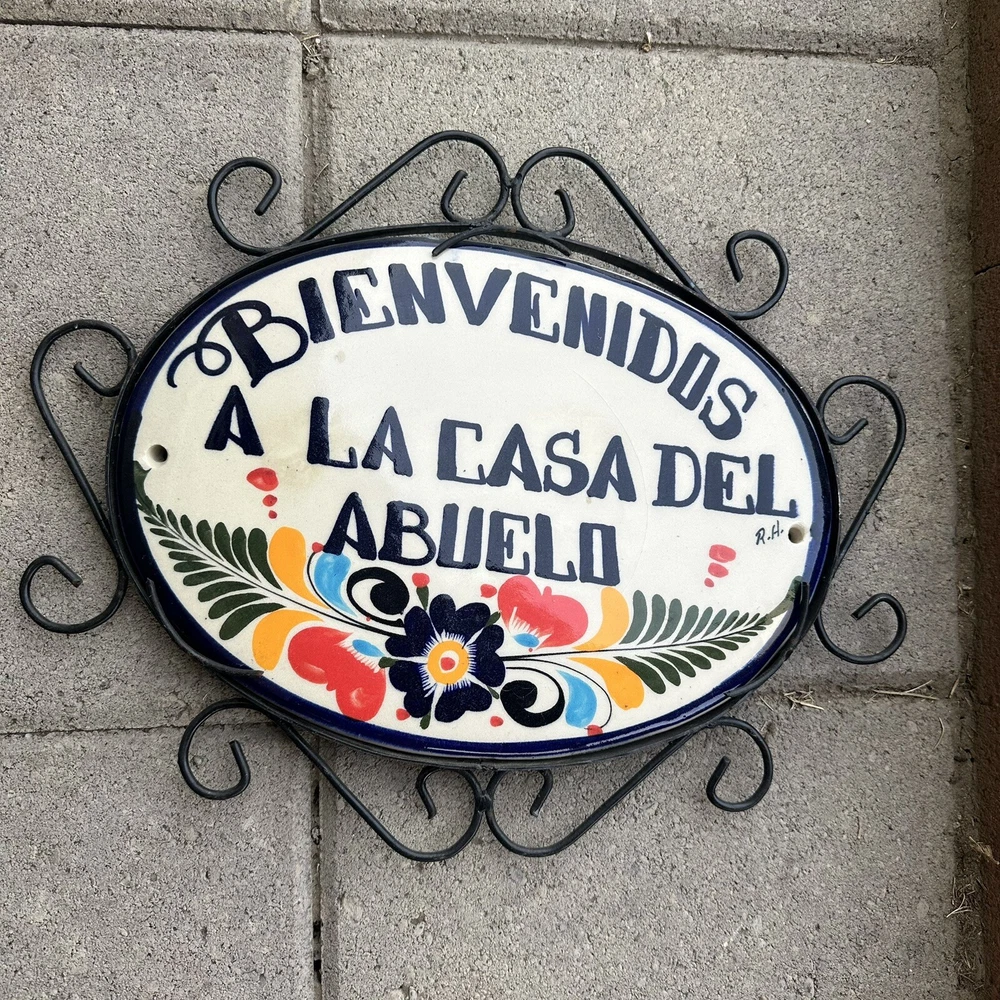 Wrought iron framed BIENVENIDOS A LA CASA DEL ABUELO plaque ceramic Talavera