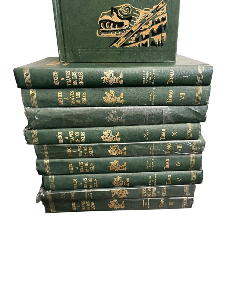 Mexico A Traves de Los Siglos: 10 Volumes by Palacio, Vicente 1981 Ed. (Spanish) COMPLETE SET 1981 Decimoseptima Edicion (17th edition) All volumes entirely in Spanish A Rare beautiful set full of color plates and black & white illustrations with lots of historical information Thick Green-Leather bound hardcover volumes stamped with gold gilt to front and spines Rather large books. Each volume measures 12.25 in x 8.75 in and weight roughly 3 1/2 lbs each. México a través de los Siglos. México: Editorial Cumbre, 1981. Historia General y Completa del Desenvolvimiento Social, Político, Religioso, Militar, Artístico, Científico y Literarrio de México desde la antigüedad más remota hasta la época actual. Obra única en su género. Con ilustraciones intercaladas en el texto y láminas en color. Encuadernados en pasta dura. Total de piezas: 10. Complete Rare set