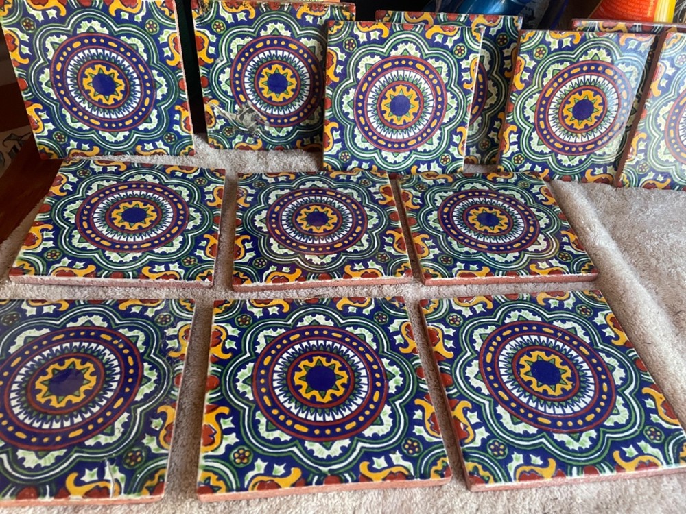This product is a vintage Mexican Talavera ceramic tile in a geometric pattern, featuring multicolor design. Measuring 4x4 inches, it is a unique piece that combines 4x4, 6x6, and 10x10 sizes into one. Handcrafted in Mexico in the Mid 20th Century, this decorative pottery embodies the Mid-Century Modern style and is part of the Century product line. The tile has a vibrant multi-color palette and is a reproduction of vintage original Talavera art pottery.