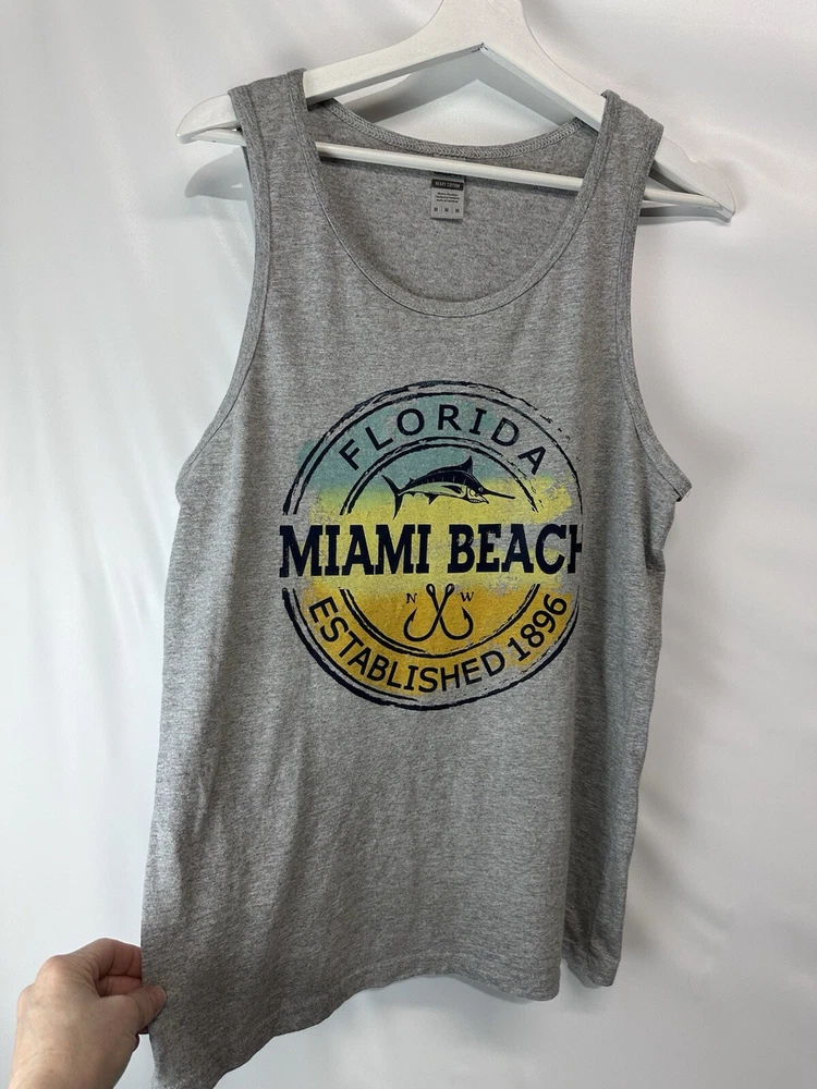 This Florida Miami Beach Cotton Tank Tee Shirt in Harriet Gray is perfect for any beach lover. The sleeveless shirt has a round neck and comes in a size M. It is machine washable and made of breathable cotton material, making it ideal for all seasons. The shirt has a vintage look, featuring the iconic 80s and 90s beach theme. It is an athletic fit and comes in a gray color. The shirt is perfect for men who are looking for a comfortable and stylish shirt to wear to the beach or for any casual occasion.