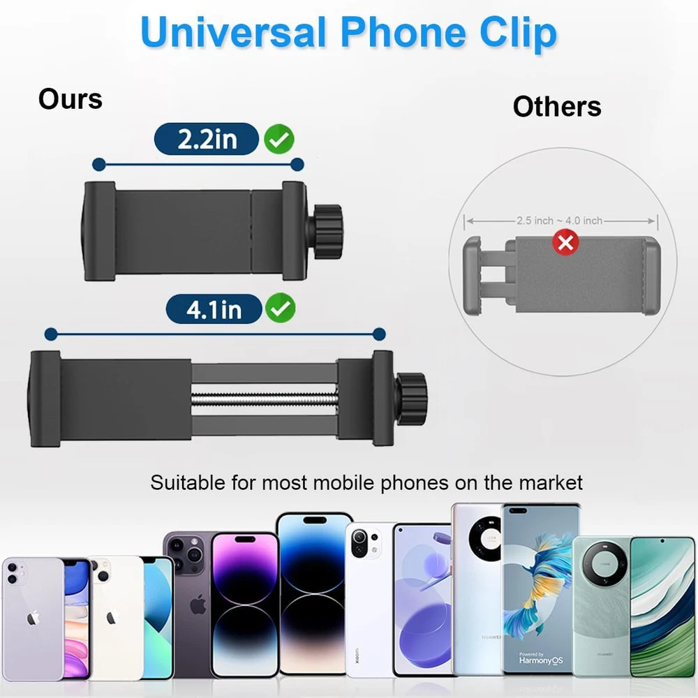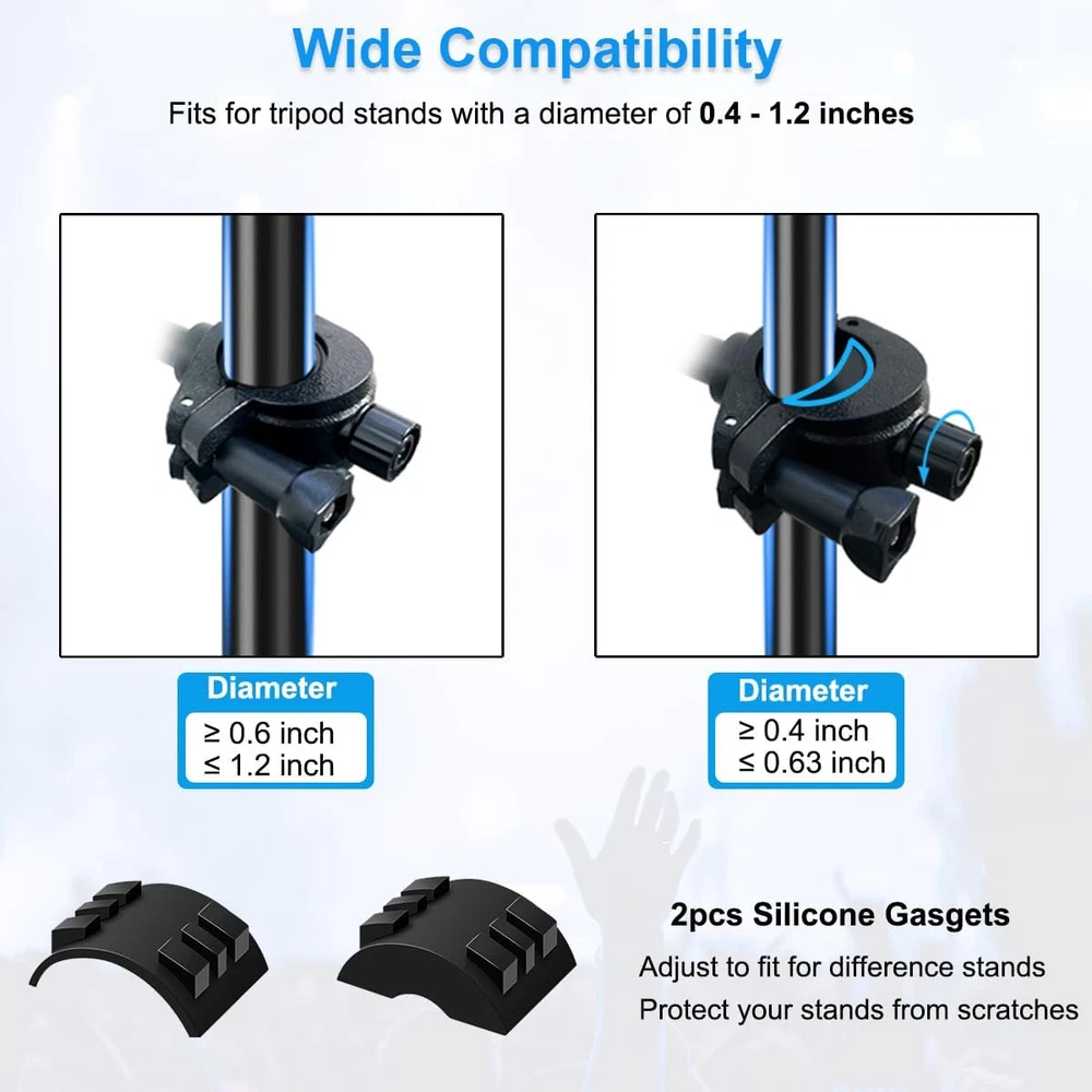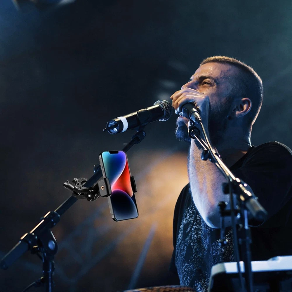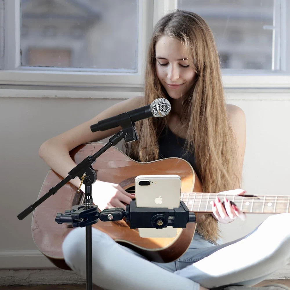 Mic Stand Phone Holder Mount Adjustable for Microphone Black Product Details Item Weight: 5.3 ounces Package Dimensions: 6.02 x 3.35 x 1.57 inches Country of Origin: China Item model number: PH0324051307 Color Name: Black Compatible Devices: Fits for microphone stand, music stand, drums stands, light stands, boom, speaker stand, ring light stand, tripod stand, and etc. Material Type: Nylon, Plastic, Metal, Acrylonitrile Butadiene Styrene (ABS) Compatible Phone Models: iPhone 15/14/14 Pro/14 Pro Max/14 Plus, iPhone 13/13 Pro/13 Max/13 Pro Max/Mini, iPhone 12 /12 Pro/Max/12 Pro Max/Mini,iPhone 11/11 Pro/ XS/XS Max/XR, iPhone 8/8 Plus/X/7 Plus/7/6s Plus/6s/6 Plus/6/5/5s, Samsung Galaxy, Nexus, HT, LG, Huawei, other smart phones Color: Black Brand: JCWINY Material: Nylon, Plastic, Metal, Acrylonitrile Butadiene Styrene (ABS) Style: One Pack Base Type: Flat 【Versatile Mic Stand Phone Holder】JCWINY mic stand phone mount fits for any pole/tube/rod/pipe with a diameter of 0.4-1.2 inches, like mic stand, music stand, drums stands, ring light stands, boom, speaker stand, light stand, tripod stand, treadmill, wheelchair and more. A perfect phone clip for mic stand for singers, drummers and guitar players, providing you all with hands-free convenience for a flawless onstage experiecne. 【Dual BallHead Rotation Design】JCWINY cell phone holder for mic stand provides you infinite flexiblility by adjusting the dual ball-head with 360-degree rotation, allowing precise positioning for optimal viewing in any situation. 【Rock-Solid Stability】Designed with O-Style Buckle Locking to your microphone stand, JCWINY iphone mic stand holder providing strong clamp force and making your phone sturdier and safer, not drifting down when you touch or use the music stand phone holder. 【Universal Compatibility】The mic stand cell phone holder fits for nearly all smartphones with or without a case, including the iPhone 15 14 13 12 11 XR MAX Pro X Plus Samsung Galaxy S32 S22 S21 Note Moto X Huawei Google Pixel and other cell phones. 【Convenient】 Easy to use and no tools required. Great onstage microphone stand phone holder for solo singer / players or everyone in your band that has a mic stand or music stand close by. Free your hands via the mic stand iphone holder for music sheets. What You Get: 1 x O-Style Clamp Mount, 1 x Phone Clip, 1 x Thin Gasket;