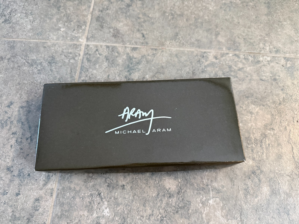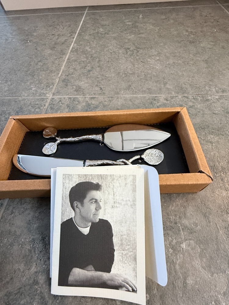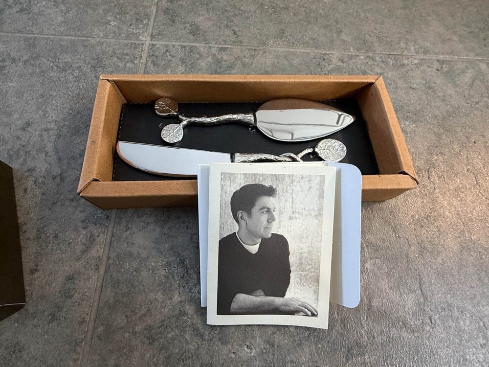 New in box, received as gift years ago. Michael Aram stainless steel, nickel plated set of two cheese knives, in original box, with paperwork and a blank (unused) greeting card, Botanical Leaf Collection, not recommended for dishwasher, hand wash, avoid abrasive cleaners. Nice gift.
