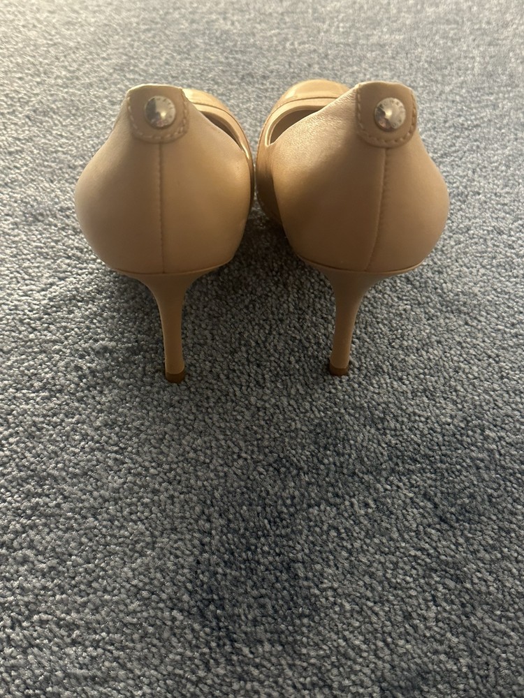 Elevate your wardrobe with these stunning Michael Kors nude beige patent leather high heels. Crafted with a glossy finish and a timeless design, these shoes exude elegance and sophistication, perfect for formal events