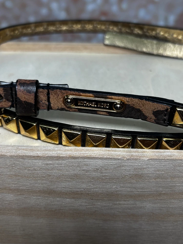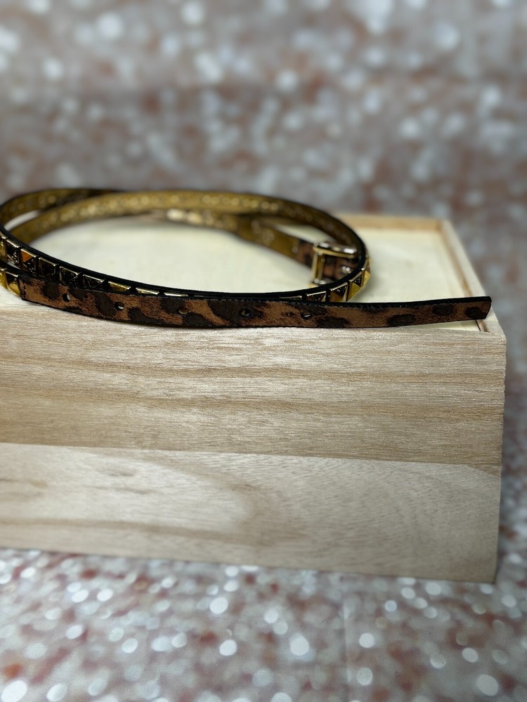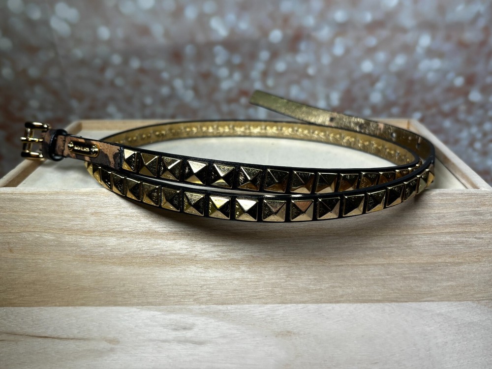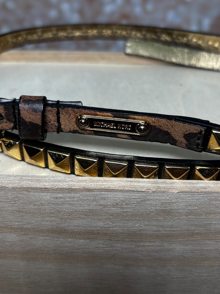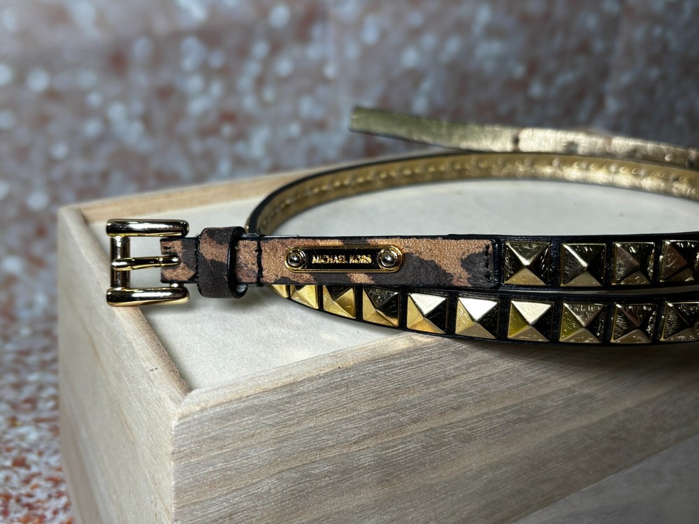 The Michael Kors Gold Studded Leopard Embossed Leather Skinny Belt in size Large features an animal print pattern with a leopard theme. The belt is made of leather with gold-plated hardware and studded accents, giving it a stylish and edgy look. This waist belt has a skinny width and is designed for women who wear a waist size of 38-39 inches, adding a touch of glamour to any outfit. All the seams are intact. There are no stains or holes. Comes from a smoke free / pet friendly home. ๐บ๐ธ๐บ๐ธ Sold by a Proud Military Family ๐บ๐ธ๐บ๐ธ ~10% of every item I sell is donated to our charity - Veterans Community Project.