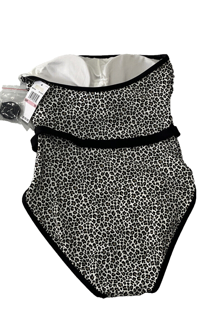 Michael Kors Logo-Belt Bandeau One-Piece Swimsuit size: 10 color: Black / Tan Bandeau neckline Removable soft cups with underwire Lined Attached belt with gold logo detail Pull-on style Optional strap Full bottom coverage Nylon/ spandex blend retail $126 K48