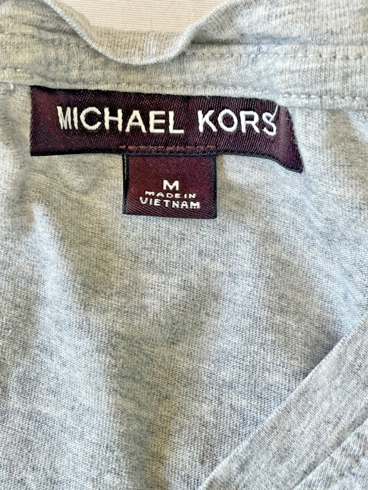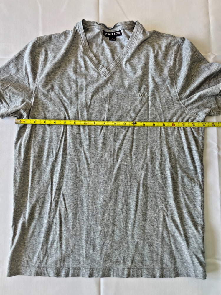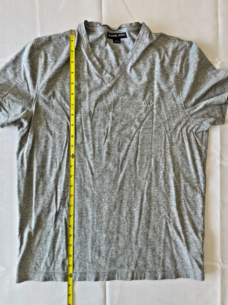 Upgrade your casual wardrobe with this Michael Kors V‑neck tee — a clean, classy staple that pairs perfectly with jeans, chinos, or shorts. The light heather gray tone and subtle MK logo give it a designer touch without being loud. Crafted from soft cotton, this tee offers comfortable breathability with a premium feel. It’s a great choice whether you're layering it under shirts, jackets, or wearing it solo on warm days. - Brand: Michael Kors — designer casual label - Style: Crew or V‑neck (V‑neck as shown) T‑shirt, versatile layering piece - Color: Heather / light gray — neutral and easy to pair - Fabric: 100% cotton (or performance cotton / liquid cotton variant) - Logo: Subtle MK embroidery/logo at left chest - Fit & Measurements: approx 25‑26 in length (shoulder to hem) - Condition: Gently used, no stains, seams intact - Ideal for: everyday wear, casual style, layering under jackets or alone