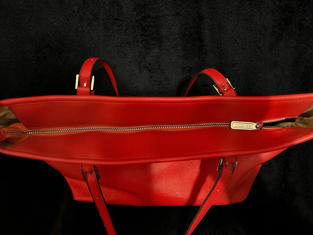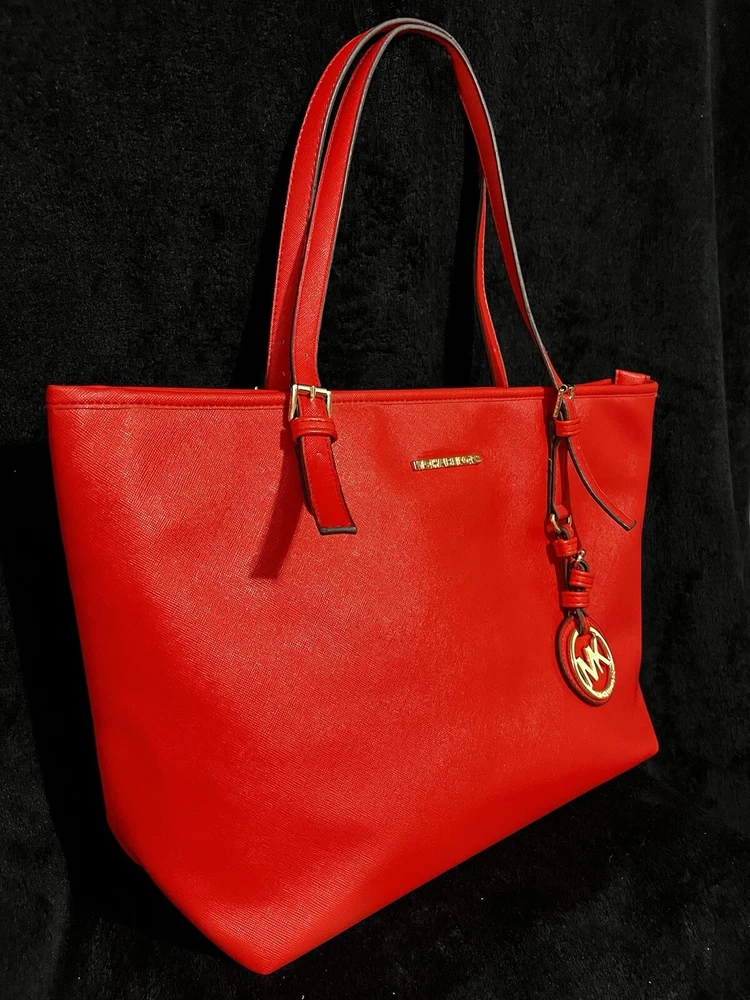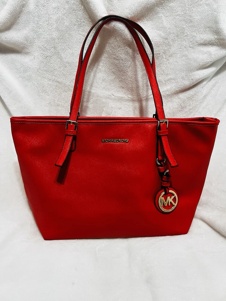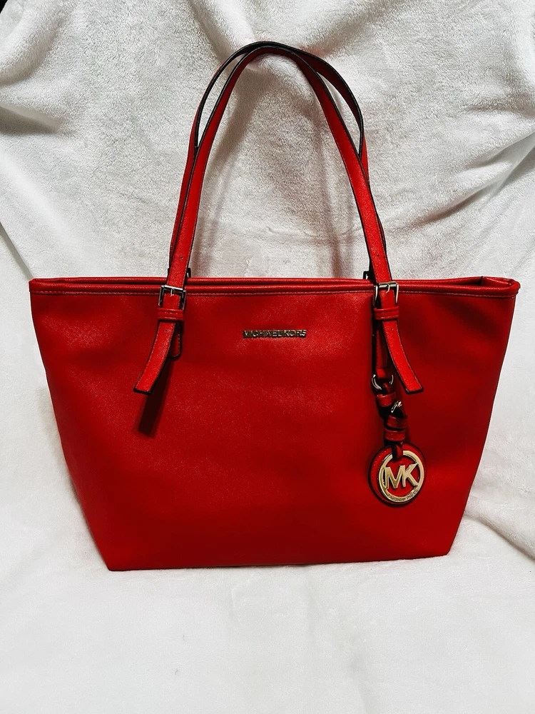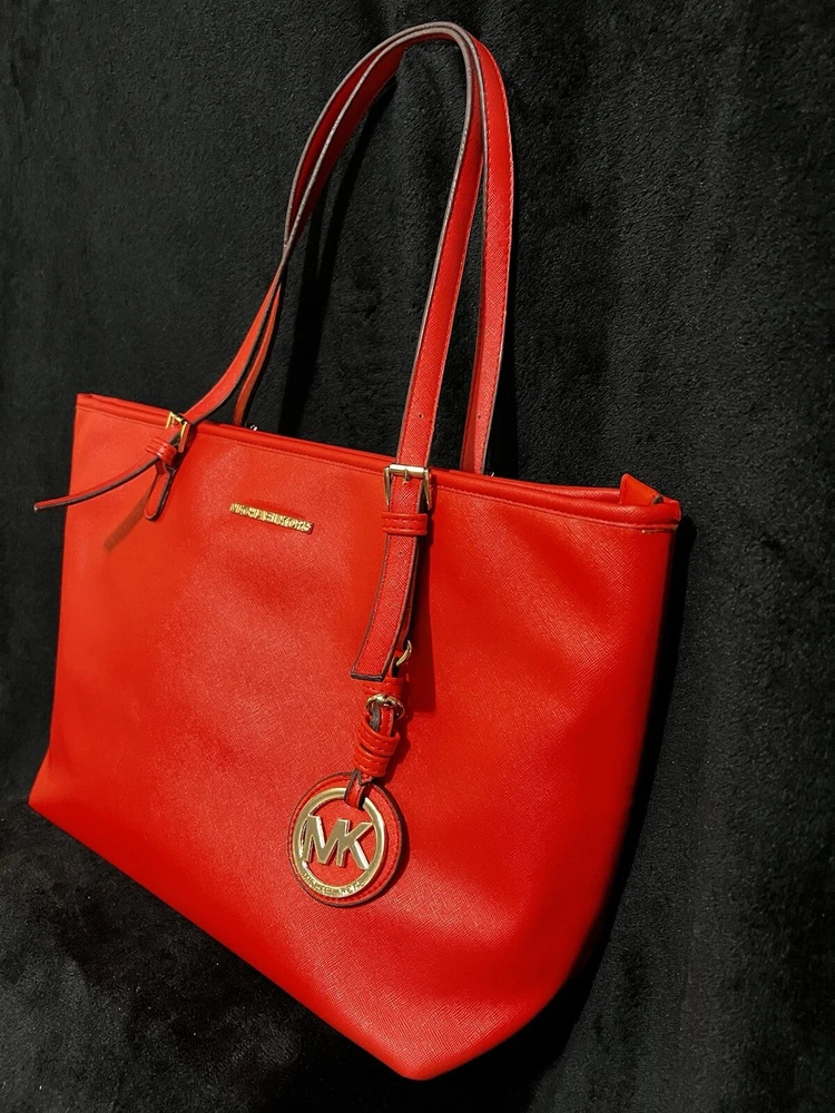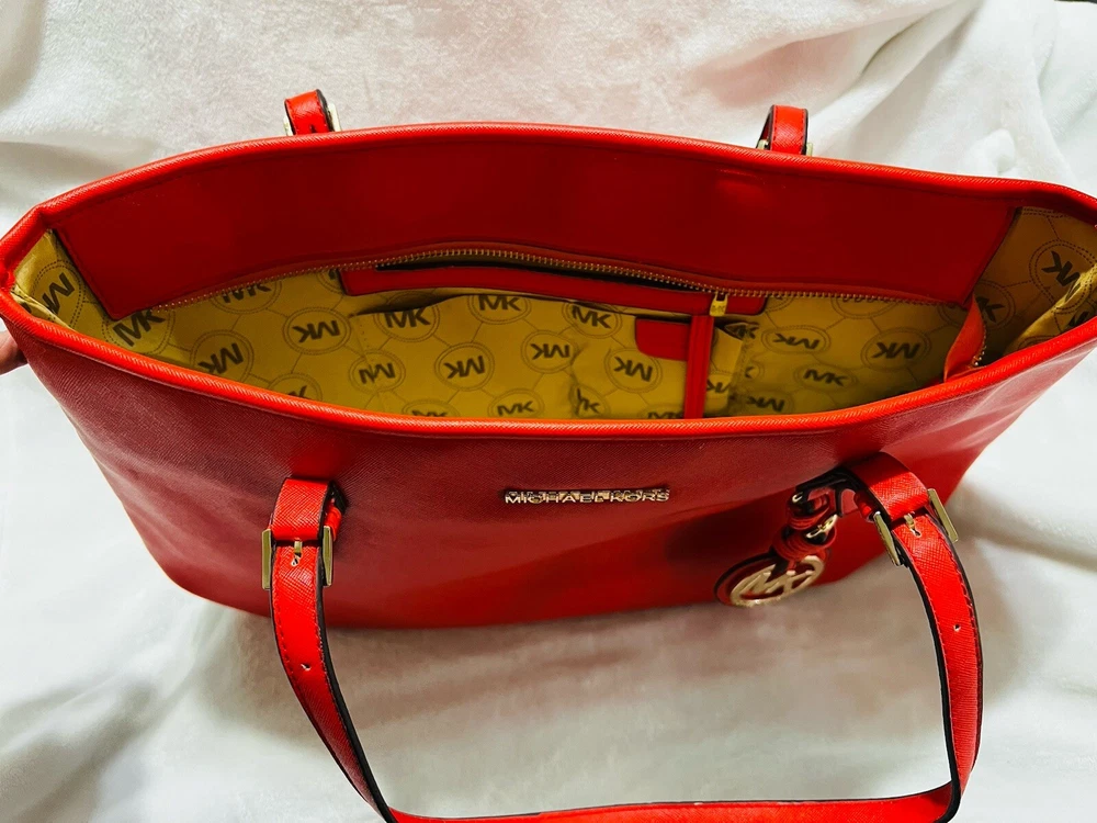 This Michael Kors Jet Set travel tote is a stylish and practical option for any woman on the go. The radiant orange exterior is made of high-quality saffiano leather and features a gold-plated hardware. The bag has a zip closure and double handles, with a 9.25" drop for comfortable carrying.The tote has a solid pattern and features a Michael Kors logo accent. It has inner pockets for added organization and is stain-resistant, making it perfect for travel. The bag also comes with a bag charm accessory and has a medium size, measuring 15" in width, 11" in height, and 6" in depth. This classic piece is a must-have for any fashion-savvy woman.
