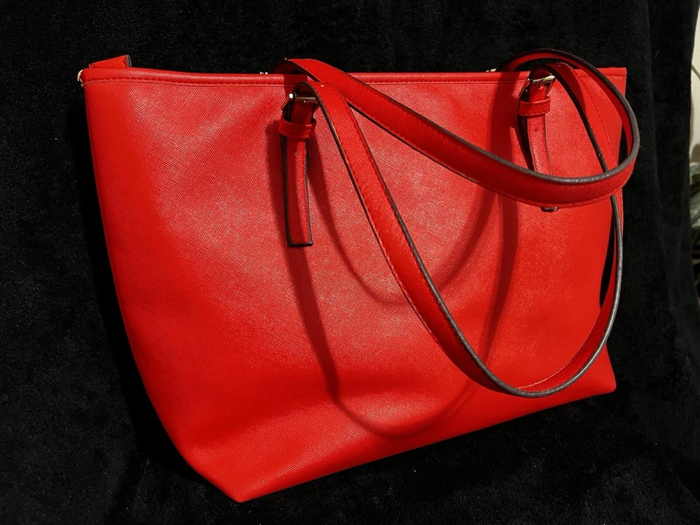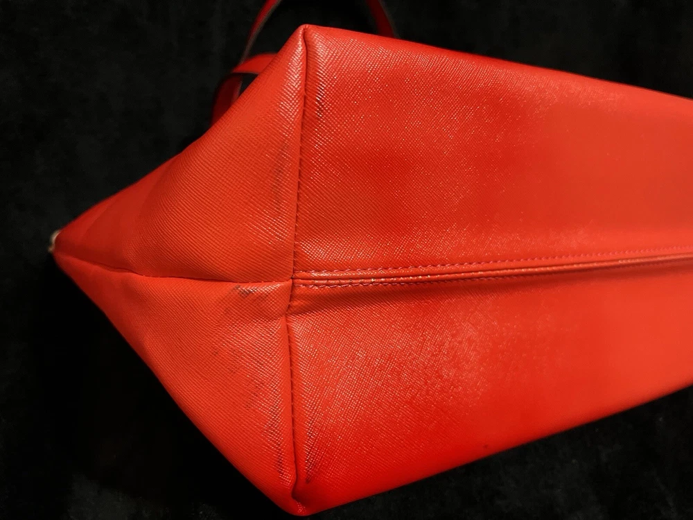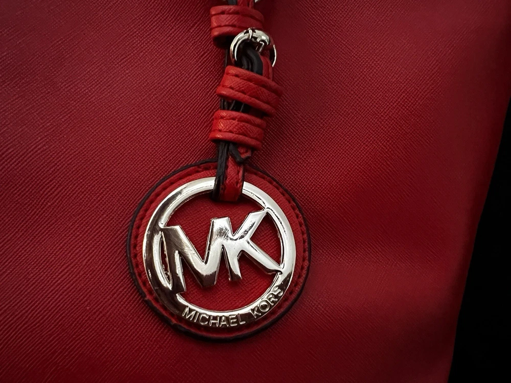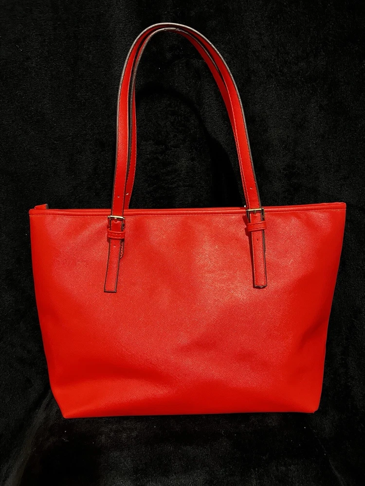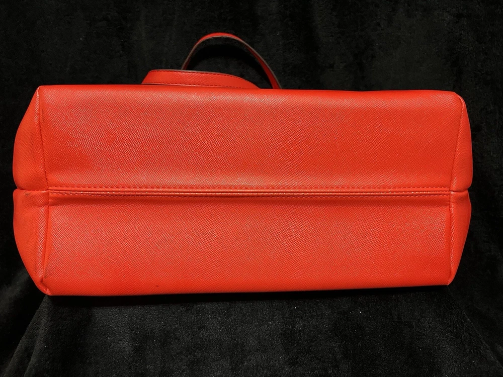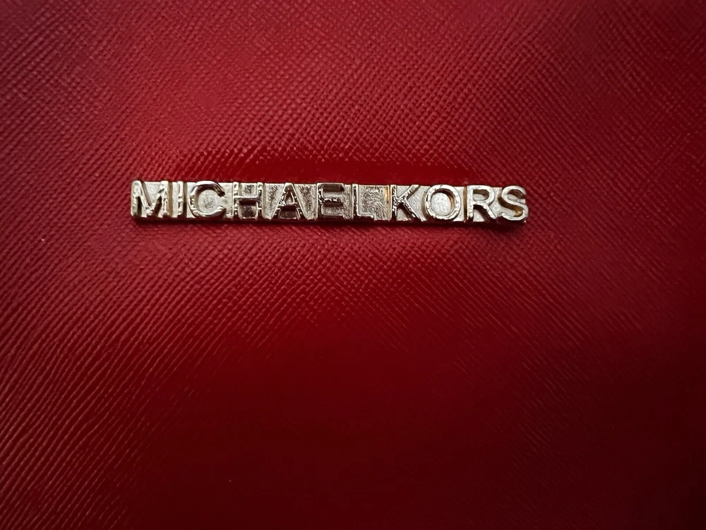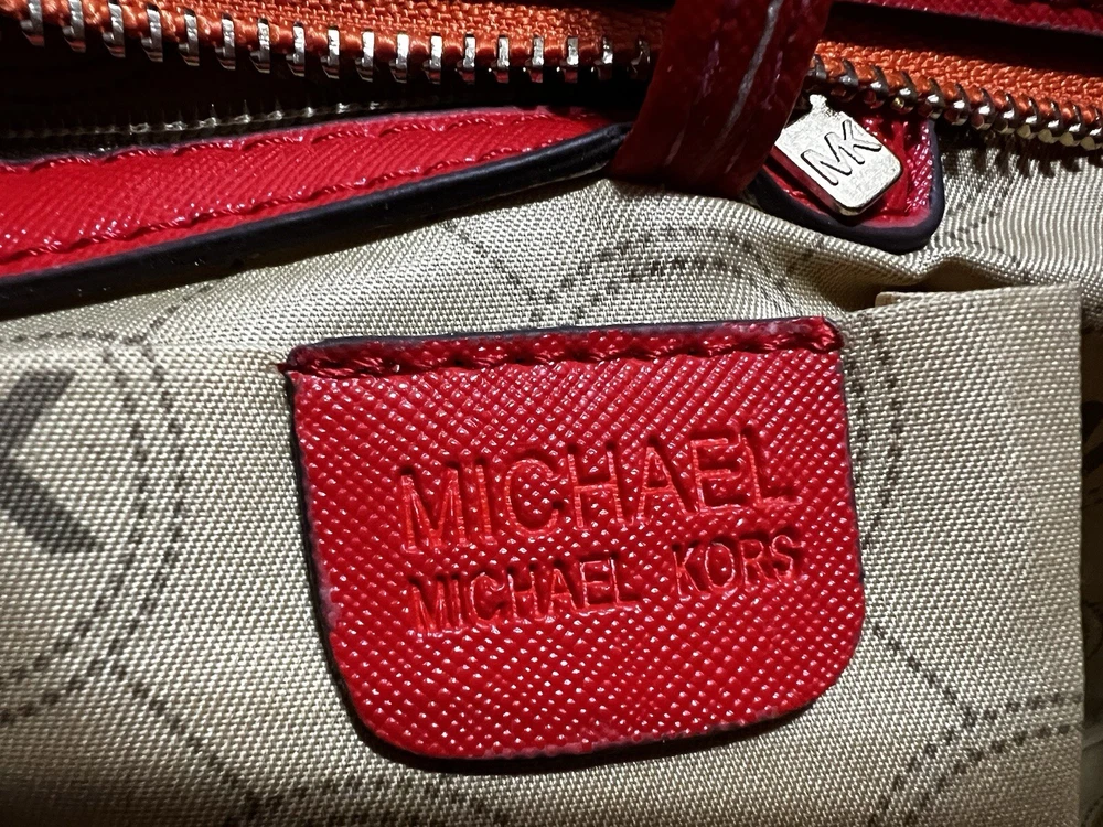 This Michael Kors Jet Set travel tote is a stylish and practical option for any woman on the go. The radiant orange exterior is made of high-quality saffiano leather and features a gold-plated hardware. The bag has a zip closure and double handles, with a 9.25" drop for comfortable carrying.The tote has a solid pattern and features a Michael Kors logo accent. It has inner pockets for added organization and is stain-resistant, making it perfect for travel. The bag also comes with a bag charm accessory and has a medium size, measuring 15" in width, 11" in height, and 6" in depth. This classic piece is a must-have for any fashion-savvy woman.