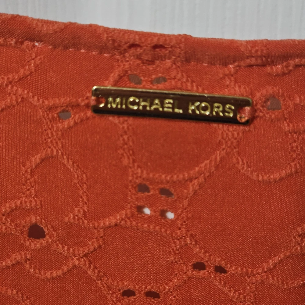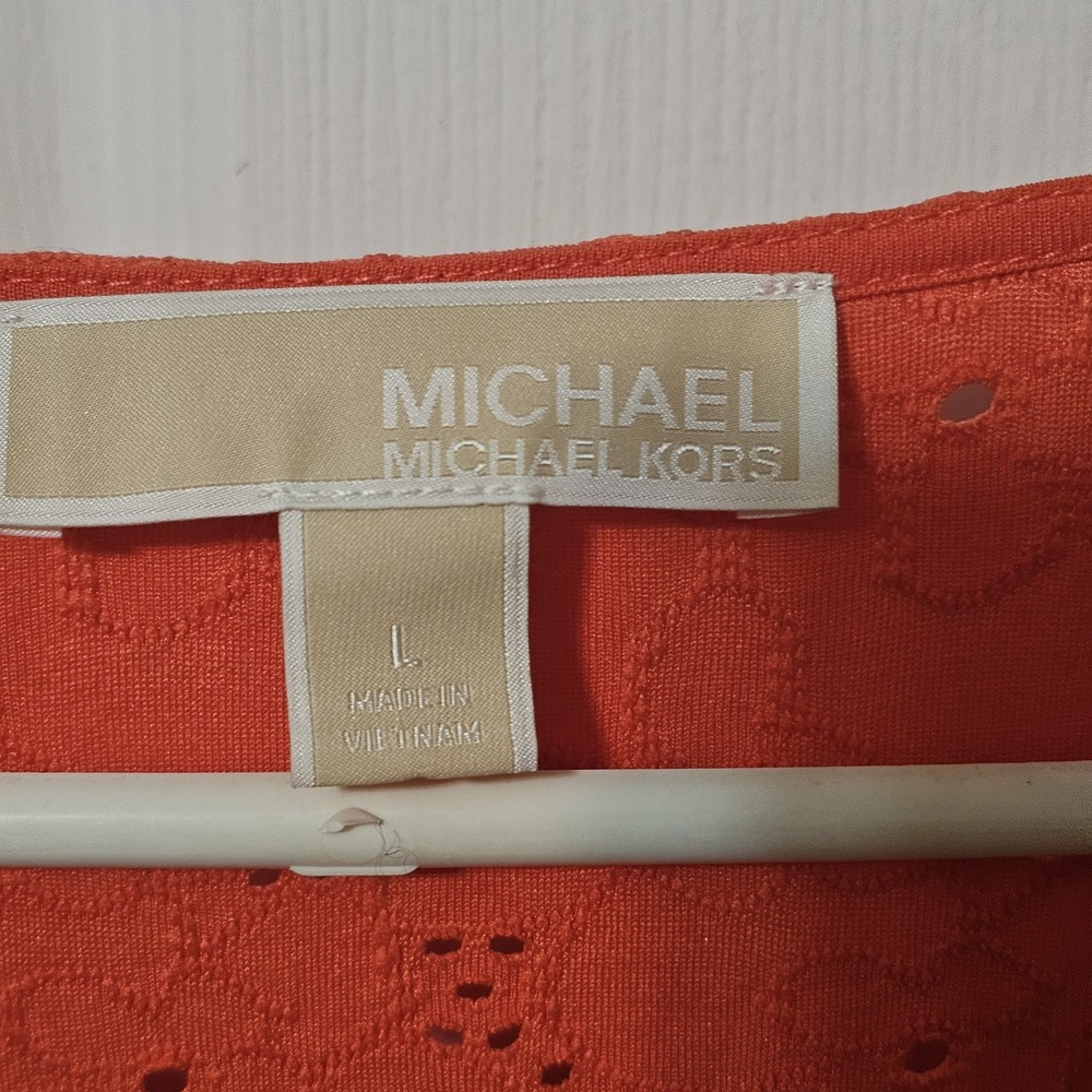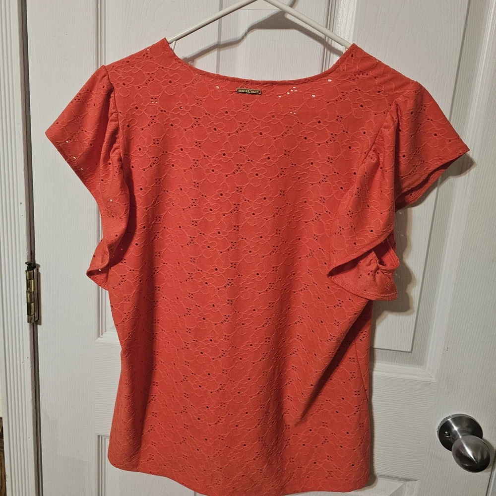 The Michael Kors Women's Coral Eyelet Design V Neck Short Sleeve Blouse in size Large features a stylish floral pattern, perfect for adding a touch of designer flair to any outfit. The v-neckline and short sleeves provide a comfortable and elegant look, while the coral color adds a pop of vibrancy to your wardrobe. Ideal for women who appreciate high-quality fashion with a touch of sophistication, this blouse is a versatile and chic addition to any collection.