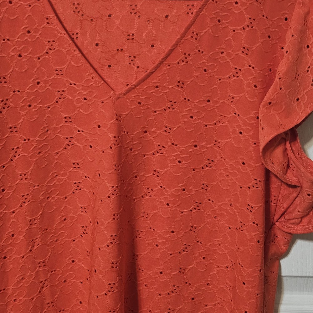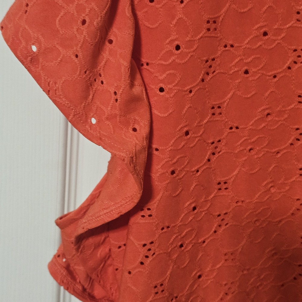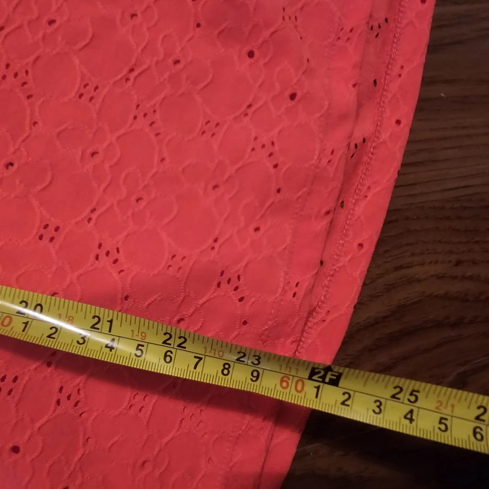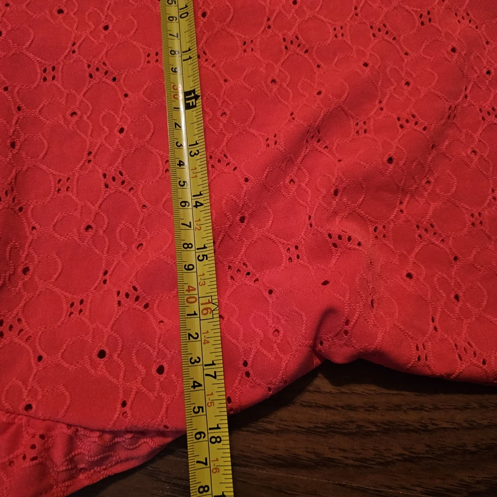 The Michael Kors Women's Coral Eyelet Design V Neck Short Sleeve Blouse in size Large features a stylish floral pattern, perfect for adding a touch of designer flair to any outfit. The v-neckline and short sleeves provide a comfortable and elegant look, while the coral color adds a pop of vibrancy to your wardrobe. Ideal for women who appreciate high-quality fashion with a touch of sophistication, this blouse is a versatile and chic addition to any collection.