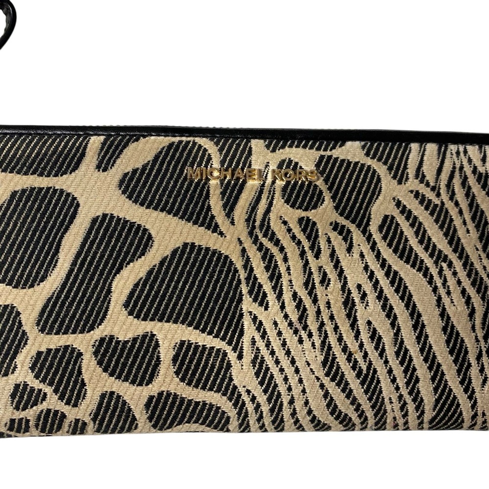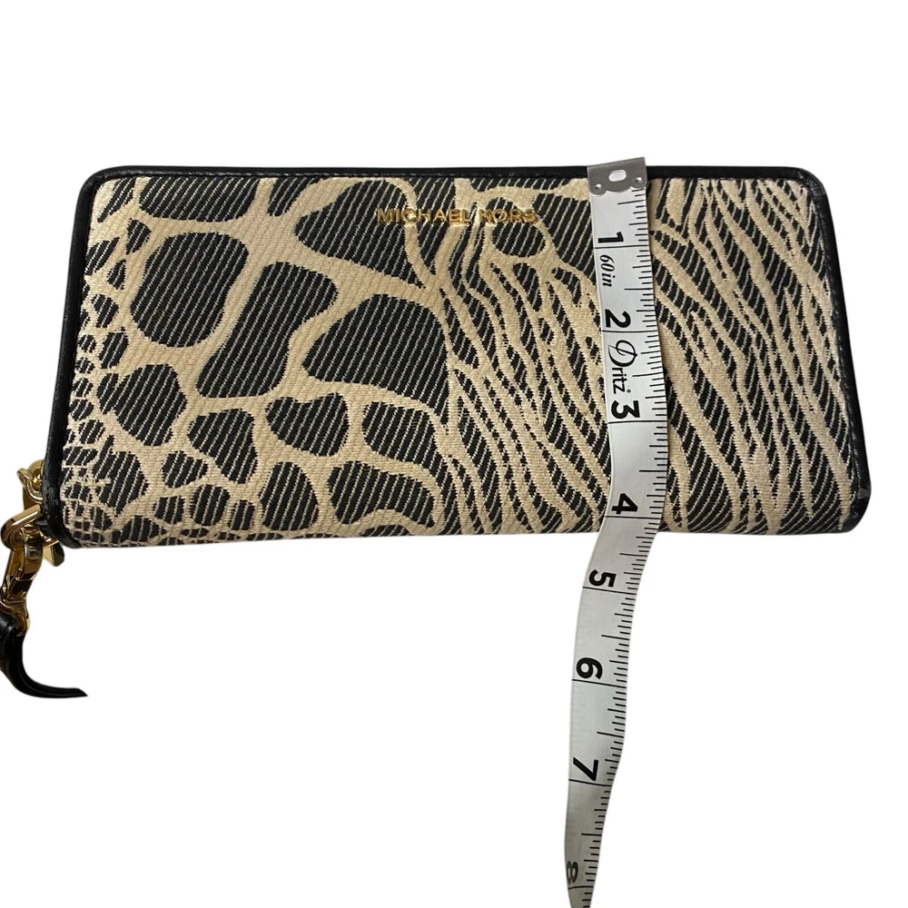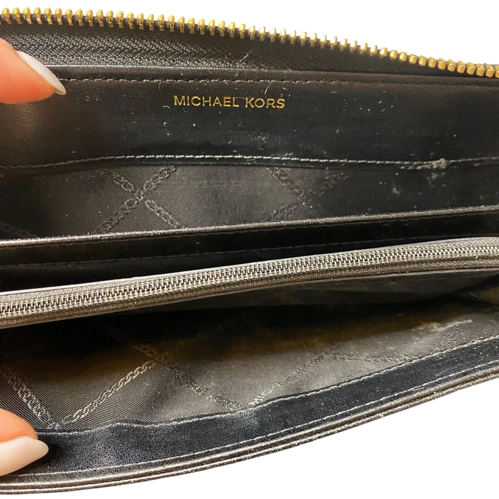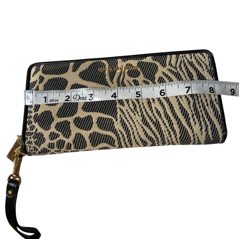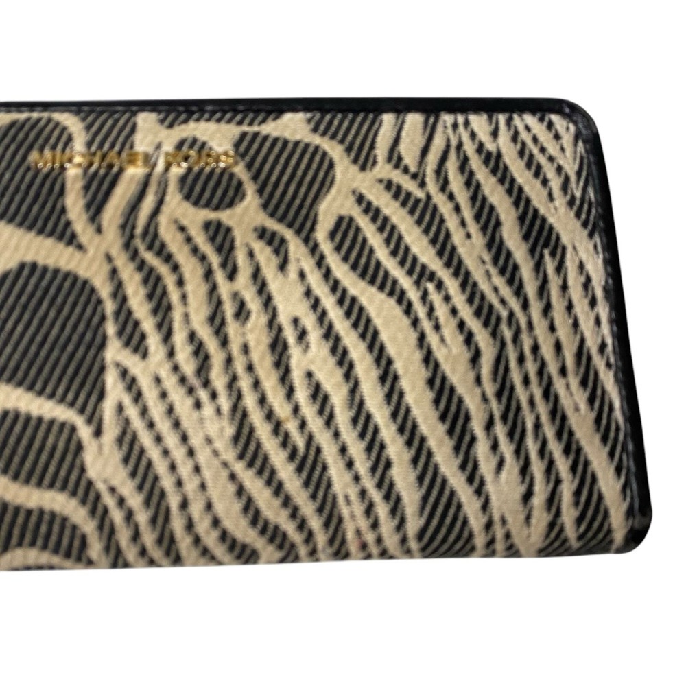 Michael Kors Women's Cotton Canvas Jet Set Travel Zip Around Continental Wallet Large sized wallet made from high-quality cotton canvas with smooth nappa trim, ensuring durability and a luxurious feel. Securely stores your essentials with a convenient zip-around closure, keeping your belongings safe and easily accessible. Features a polyester lining and multiple pockets including 17 credit card pockets, 5 slip pockets, and 1 zip pocket, offering ample storage space for cards, cash, coins, and more. Golden hardware for a luxe look. Pre-loved with some wear on corners and interior pockets as shown in photos. Color in pics may vary due to lighting and/or monitor settings APPROX MEASUREMENTS: 8-1/4"W x 4"H x 1"D, with a 7"L strap for easy carrying. SHOP POLICIES * All items ship within 1-3 business days (I always try to ship by next business day) * This item is used pre-loved * Any defects (if any) are noted and shown in the photos * All sales are final * Please review the description/pictures and ask questions before purchasing