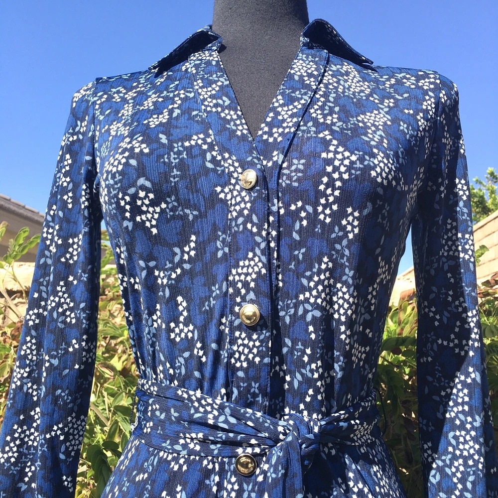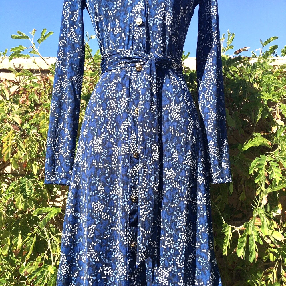 This Michael Kors shirt dress in size XS is perfect for any occasion. The dress features a beautiful blue and white floral pattern that is perfect for summer, fall, and spring. The V-neckline and button closure add a touch of elegance to the dress, while the waist sash and long sleeves make it suitable for both casual and formal events. The dress is made from a soft polyester blend jersey fabric that is machine washable for easy care. It is a collared dress with a fitted long sleeve style, and it comes in a unit quantity of one. The dress is not personalized, vintage, or handmade, and it is suitable for women of all ages. MSRP$135.00