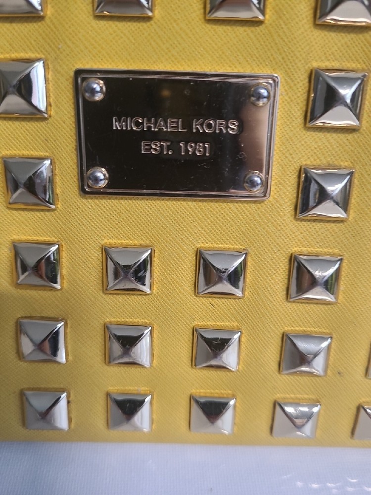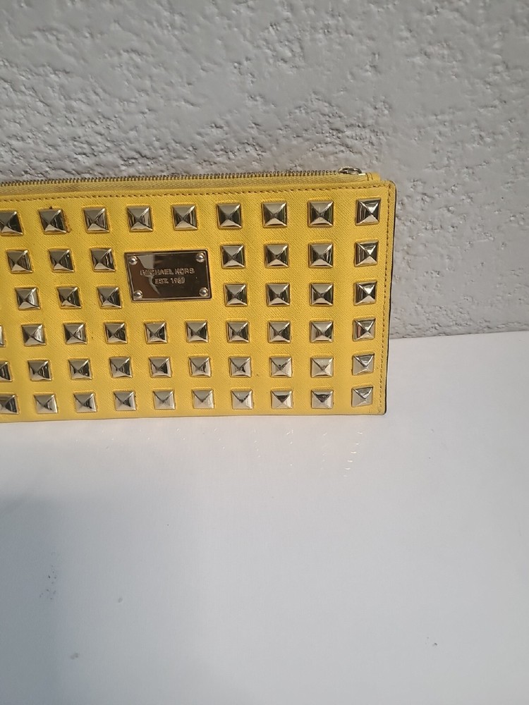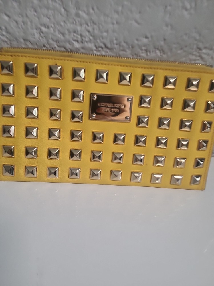 Michael Kors stud clutch, yellow. L10 H 5.5 Discolor Near Zipper. Condition is Pre-owned. Shipped with USPS Parcel Select / Ground Advantage.
