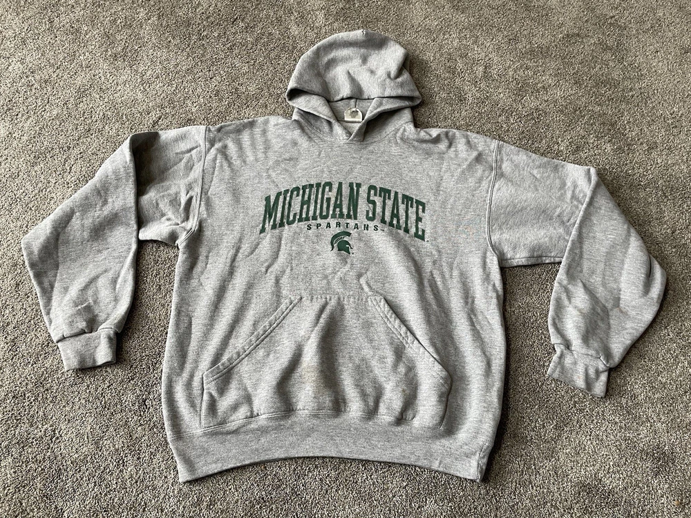 Show your support for the Michigan State Spartans with this vintage gray hoodie from MJ Soffe. Perfect for football season or just lounging around, this comfortable sweatshirt features the team's name and logo prominently on the front. Made for men and available in size L, it's a great addition to any fan's collection. Whether you're cheering on the team during the regular season or gearing up for the playoffs, this sweatshirt is a must-have for any true fan.