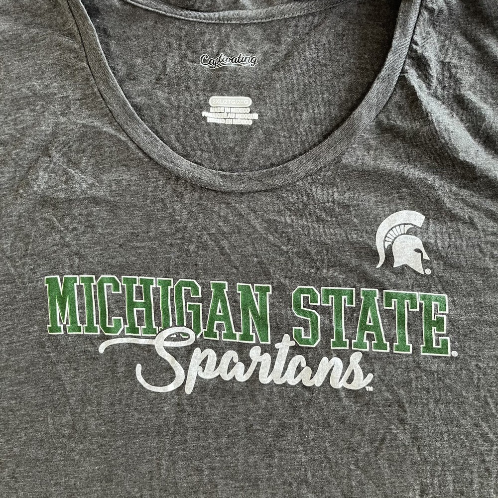 General Notes Color(s) may slightly differ due to monitor settings and lighting. Please check out our other listings as you may be surprised at what you find. Please read the item description and view all the photos. The photos will provide a good representation of the item (see the first note above about colors). Any flaw(s) will have a dedicated photos to show the flaw(s) You may want to compare the measurements of this item to something you already have that fits. If you experience a problem with your item, please contact us so that we can attempt to fix the issue promptly. Michigan State Spartans Gray T-Shirt Women’s 2XL NWT Company: Captivating Apparel Condition: New With Tags Color: Gray Style: Ladies Fit Sleeves: Short Sleeve Collar: V-Neck Size: 2XL (Extra Extra Large) Sleeve Length: Short Sleeve Shirt Length: 30” (from base of collar to bottom of shirt) Shirt Width: 23” (from pit to pit) Wash Instructions: Machine Wash Signature Spartan Logo, MICHIGAN STATE and Spartans printed on front hit in green and white See photos for measurements and shirt details and appearance Measurements are approximate (see photos) Item Description from the Seller Add this Ladies heathered dark gray tee to your Michigan State collection and show your support for the Spartans! This NCAA officially-licensed piece Has a subtle ladies cut and style and features the school colors (green and white) printed graphics on the front of the shirt. It is brand New With Tags, so Buy It Now! Inv. #0336