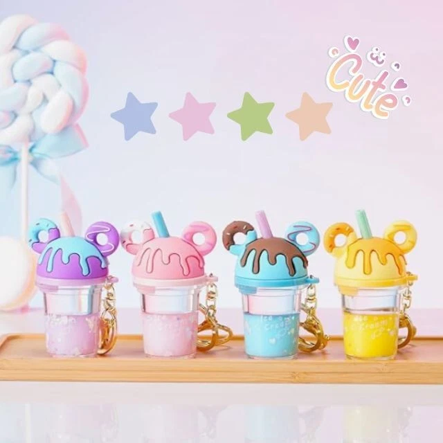 Product Name: Mickey Mouse Donut Ear Milk Tea Cup Keychain Please Note: Slight color variations may occur due to monitor settings. Thank you for your understanding. 1. Unique Design This keychain is inspired by the adorable Mickey Mouse donut ears, featuring vibrant colors and fun details. Each cup showcases different ice cream colors with donut decorations, adding a special charm to your belongings. 2. Colorful Options Available in four vibrant colors, this keychain comes in bright yellow, refreshing pink, sweet purple, and cool blue. The variety of colors allows you to choose one that matches your style and personality perfectly. 3. Practical Size Designed to be compact yet practical, this keychain is easy to attach to bags or key bundles. Despite its small size, it's sturdy enough for everyday use. 4. High-Quality Materials Made from high-quality plastic and silicone, this keychain is durable and long-lasting. The smooth surface is comfortable to hold, and it resists deformation. 5. Perfect Gift Item This keychain is an ideal gift for Disney fans or anyone who loves cute accessories. It's great for special occasions like birthdays, holidays, or a little surprise for someone you care about. **Reason to Buy:** This Mickey Mouse Donut Ear Milk Tea Cup Keychain goes beyond just a keychain; it adds joy and style to your daily life. With its unique design, colorful options, practical size, and high-quality materials, and as the perfect gift item, it especially enhances your possessions. Purchase now to brighten up your everyday routine.