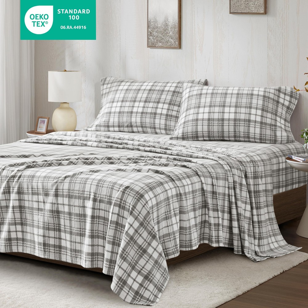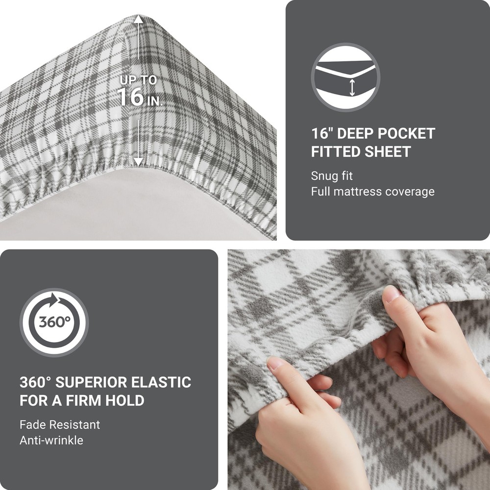A luxurious alternative to flannel, this Micro Fleece Sheet Set turns your bed into a cozy getaway. Featuring a variety of prints and solids these sheets are ultra-soft and perfect for staying warm and comfortable through the night. Machine washable for easy care. Set includes: 1 Fitted Sheet, 1 Flat Sheet, and 2 Pillowcases (or 1 Pillowcase for Twin/TXL sizes). FEATURES - This is a cozy micro fleece sheet set which is a luxurious alternative to flannel and features a charming grey plaid print in soft and subtle hues to create an enjoyable look. Also provides warmth and a fun style for your bedroom Fleece - It is known for its softness, warmt and affordability. When it comes to extra warmth, fleece is the clear winner. It also use a GSM weight indicator rather than thread count to measure quality. It uses 160 GSM for more warmth and better quality FIT - With elastic all around, snugly with your mattress. Fits mattress up to 16 inches deep PACKAGE INCLUDES AND MEASUREMENT - 1 Flat Sheet: 66(W) inches x 96(L) inches, 1 Standard Pillowcase: 20(W) inch x 30(L) inch, 1 Fitted Sheet: 39(W) inches x75(L) inches+14 inches depth EASY CARE - Machine washable and dries quickly on tumble dry low. Do not bleach