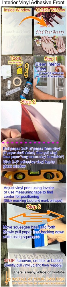 Attention: You will not be able to see through the color ink. Please be aware that our INTERIOR "inside" window decal adhesive vinyl posters are intended to be installed on the inside of non-tinted windows only. If you need to put vinyl graphics on your windows but your shopping center or city's policy does not permit anything on the outside, this is the ideal solution for you. However, please keep in mind that the vinyl is translucent and only allows light to pass through but not detailed shapes, so you will not be able to see through it. The interior vinyl installation will be protected from fading due to UV rays, as the print is behind the vinyl, meaning it will last for many years. Unless you state otherwise, the installation will be made on the inside of the window by default. If you have tinted windows, you should use an EXTERIOR "outside" window vinyl decal or perforated mesh see-through window vinyl for installation. Please note that exterior (non-laminated) vinyl installation is not UV protected and will fade over time, depending on the level of sun exposure it receives. All prints are made on a latex ink printer, which makes them highly durable. Also, the eaves of the building will block a significant amount of UV light exposure. Interior and exterior translucent vinyl decal posters are created to grab attention while being visually appealing, motivational, and informative. These posters quickly and effectively catch the eye of potential customers, making a lasting impression. Vinyl adhesive posters can reach a large audience, particularly in high-traffic areas where they are more likely to be seen. Please refer to the image provided for installation instructions. Alternatively, you can also search for videos on YouTube to find the best methods that work for you. We want to bring your attention to the fact that our business operates on a print-to-order basis. Once printed, there will be no refunds or exchanges as each order is custom-made. Therefore, we strongly recommend that you hire an experienced installer to ensure that the installation is done correctly. This listing is for 1 "ONE" piece only. The number shown in the title is only the item number of the design.