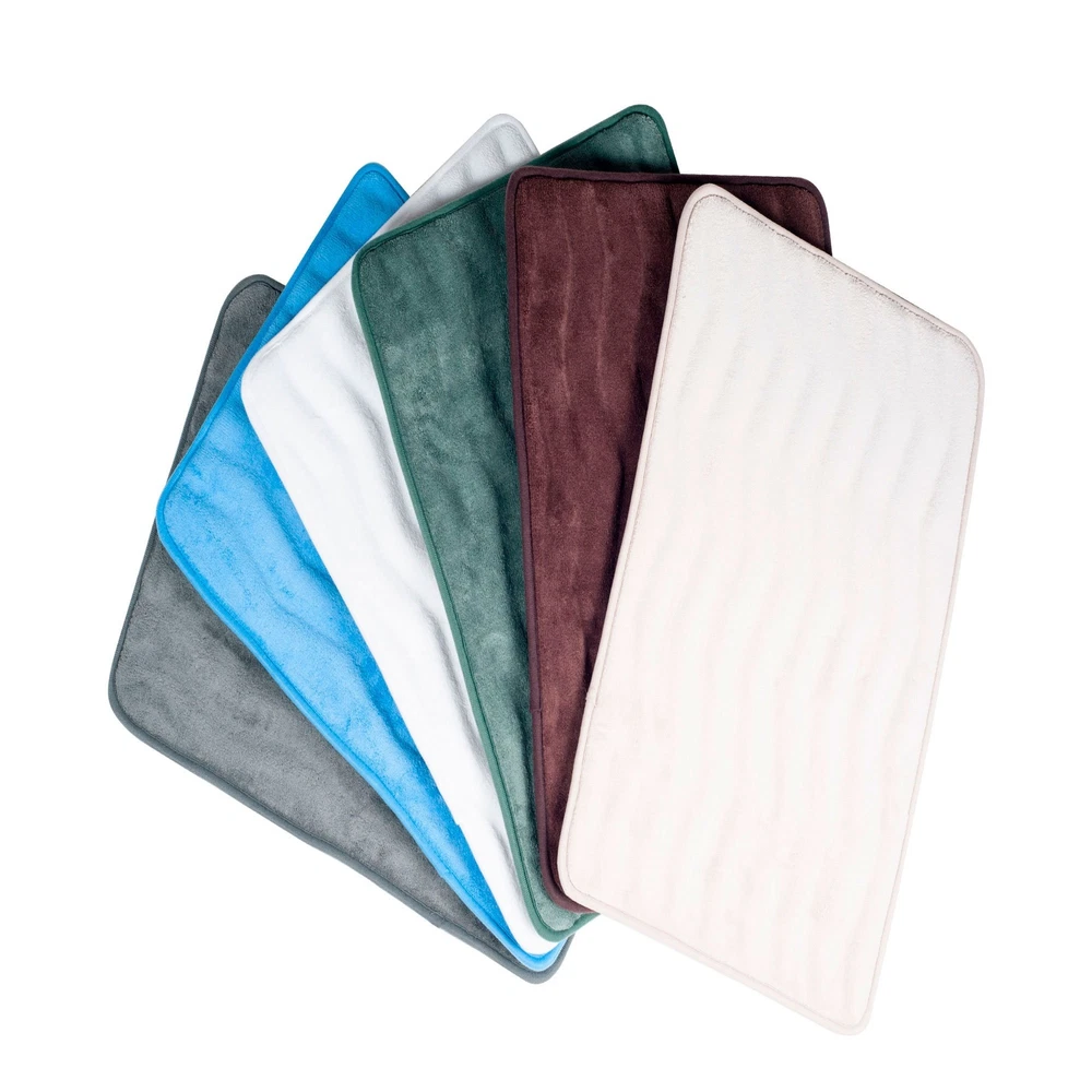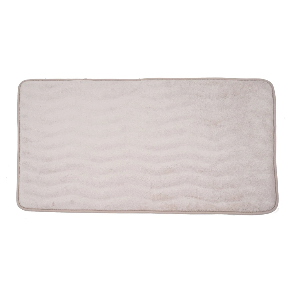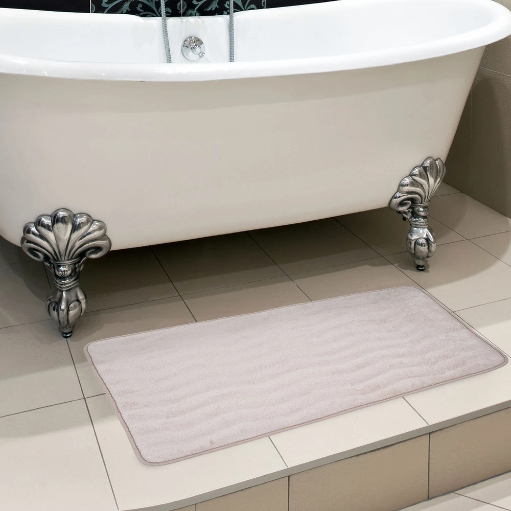 Add comfort and luxury to your bathroom, kitchen or laundry room with the Extra Long Memory Foam and Microfiber Bath Mat by . The .625” thick memory foam provides plenty of soft, cushioned comfort as you step out of your tub or shower. The plush and super soft microfiber topper wicks away moisture and is machine washable for convenient and hassle free cleaning. With a length of five feet, this accent rug is great for bathrooms with double vanities, claw foot tubs or large walk-in showers. It’s also great for use in the kitchen or laundry room for comfortable cushioning on your feet. The back of this oversized bathmat is nonskid, keeping it safely in place as you dry off. The backing is also fast-drying to keep your floors safe and dry. The fun wave pattern texture on this solid color mat brings cozy style to your home. MEMORY FOAM- The memory foam in the mat gently contours to your feet to deliver ultimate comfort. The .625” thick memory foam has ample cushioning to provide gentle leg support. AMPLE COVERAGE – At 2 feet by 5 feet, this runner is perfect for double vanity bathroom sink areas, long countertops, claw-foot tubs, laundry rooms and kitchens. NONSKID AND ABSORBENT- This plush mat has a rubberized nonskid backing that keeps it in place while you dry off from your shower or bath and is also fast drying. The microfiber top wicks away moisture to keep your floor safe and dry. MACHINE WASHABLE- The microfiber top is machine washable. Hang or lay flat to dry completely. PRODUCT DETAILS- Materials: Memory Foam and Microfiber. Dimensions: 59” L x 24” W x .625” Thick.