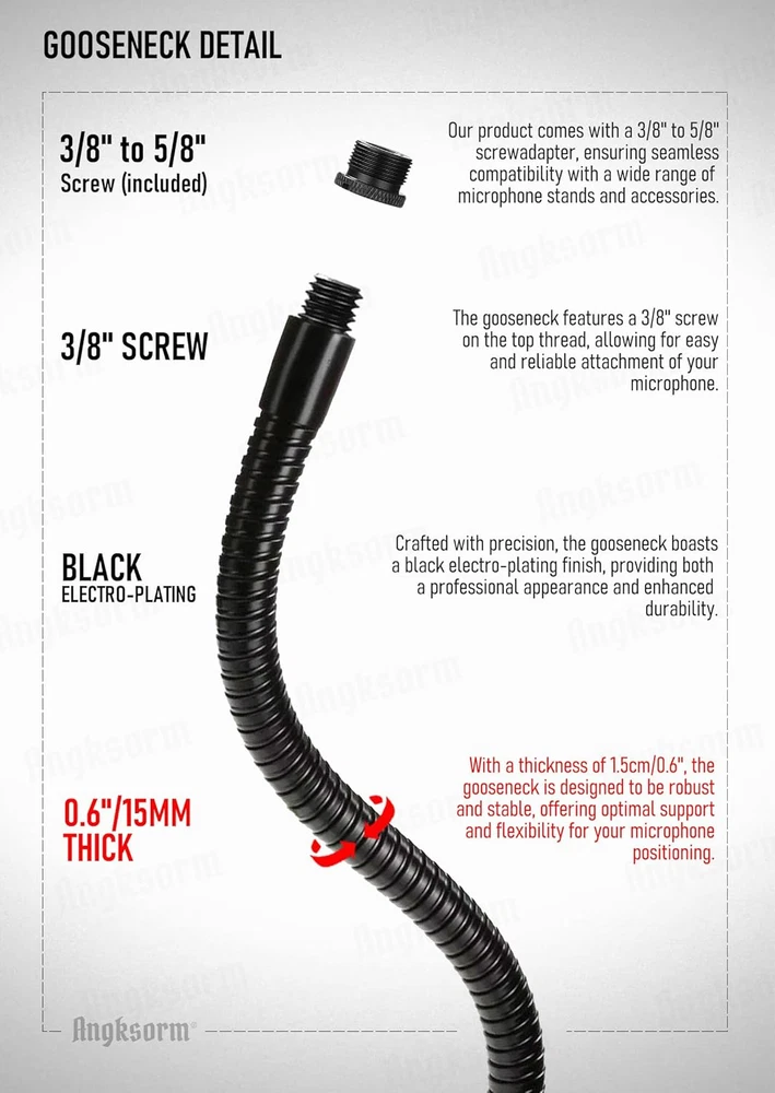 Microphone Arm Stand 19" Flexible Gooseneck Mic Stand Holder with Mounting Base Designed for Every User - Our gooseneck microphone mic podium desk flanged mount is a versatile companion suitable for various usage scenarios. Whether you're podcasting, recording music, delivering speeches, conducting meetings, or teaching lectures, this stand has got you covered. It adapts seamlessly to different environments, making it ideal for podcasters, musicians, educators, content creators, and professionals seeking exceptional audio performance. 0.6 inches x 20.0 inches x 0.6 inches. Weight: 0.2 kg Item model number TMS190 Item dimensions L x W x H 20 x 0.6 x 0.6 inches Color Black Material Type Metal Product Dimensions 20 x 0.6 x 0.6 inches Material Metal Country of Origin China Item Weight 0.2 Kilograms Color Name Black Size 19-INCHS