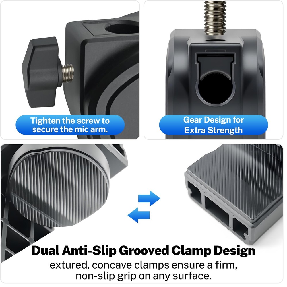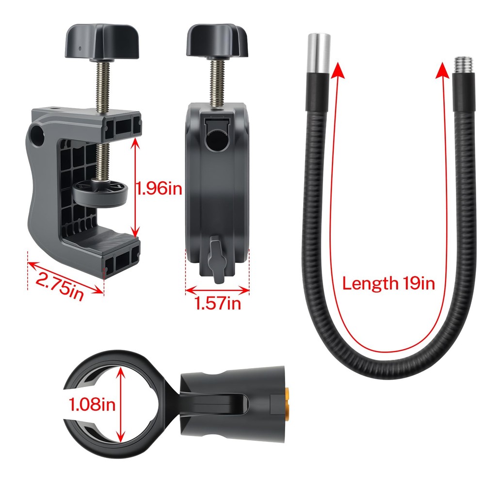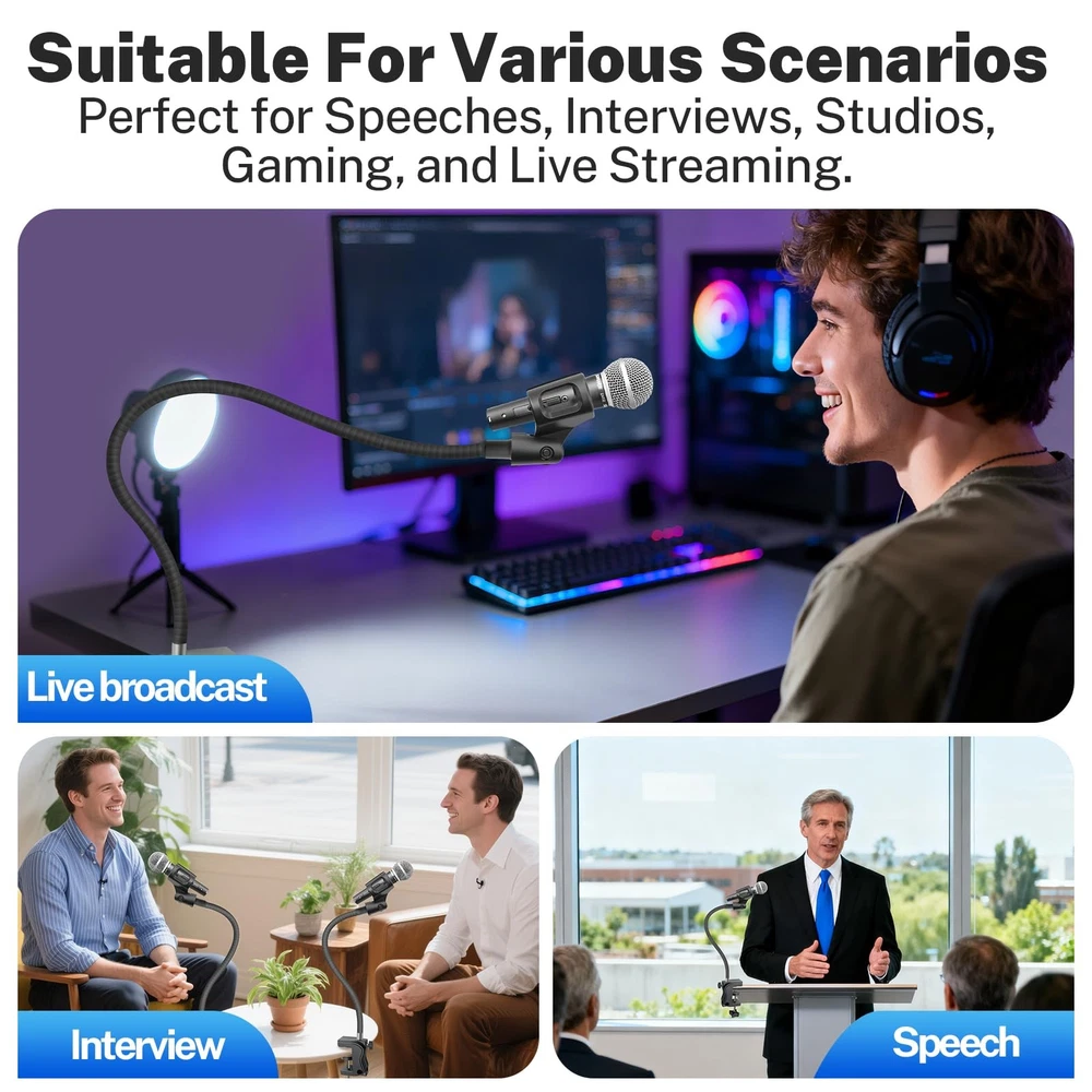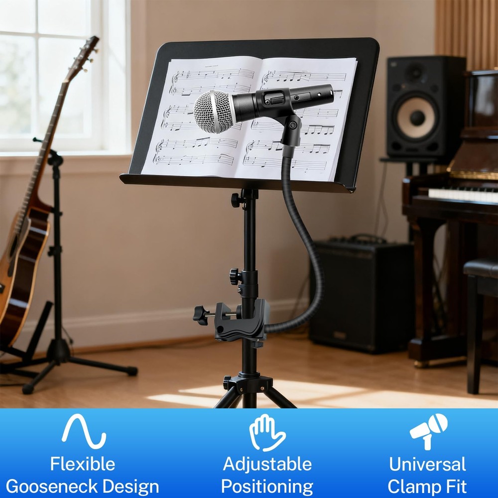 Gooseneck Microphone Arm Wide Compatibility & Secure Fit This 20-inch flexible gooseneck microphone stand supports microphones up to 1.6 lbs and includes 3/8" to 5/8" screw adapters. It is compatible with most mainstream microphones, as well as other standard handheld or condenser microphones. Durable & Stable Construction Built with a robust ABS plastic clamp and a thick 0.4-inch gooseneck, this desk mic stand offers long-lasting stability. The padded clamp protects your desk from scratches and fits securely on surfaces or tubes. Full 360° Adjustability Enjoy complete flexibility with the fully rotatable base and bendable gooseneck arm. Position your microphone at any angle for meetings, podcasts, or live streaming with ease. Compact & Space-Saving Design Perfect for desktop use, this low-profile mic arm saves space while providing professional-grade positioning. Great for gaming, recording, or conference setups. Versatile for Multiple Uses Whether for podcasting, broadcasting, teaching, or vocal recording, this mic stand delivers reliable performance. It’s a must-have accessory for content creators and professionals alike.