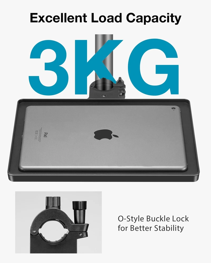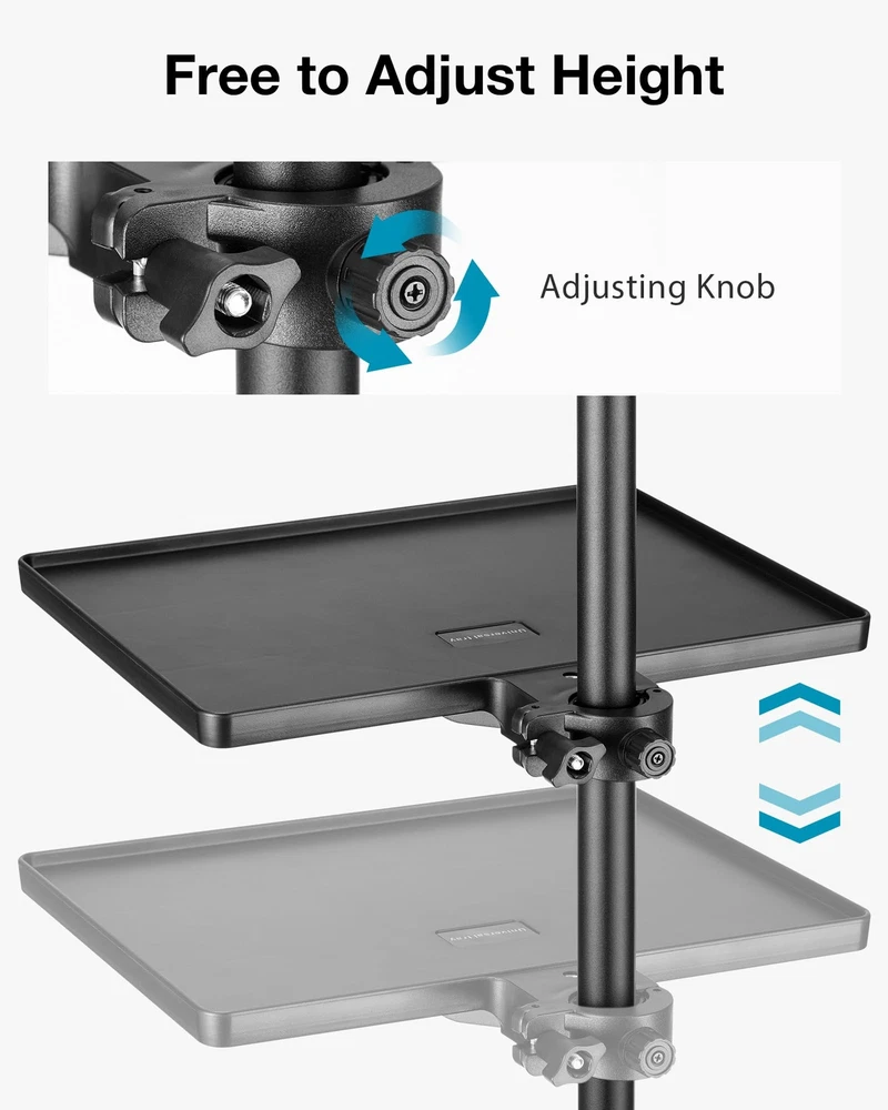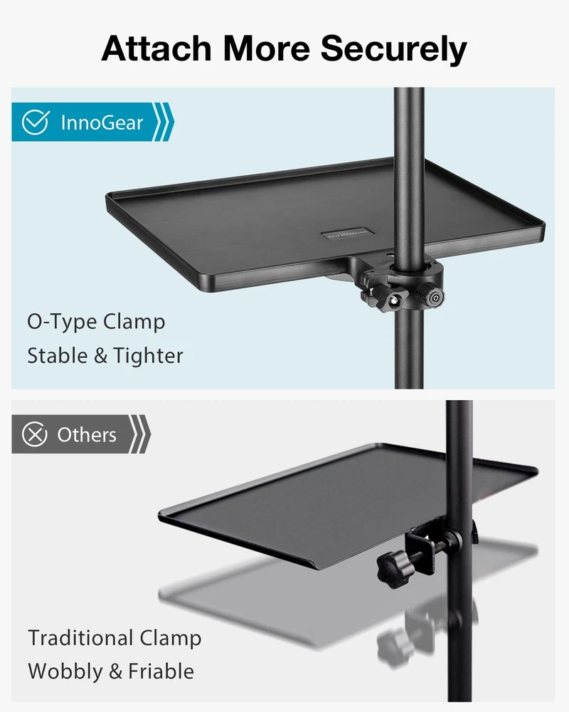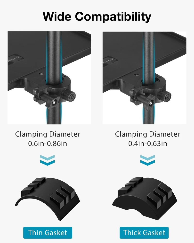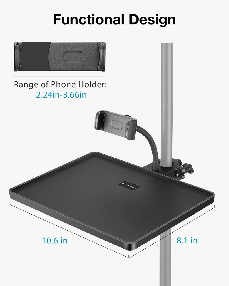 Convenient Size: The microphone stand tray is 10.6” × 8.1” in size, capable of holding different items like capos, picks, tuners, harmonics, phones, remotes, sheet music, earphones, etc. Adjust the knob, and it is easy to set the position of the sturdy tray on your mic stand. Wide Clamping Range: The mic stand tray is compatible with the pole within a diameter of 0.4in-0.86in, suitable for various microphone stands, webcam stands, camera tripods, music sheet stands, speaker stands, selfie ring light stands, etc. Add or remove the thin or thick gasket inside the clamp to match the size of the pole. O-Style Buckle Lock: This durable tray has a max load-bearing capacity of 6.6lbs/3kg and features the upgraded clamp of the O-style buckle lock. Different from other wobbly traditional clamps, the O-type clamp attaches to your music stand more tightly and stably. Flexible Phone Holder: The package comes with a good quality phone holder, which fits cellphones within 2.24in-3.66in width. Both the rotatable ball head and gooseneck of the phone holder are 360° adjustable. You can freely adjust your phone at any angle when in use. Versatile Applications: Easy to install and carry in a bag. Keep your accessories handy with our well-made shelf. This desk mic stand tray is perfect for multiple purposes such as stage, recording studio, home studio, theater, office, lecture hall, classroom, meeting room and more.
