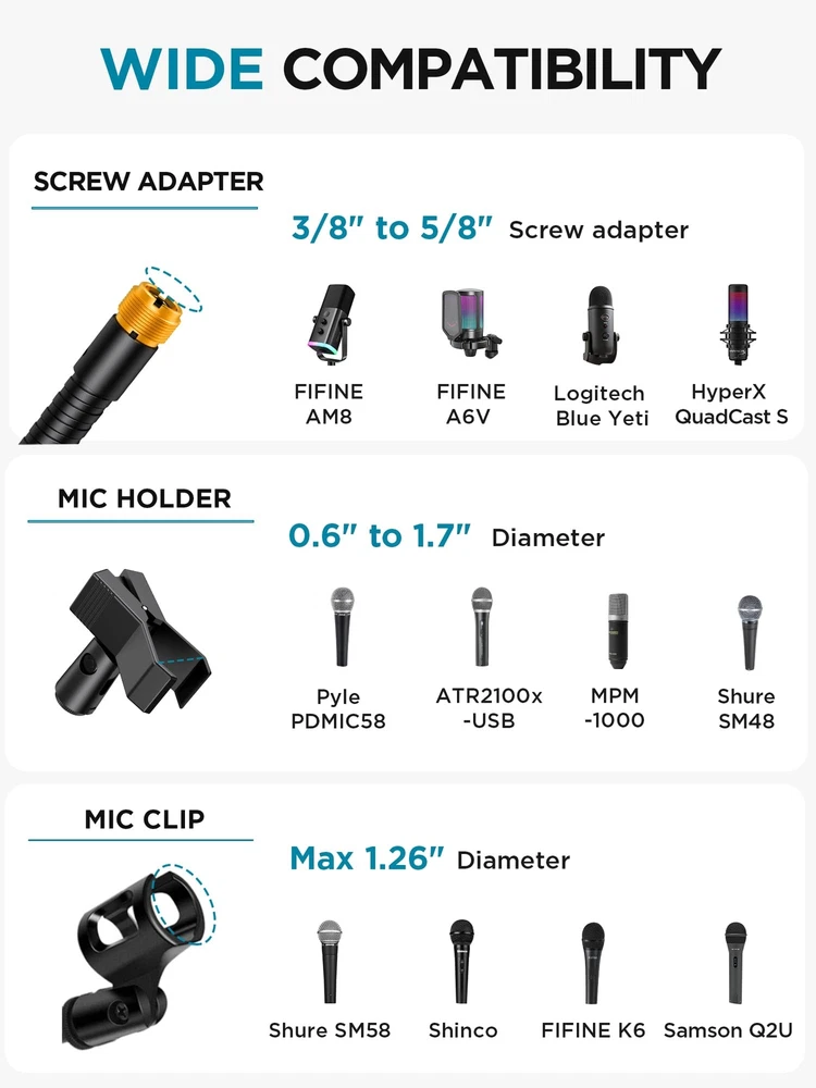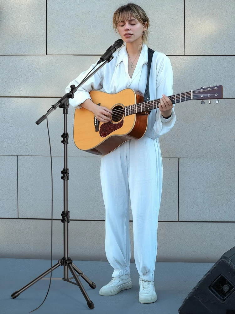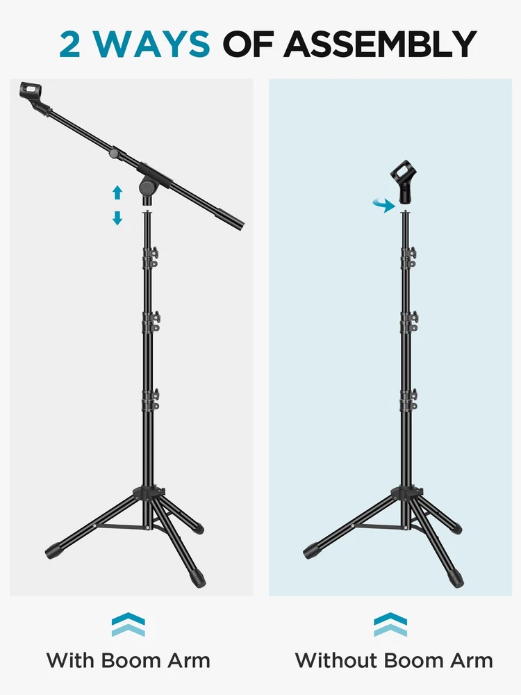 Adjustable Height & Solid: The height of the microphone stand with boom arm is adjustable from 28.1 inches to 89.8 inches by adjusting the knobs, perfect for people in all age groups. It features upgraded supporting structures for better load-bearing capacity, holding your microphone in position. Steady Tripod Stand: The high-quality thickened steel poles enhance the exceptional stability and durability of this mic stand. Compared to other lighter stands that are easy to tip over, our mic tripod stand is as heavy as 4.0lbs, serving indoor and outdoor use. Flexible & Detachable Boom Arm: The boom arm of the stand is adjustable from 16 inches to 30 inches in length and it can rotate 360° horizontally as well as up to 180° vertically. You can choose the best angle and length of performance by easily adjusting the knobs on the boom arm. Remove the boom arm and attach the mic clip, then you can also use it as a straight mic stand. Portable Carrying Bag: The package comes with a premium carrying bag and the floor mic tripod stand is easy to disassemble into several pieces which allows it to easily pack into the small carrying bag (19.5”×8.3” ) and fit anywhere, easy to transport and store. Wide Compatibility: Two different styles of mic clips in package are compatible with most types of microphones such as Shure SM58, Shure SM48, Shure PGA48, Samson Q2U, ATR2100x-USB, etc. The included metal 3/8” to 5/8” screw adapter is suitable for Blue Yeti, Snowball, Hyper X QuadCast, SoloCast, Shure SM7B, AT2020, Fifine AM8 and more.