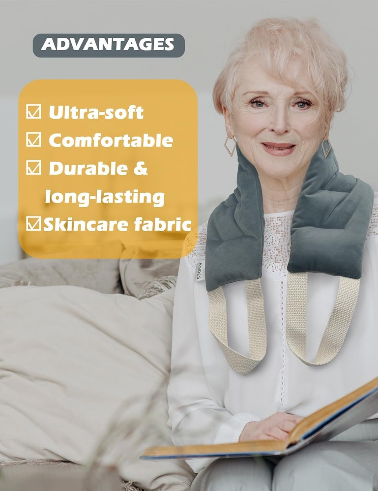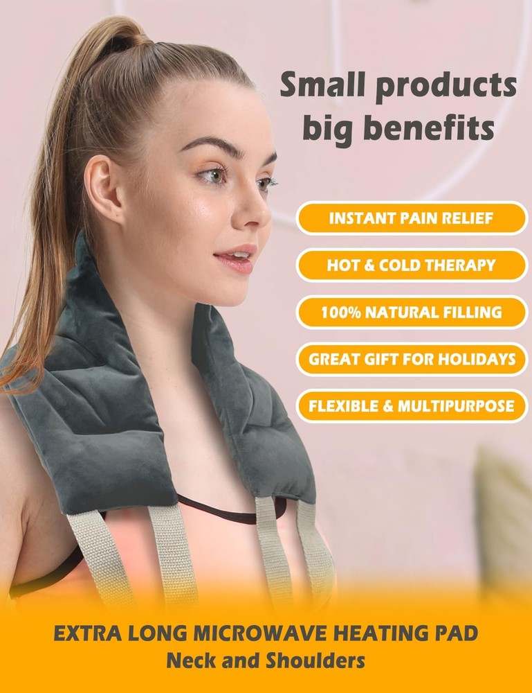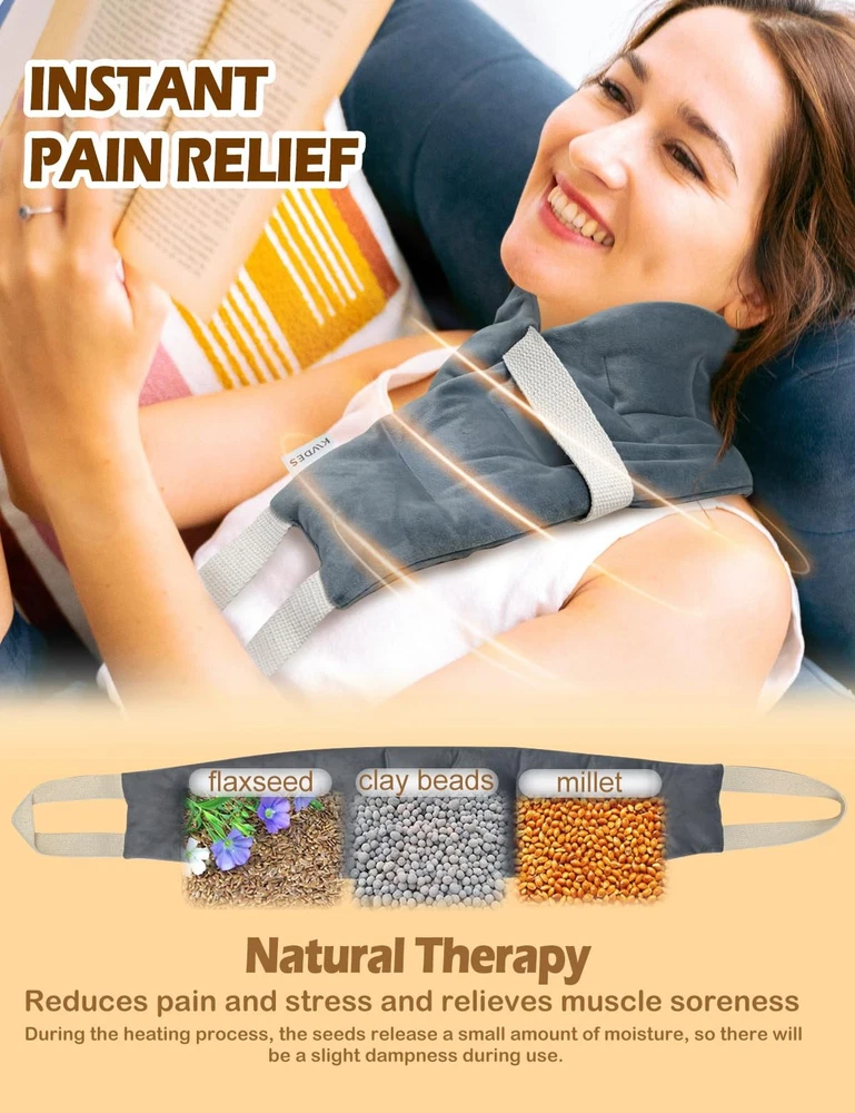 Kivdes Microwavable Heating Pads for Neck Shoulders Pain Relief 33*5.9" Heated Neck Wrap Warmer Microwave Pad Moist Heat for Cramps Back Joints Muscles Warm and Cold Compress Reusable with Handles QUICK PAIN RELIEF: The Neck Heating Pad helps relieve neck, shoulder and back pain. Heating it improves blood circulation while soothing stiffness and soreness. HOT & COLD THERAPY: Moist heat therapy effectively relieves joints, cramps, stiffness, muscle aches, tightness, arthritis, swelling and inflammation, providing deep, penetrating moist heat and improving blood circulation. Cold therapy provides a comfortable cooling sensation and reduces swelling from strains and sprains. No need to worry about medication side effects. EXTRA LONG & FLEXIBLE & MULTIPURPOSE: This microwave heating pad measures 33.44*5.9 inches,1.78LB, which can fit your neck, shoulders and back well. In addition, it is longer than most regular rice heating pads. This microwave heating pad is an amazing multi-purpose heat pack that is soft and flexible enough to fit your body parts and provide calming heat to your neck, shoulders, back, arms, legs, ankles and knees. SECTIONAL CHAMBER & ERGONOMIC DESIGN: Featuring a unique segmented chamber stitching, it helps to fit your body and provide more even and long-lasting heat, and it has two handles that are flexible enough to be applied to any part of your body, providing you with instant relief from aches and pains. 100% NATURAL FILLING & DURABLE: Our heating pads are filled with flaxseed,millet and clay beads, these natural ingredients have the effect of keeping you warm for a long period of time, no matter where you are, this heat pad will keep you warm and relax you. In addition, the heat neck cover is made of skin-friendly fabric. It can withstand high temperatures and retain heat. Durable enough to withstand frequent use. GREAT GIFT FOR HOLIDAYS: Our microwave heating pads, either on their own or in a value pack, make a beautiful gift for any occasion. Give someone you care about a gift that keeps on giving. Every time they use it to relieve neck, shoulder, lower back, knee pain or cramps, or if they want to feel comfortable, they'll know you care through our neck and shoulder heating pad.
