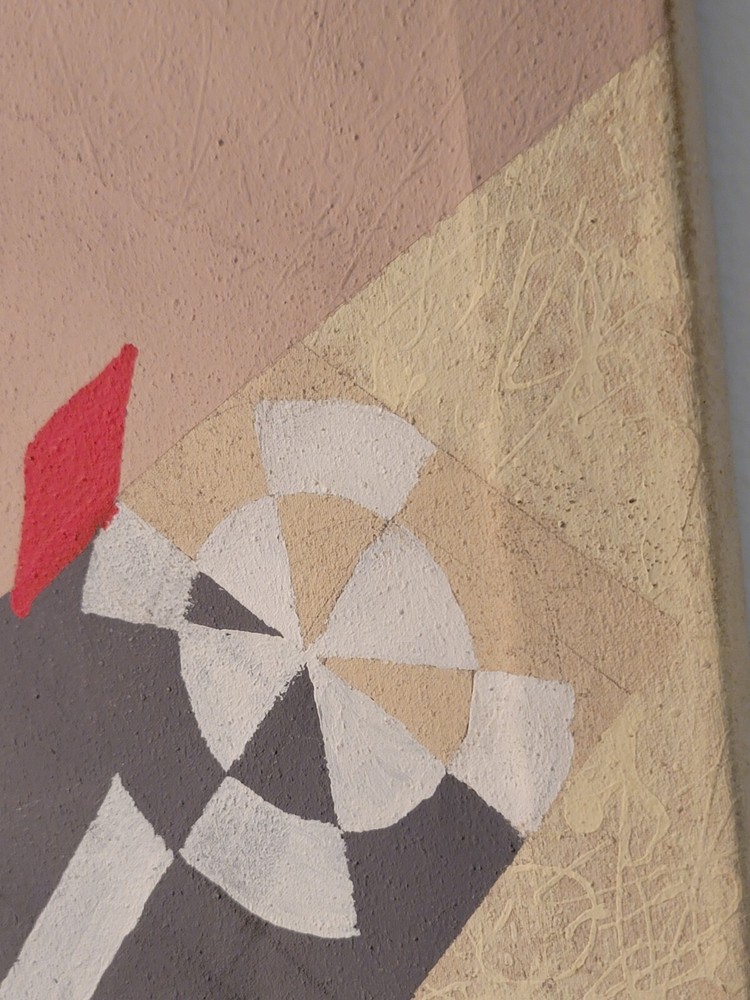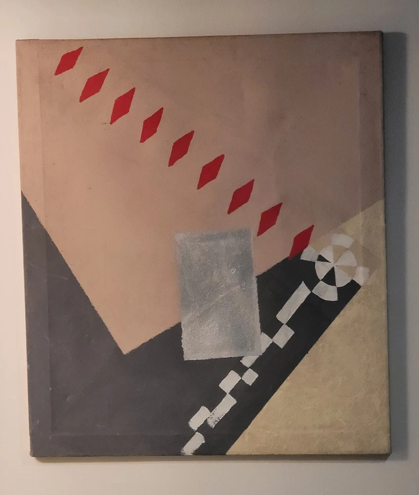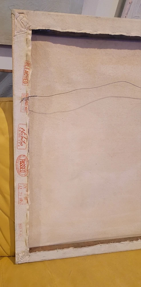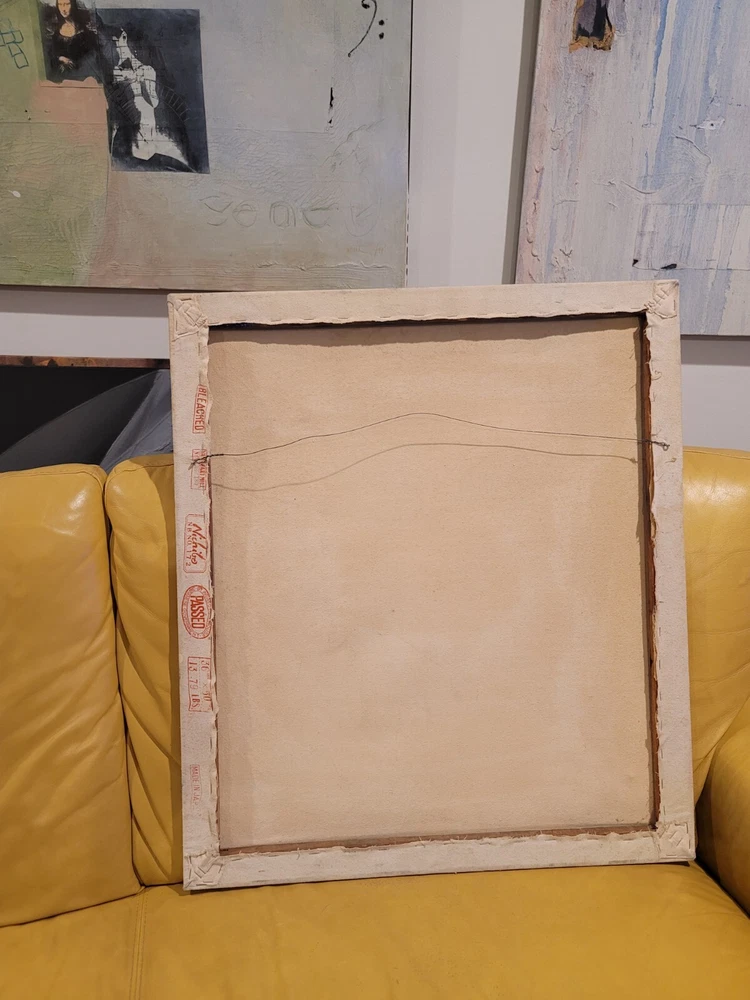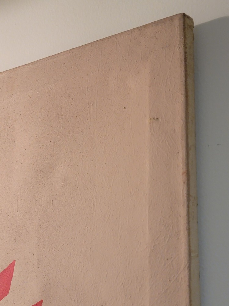 Sometimes you just see something that jumps out and speaks to you as being very special immediately. Sometimes you have to bond with the art to absorb its power and significance. The latter is the case with this very vintage abstract modernist painting from Palm Springs. Although it is unsigned and the artist is unknown to me, there is no question in my mind but that this one belongs in the Whitney or The Broad or in a prestigious Japanese museum of modern art. The intriguing vintage stamps on the canvas are very puzzling to me and add to the intrigue and mystery of the piece, but I am sure art experts will quickly recognize their significance to the painting. The canvas measures 26 x 35 inches and is in exactly the good vintage condition you would expect for a treasured painting appreciated and much enjoyed for so many years, as shown in the photos. The painting exudes hints of Kandinsky and the avant-garde artists of the period, but seems to be a bit more minimalist to have been one of his.