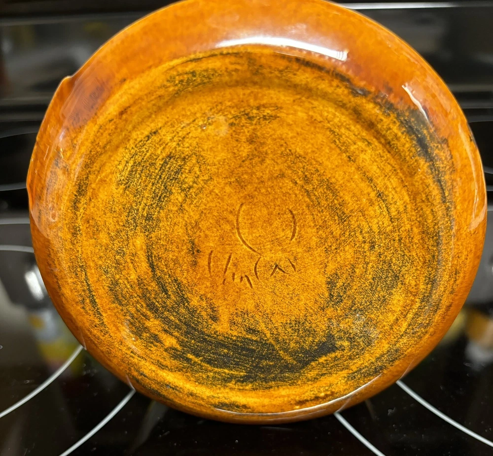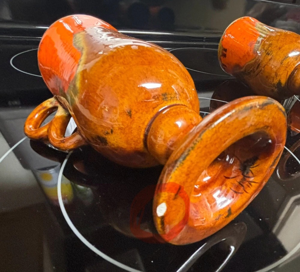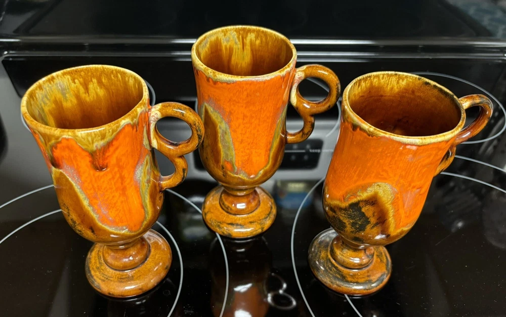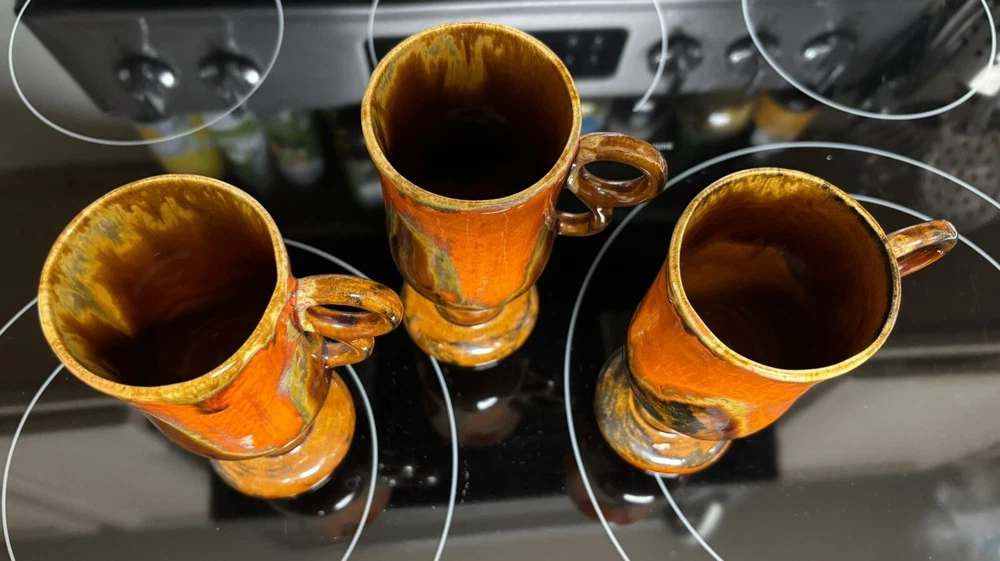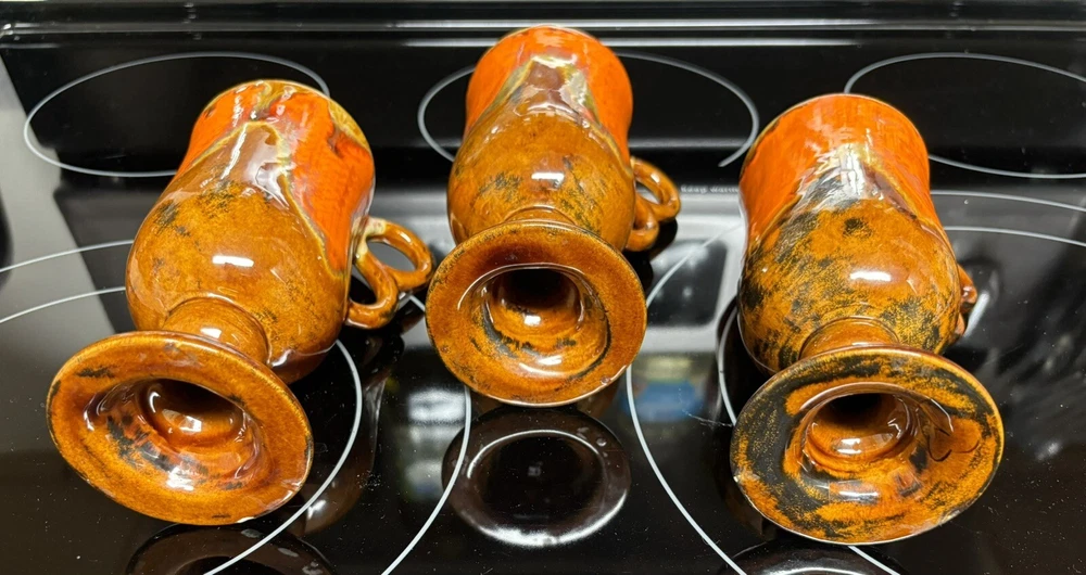 Elevate your home decor with this mid-century modern drip pitcher and pedestal mugs set. The brown and orange color combination, along with the footed pedestal design, adds a touch of vintage charm to any occasion. The glossy finish and art pottery production style make this set a unique and original addition to your collection. The unmarked brand and country of manufacture add to the mystery and allure of this set, while the three-footed pedestal mugs provide a sturdy and stylish way to enjoy your favorite beverage. Whether you're hosting a dinner party or enjoying a quiet evening at home, this ceramic set is sure to impress. Small chip on bottom of one of the mugs, see pictures. Pitcher is 9.25” high.