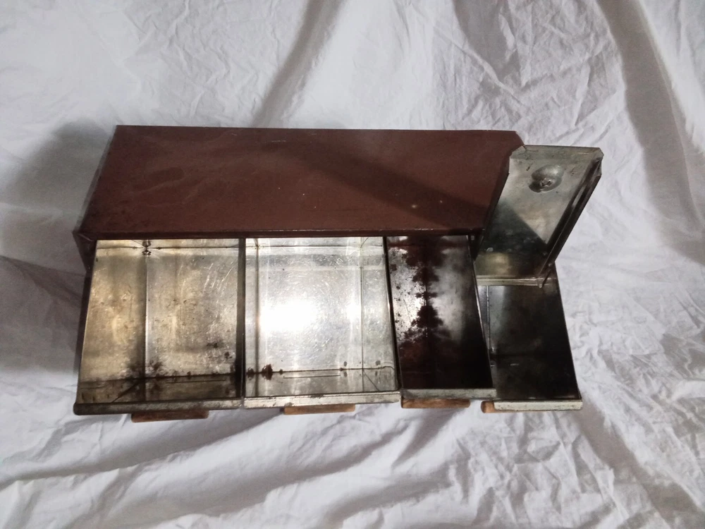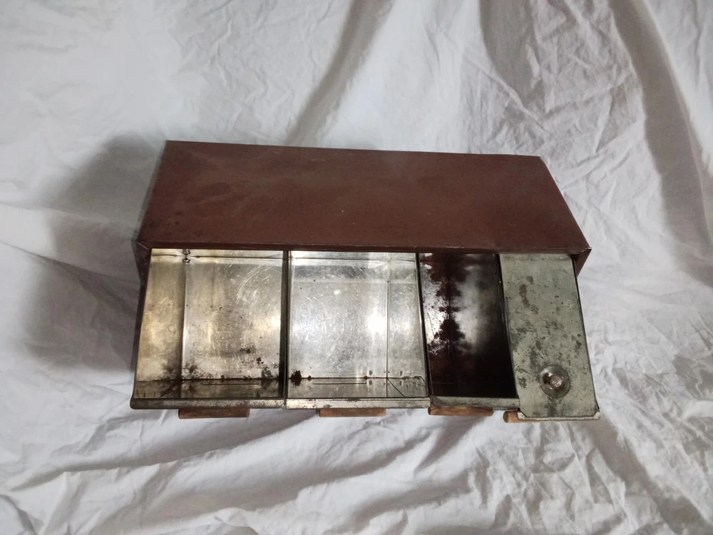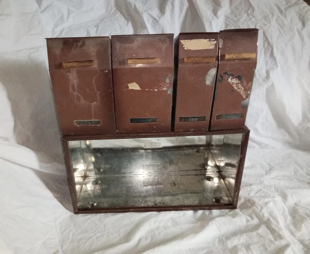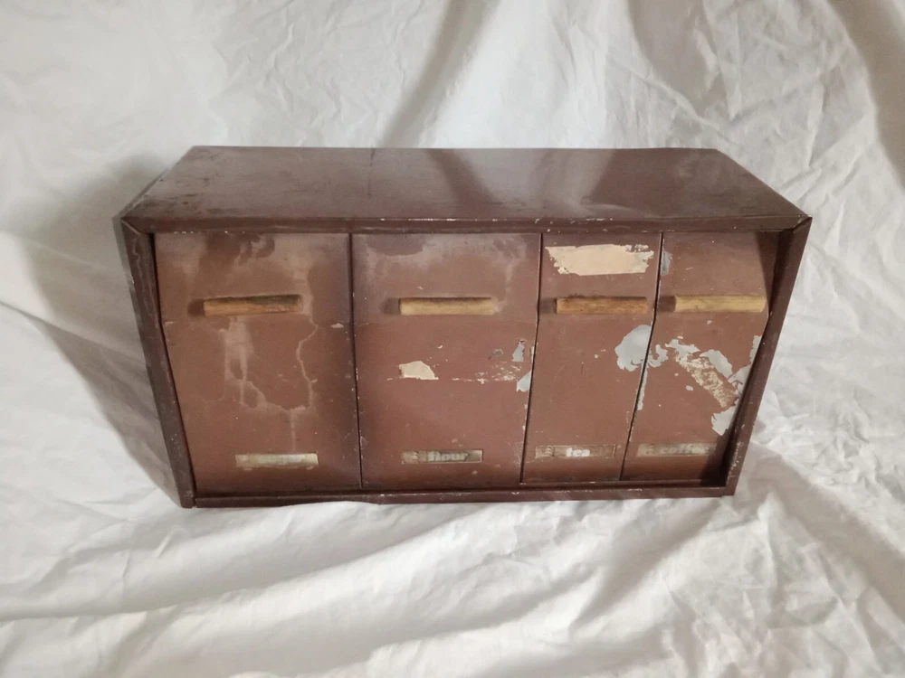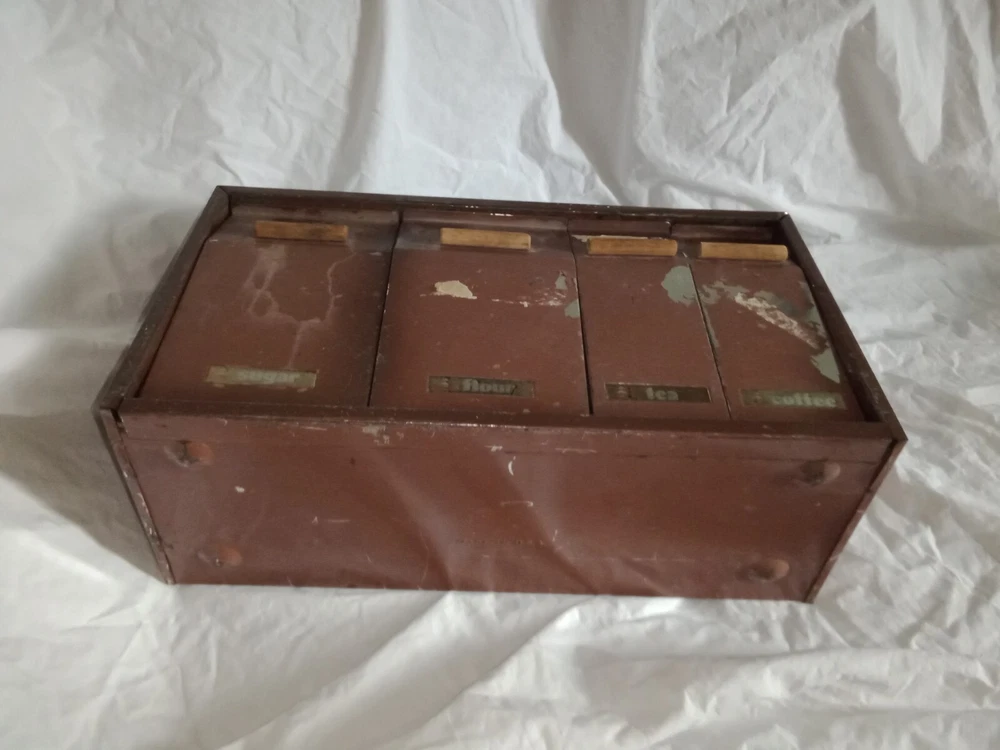 Mid Century Flour Sugar Coffee Tea Container Box Storage Metal Kreamer Ware USA. The measurements are 9" tall, 16 5/8" long, 6 1/4" wide. It could use a new paint job and decals, see photos. It has holes on back for mounting to the wall or it can sit on the countertop. Some surface rust on inside of containers, see photos. Wood handles are cute.