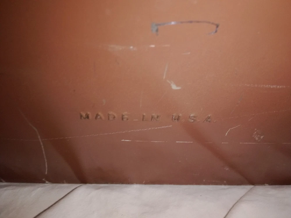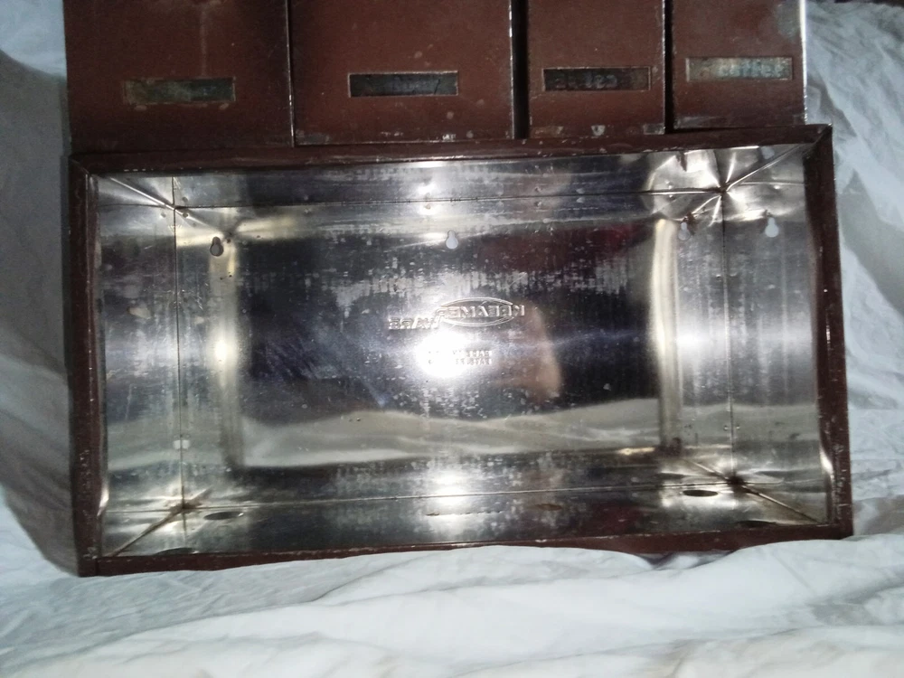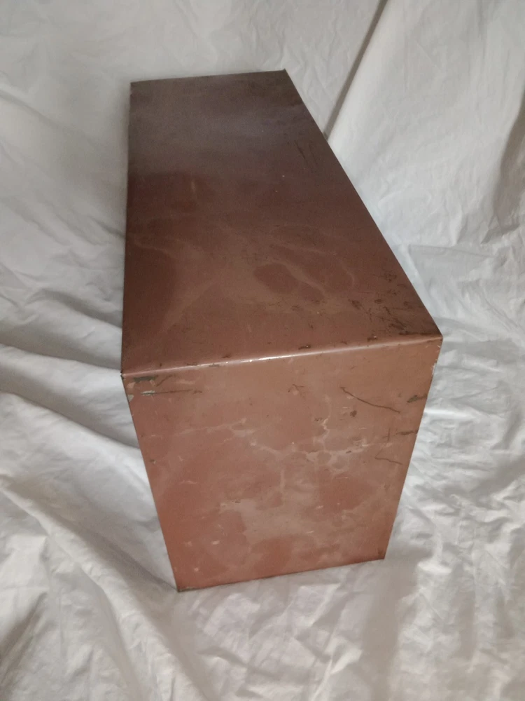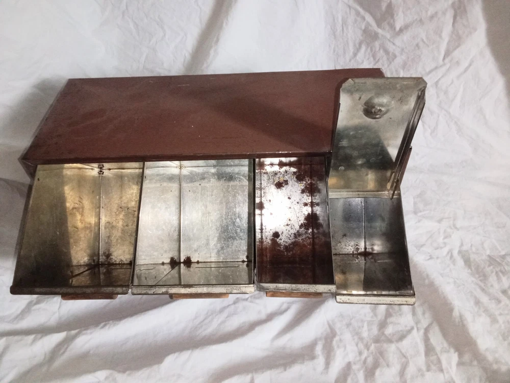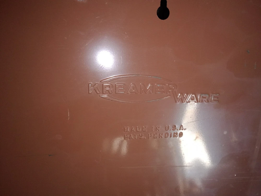 Mid Century Flour Sugar Coffee Tea Container Box Storage Metal Kreamer Ware USA. The measurements are 9" tall, 16 5/8" long, 6 1/4" wide. It could use a new paint job and decals, see photos. It has holes on back for mounting to the wall or it can sit on the countertop. Some surface rust on inside of containers, see photos. Wood handles are cute.