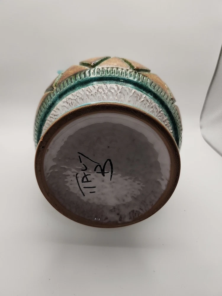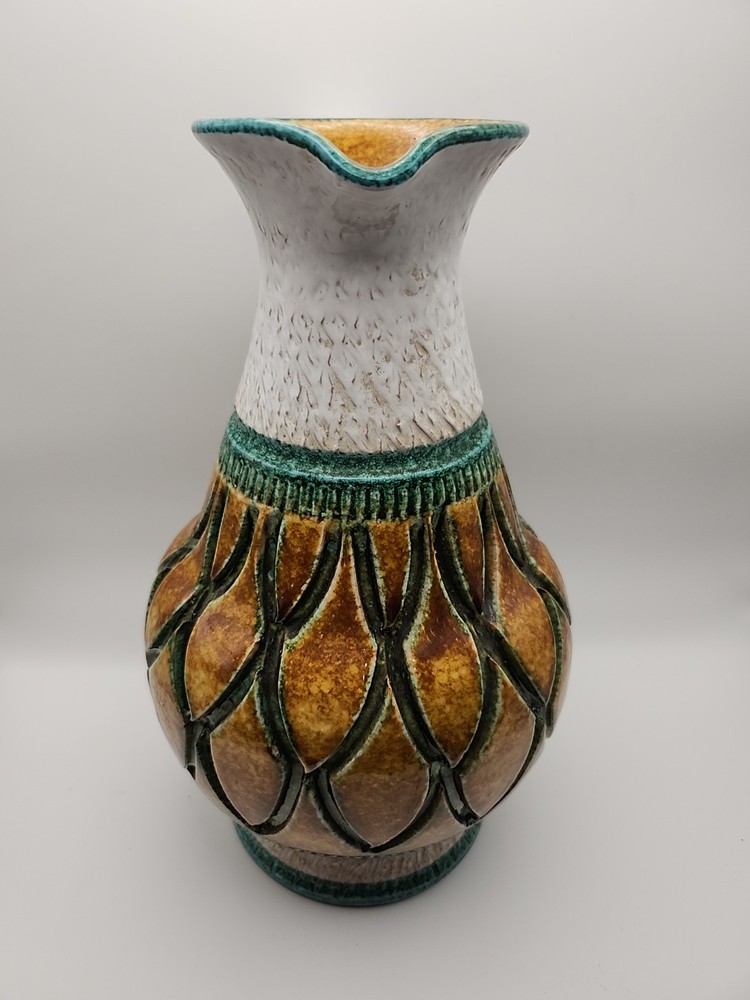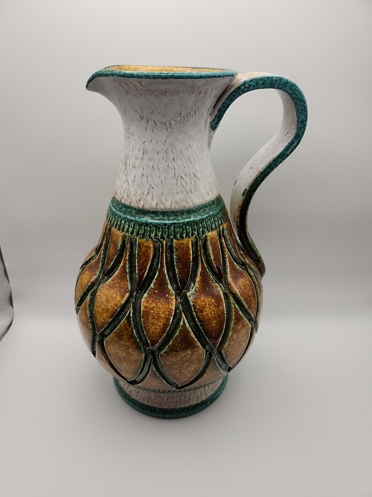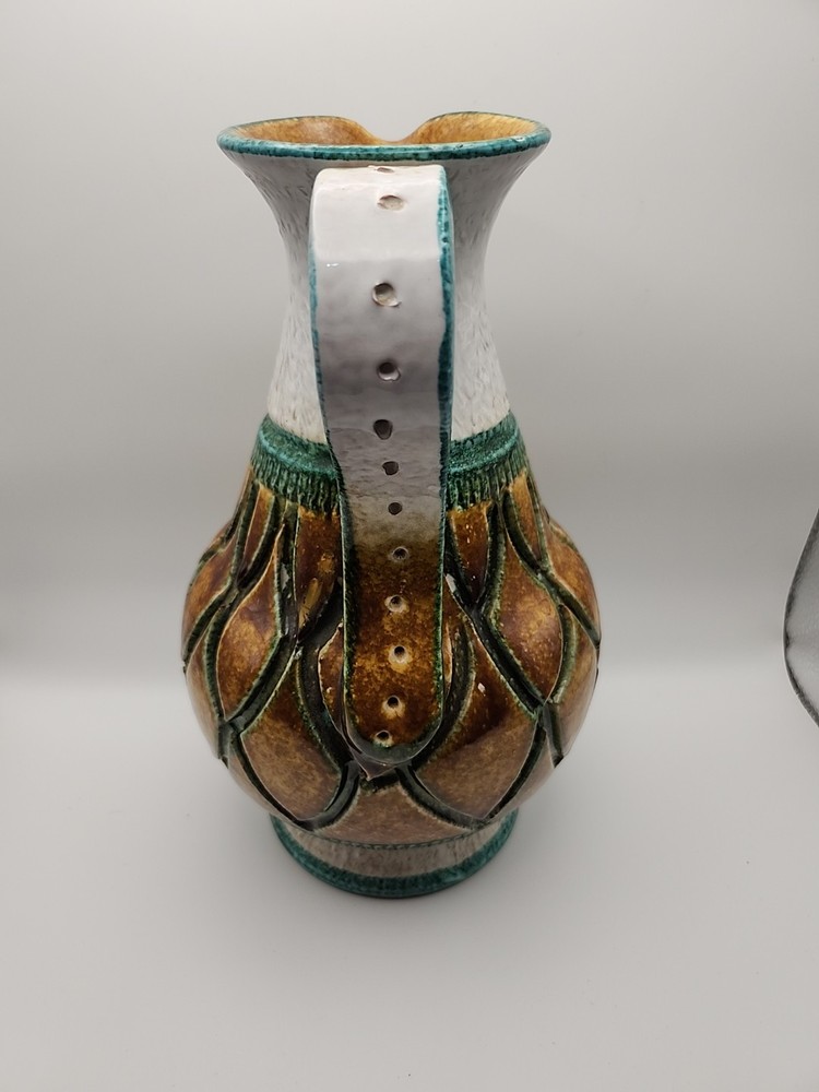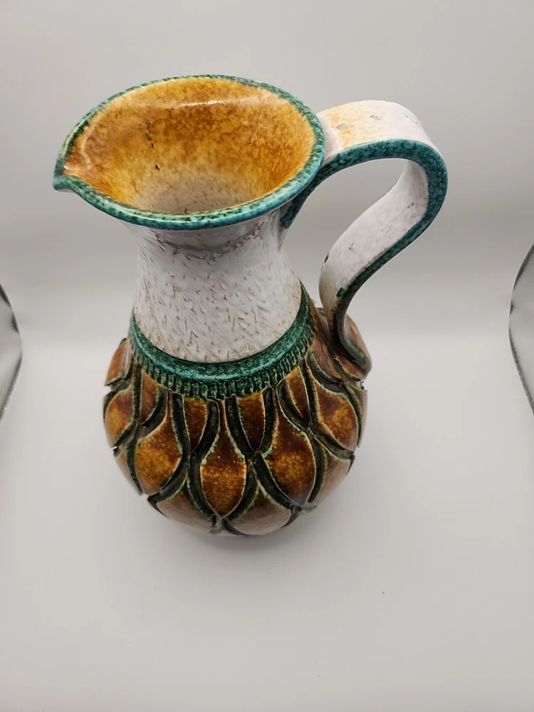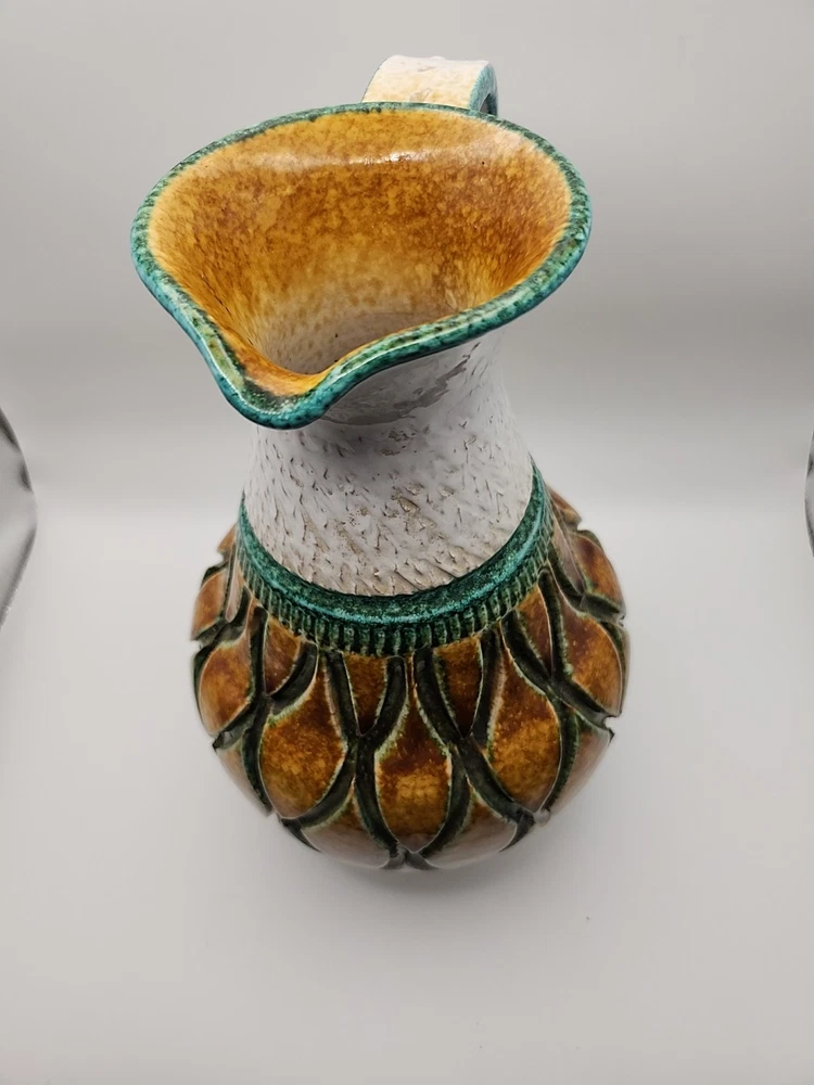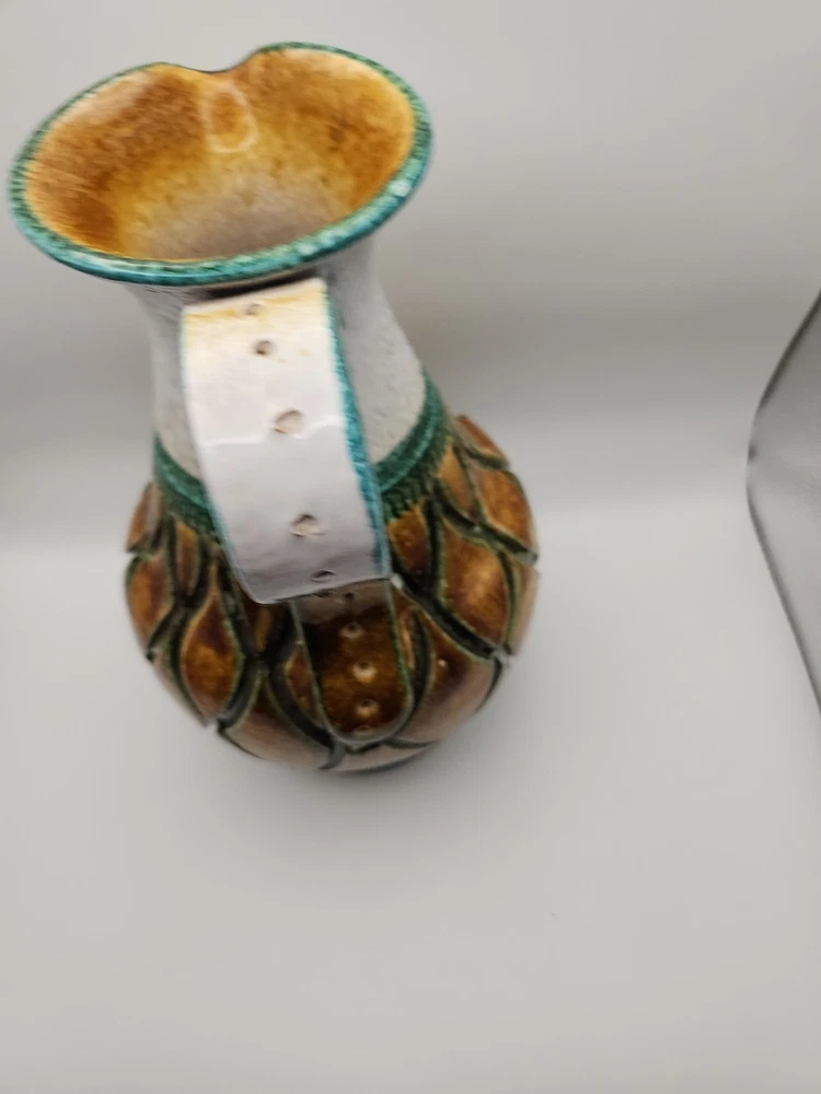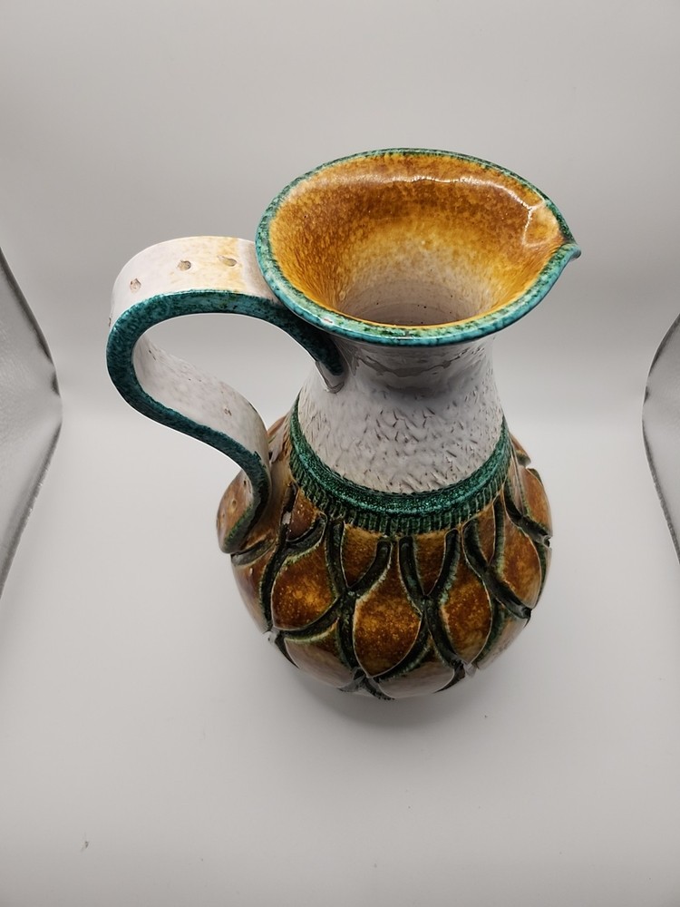 Please see the photos for conditions. Has 2 small chips you can see in the photos one in the bottom and the second you really have to look at it to see it. This Mid-Century Modern Italian Majolica Glazed Pottery Pitcher features a colorful multicolor design characteristic of Majolica pottery. Made in Italy, this pitcher is crafted from terracotta using traditional pottery techniques. The pitcher has a classic shape and style typical of Mid-Century Modern design, making it a unique and stylish piece for serving beverages or as a decorative accent in any home.