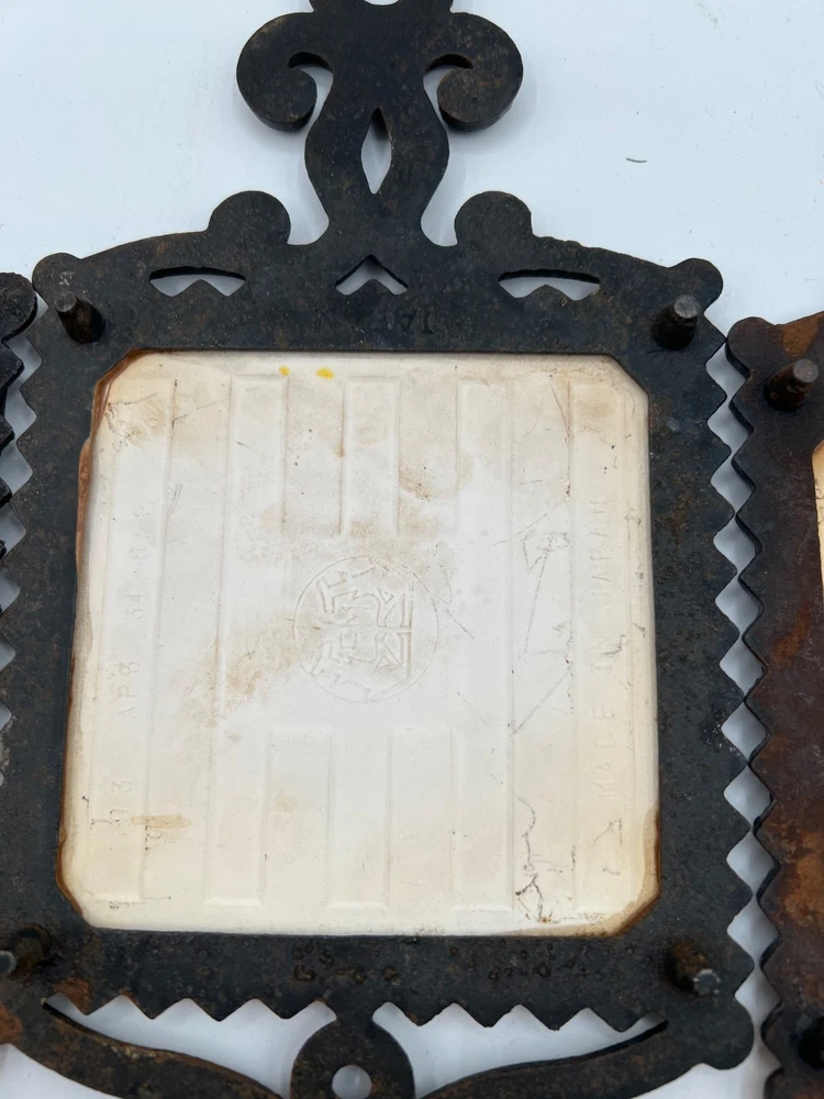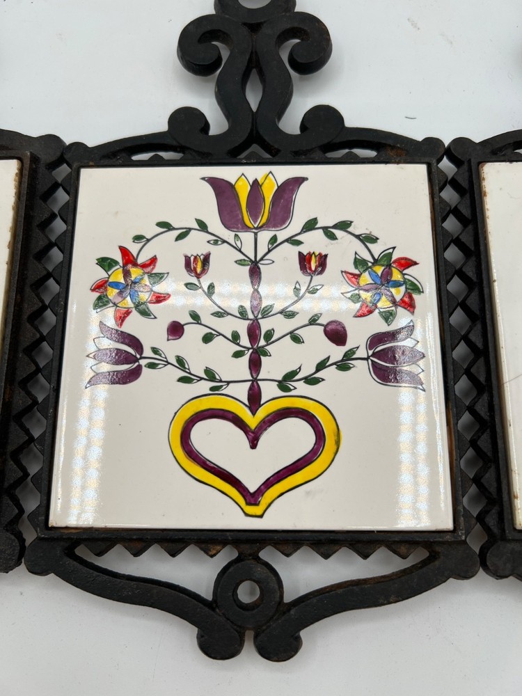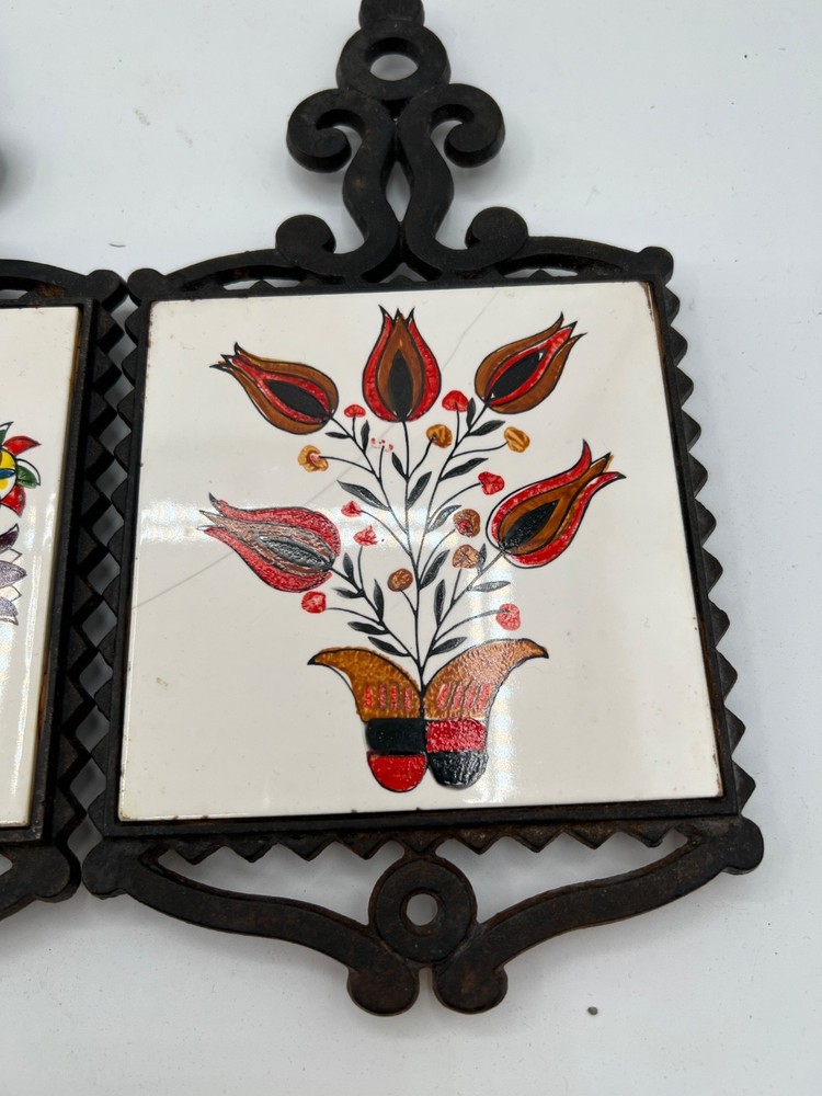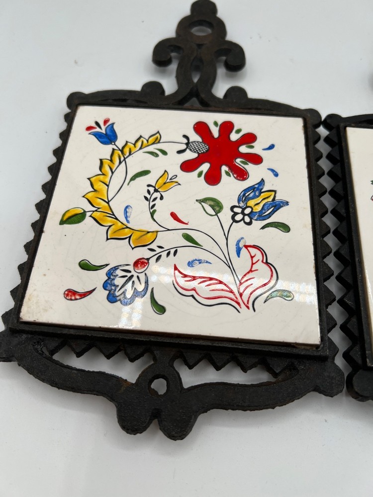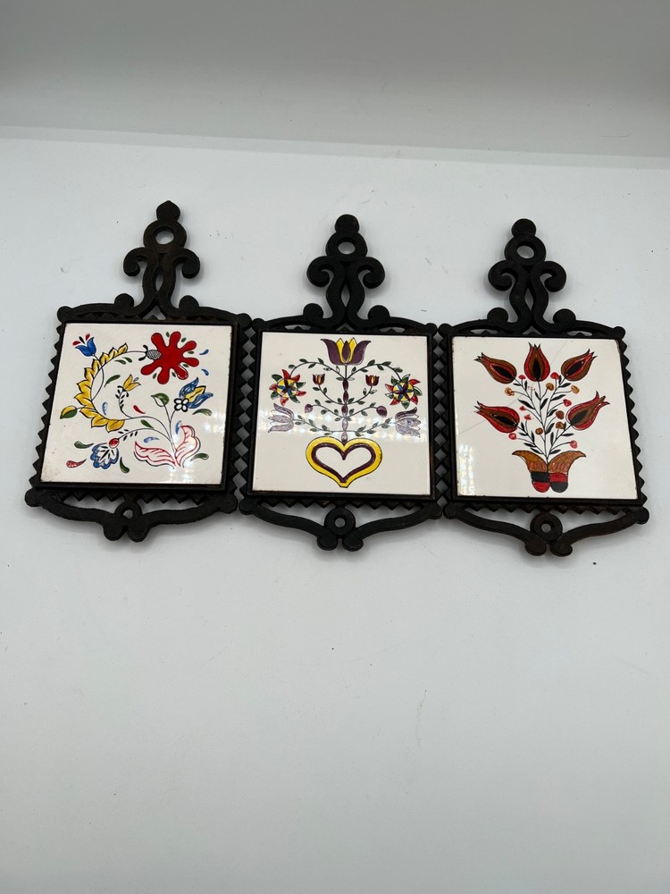 This Mid-Century Modern Tile Trivet features a square shape with a floral pattern in a Scandinavian cottage style. Hand-painted in ceramic with a glazed finish, this unboxed piece is signed and suitable for tiles. The multicolor design, measuring 9.5" x 5", is perfect for all occasions and can be used in any room of the home. Made in Japan during the 1960s, this unique collectible adds a touch of artistry to your space with its charming folk art appeal. set of 3