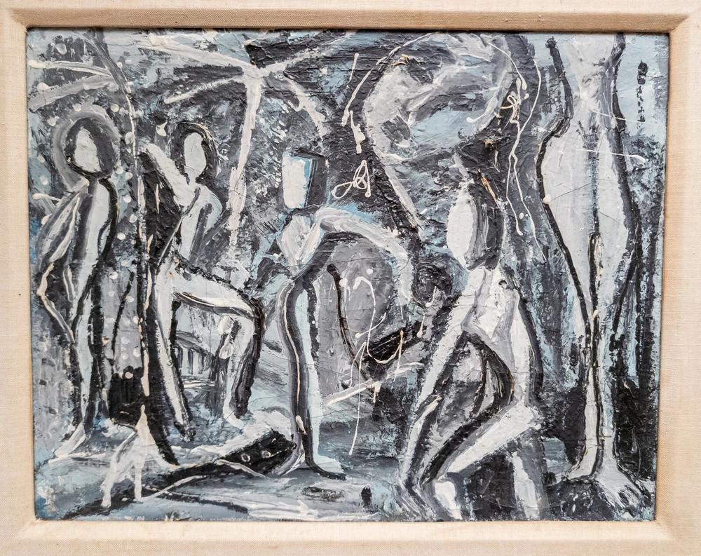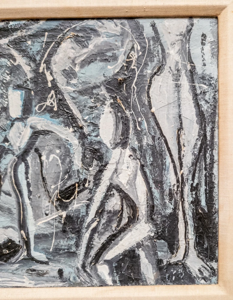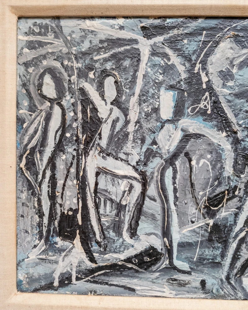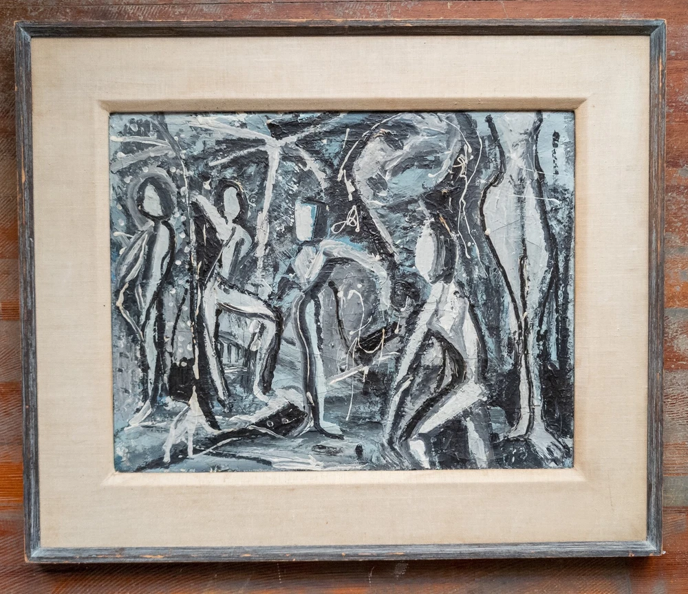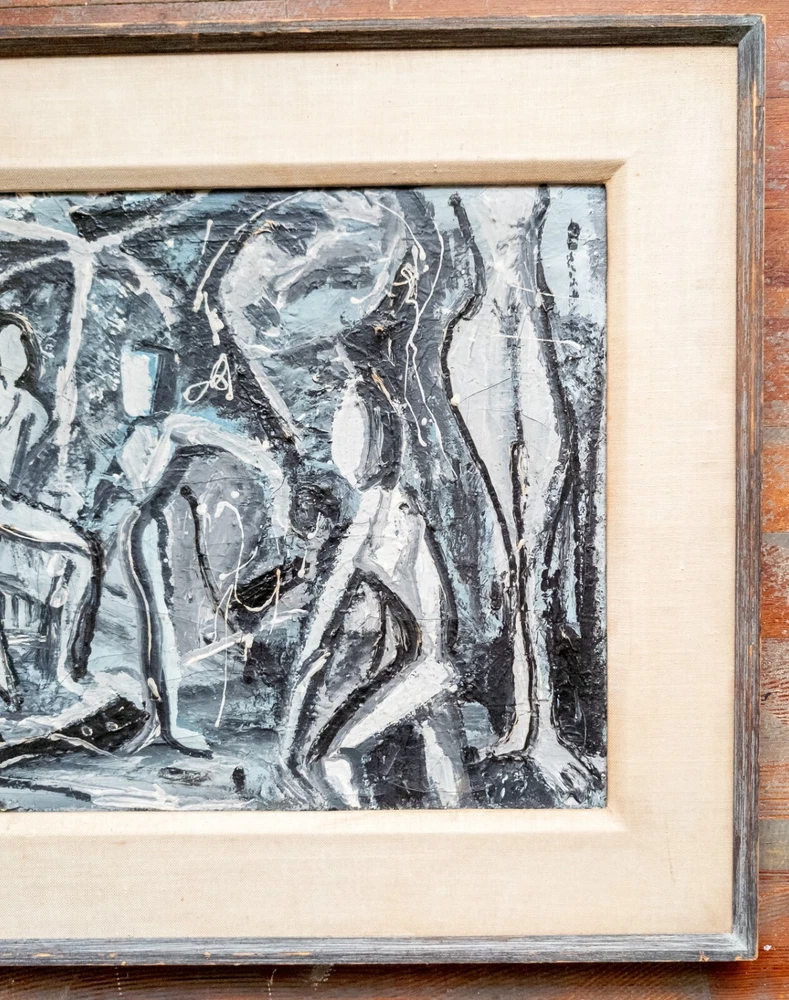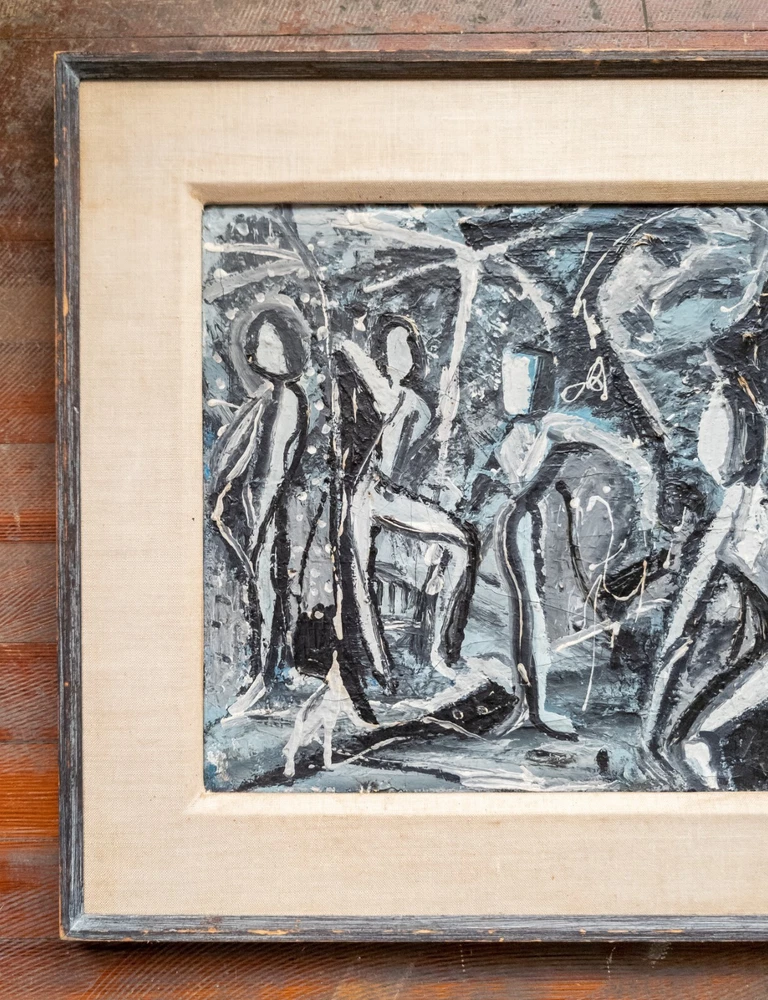 Abstract We are selling this cool Mid Century Modern abstract painting. This painting has great look with grisaille palette of black and gray and white to create contrasts of dancing figures. The painting is unsigned and probably dates to the 60s or 70s. Condition: Good vintage condition. Dimensions: Height 21 3/8 Inches 54.4 cm Width 25 1/2 Inches 64.8 cm Depth 1 1/8 Inches 2.9 cm Sight Height 14 1/8 Inches 36.0 cm Sight Width 18 1/4 Inches 46.4 cm Some items we offer have age and wear, this wear due to age may include breaks, repairs, repainting, or restoration, we try to call this damage as well as possible but please refer to the photography for a full description. We try to identify and describe our items to the best of our ability however we are not experts and our estimates of age, period or attribution should be taken as speculation and not fact.Our descriptions are solely there to assist buyers finding the items and are not an accurate description of the item in all cases. Ultimately the pictures we take serve as our description. This fine antique is offered with a fair and reasonable fixed price, I trust my descriptions and photos detail this item to justify the asking price. If you do need information I have neglected to include, make an offer, or additional photos, please don't hesitate to ask, I will do my best to comply. If you desire to have your purchases insured, I am happy to do so if you request it. If you do not instruct me to insure for you,my responsibility will end when the USPS delivers to your mail service. Good Luck! Thank you for looking!