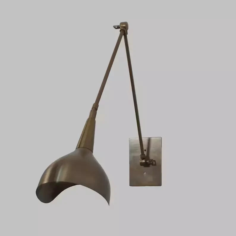 Materials: Brass Width: 5 inches Height: 16 inches Depth: 25 inches Beautiful Style Single metal shade brass sputnik articulated wall lamp. Expertly made by a specialised workshop in mid-century modern design, every aspect of this lamp is meticulously crafted to match the hard-to-find lamps from the 1950s. Its versatile nature makes it perfect for placement on the side of a fireplace, giving light to a console or kitchen island, or illuminating a reading sofa. Customization of this fixture is available so please contact me if you need any customization. Specification : Width : 6" Arms Size : 15" and 12" arms depth : adjustable Height : adjustable" Dimmable : Yes Bulb Included : No Socket Type : 1 x E26 120 voltage bulbs are required for US & Canada (not included). 1 x E27 240 voltage bulbs are required for UK & Europe (not included). Available Finishes are : Polished Brass Brushed Brass Polished Chrome Brushed Chrome Raw Brass Antique Patina Black Brass Blackend Brass Matte Black