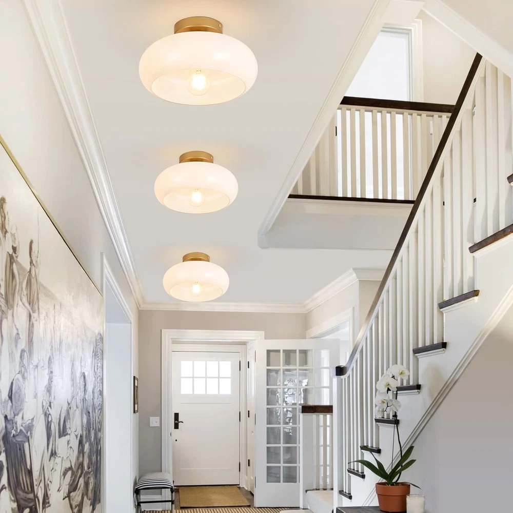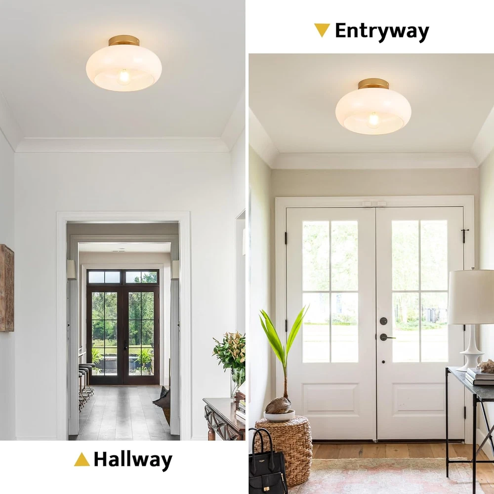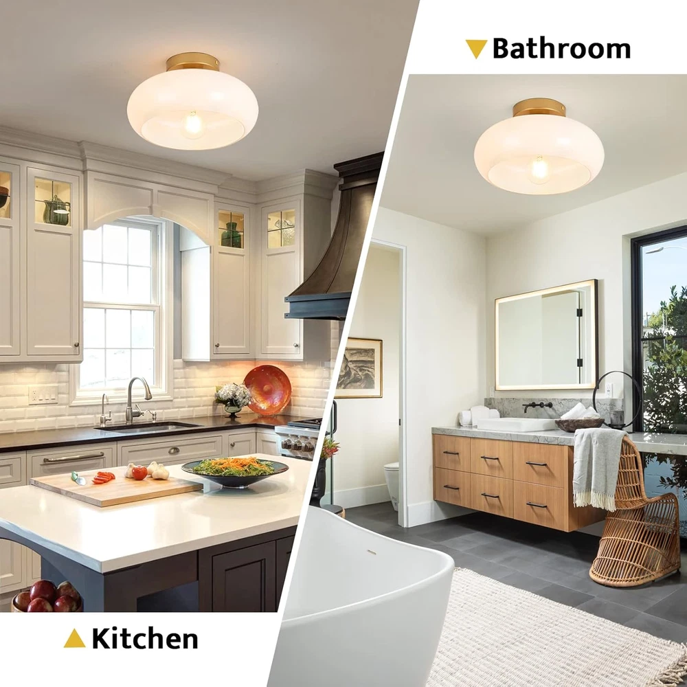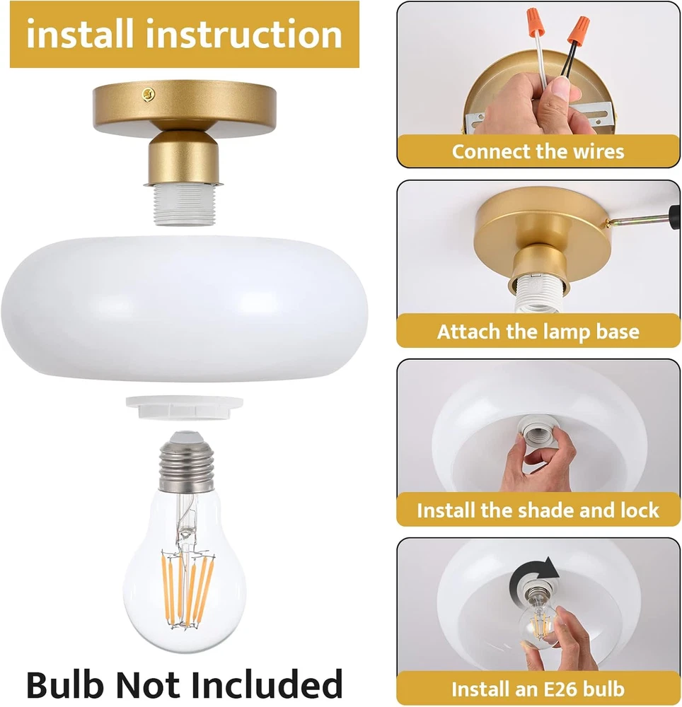 Store New Arrivals Add to Favorite View Feedback Contact Mid-Century Modern Gold Semi Flush Mount Ceiling Light, Kitchen Ceiling Light Fixture with Glass Shade, Vintage White Close to Ceiling Lamp for Entryway Hallway Bathroom (11.0 Inch) Description Item model number Ceiling Lamp Light Source Type LED, Incandescent ,Halogen Style Mid-Century Modern Number of Items 1 Power Source AC Fixture Type Non Removable Number of Light Sources 1 Control Method Touch Embellishment Hallway Light Fixtures Ceiling Theme Modern Flush Mount Ceiling Light Batteries Included? No Lighting Method Downlight Specification Met High Quality Controller Type Push Button Unit Count 1.0 Count Room Type Entryway,Home, Offices , Coffee Shop, Laundry Room, Bathroom, Kitchen, Bedroom, Hallway Assembly Required No Switch Type Not included Product Dimensions 7"L x 11"W x 11"H Material Glass, Iron, Metal Installation Type Semi Flush Mount Model Name Mid Century Ceiling Light Finish Type Lacquered Specific Uses For Product Indoor use only Indoor/Outdoor Usage Indoor Brightness 800 lumen Country of Origin China Light Color Warm white, Cool white Water Resistance Level Not Water Resistant Batteries Required? No Warranty Type Limited Item Weight 3.16 pounds Light fixture form Close to Ceiling Special Features Dimmable Special Feature Dimmable Part Number Ceiling Light Shade Color White Mounting Type Ceiling Mount Color Gold Wattage 60 watts Bulb Base E26 Shape Round Voltage 120 Volts Recommended Uses For Product Indoor Shade Material Glass Finish types Lacquered Included Components Shade Size 11.00 in Mid-Century Modern Design: This white semi flush mount ceiling light features a frosted glass shade and a brushed brass metal base. The open shade design makes it easier to clean and change bulbs Dimensions: The glass shade measures 11 inches in both length and width. This compact and elegant ceiling light is ideal for areas ranging from 35 to 75 square feet Applications: Perfect for bedrooms, entryways, bathrooms, kitchens, hallways, and more E26 Bulb: Thissemi flush mount ceiling light is compatible with E26 bulbs, with a maximum wattage of 60W. It works with LED, halogen, CFL, or incandescent bulbs, though bulbs are not included Dimmable: The hallway lighting fixtures ceiling is dimmable when used with compatible dimmable bulbs and a compatible dimmer switch, bulbs and switch not included Product Description Woknos Mid-Century Modern Semi Flush Mount Ceiling Light fixture Woknos Lighting, Making Every Home a Desirable Place to Live in. Milky White Glass Shade This entryway light fixture features a thick and sturdy glass shade which appears to be of high quality. The white glass shades the glaring lighting creating a great softened and warm look to your home while protecting your eyes. Sturdy and Stable Canopy The metal base is sturdy, rust-resistant, and rated for damp areas. The semi-flush mount ceiling light is e-coated with a detailed brushed brass finish on the canopy and fixture body, paired with the white glass for a luxe look. Standard E26 Socket This mid-century modern ceiling hanging lamp is suitable for standard E26 sockets such as LED and incandescent bulbs, you can choose different color temperature bulbs and create various atmospheres. Bathroom light fixtures ceiling mount Its elegant round shape and classy brass finish give it a modern yet classic appearance, which makes it a perfect addition to various settings, including living room, bedroom, bathroom, entryway, foyer, hallway balcony, and more. kitchen light fixtures & Bathroom semi flush mount ceiling light &Entryway light Follow our instructions for a fast setup Gold hallway light fixtures About Light Bulbs Compatible with E26 bulbs including LED, Halogen, Fluorescent, or Incandescent bulb (Bulb Not Included). Tip: Please feel free to reach out if you have any problems with our products or the installation process, we will try our best to assist you! Turn on and Turn off Dimmable from 0% to 100% when used with a compatible dimmer(Not Included). Please reach out if you have problems with broken glass shade, don't worry, free of broken glass shade. Light Fixture Add to Cart Add to Cart Add to Cart Add to Cart Customer Reviews 4.4 out of 5 stars 71 4.3 out of 5 stars 128 4.3 out of 5 stars 128 — 5.0 out of 5 stars 1 — Price $39.89 $ 39 . 89 $59.49 $ 59 . 49 $63.99 $ 63 . 99 $65.99 $ 65 . 99 — — Number of Lights 1 1 1 1 1 6 Socket Type E26 LED LED E26 E26 E26 Light fixture form Close to Ceiling Close to Ceiling Close to Ceiling Close to Ceiling Close to Ceiling Chandelier Style Mid-Century Modern Modern Modern Farmhouse Farmhouse Industrial Color Gold & White White Grey Black Gold Black & Gold ABOUT US We offer the best prices around on high quality products. Our E-store includes media such as books, movies, music and games while offering electronics, toys, sporting apparel, clothing, tools, general home, garden items and more. SHIPPING We are always working hard to ensure your package arrives as soon as possible. Please understand that some factors like weather, high postal traffic, and the performance of shipping companies are outside of our control. We offer free shipping to the lower 48 states and ship within 2 business days of payment, usually sooner. We do not accept P.O. Boxes. Please provide a physical address. For shipping outside of the continental USA, we only use eBay's Global Shipping Program.The item is shipped to KY and then sent to the rest of the world. International customers are responsible for all duties and taxes. Continue to check out in order to calculate costs for shipping the item to your country. Messages regarding eBay's Global Shipping Program MUST be directed at eBay EXCLUSIVELY. RETURNS We offer a 30-Day Return Policy on items which you are not completely satisfied with. You have the option for a full-refund or an exchange of the item. No returns are available on items shipped outside of the USA. PAYMENT We accept PayPal. CO